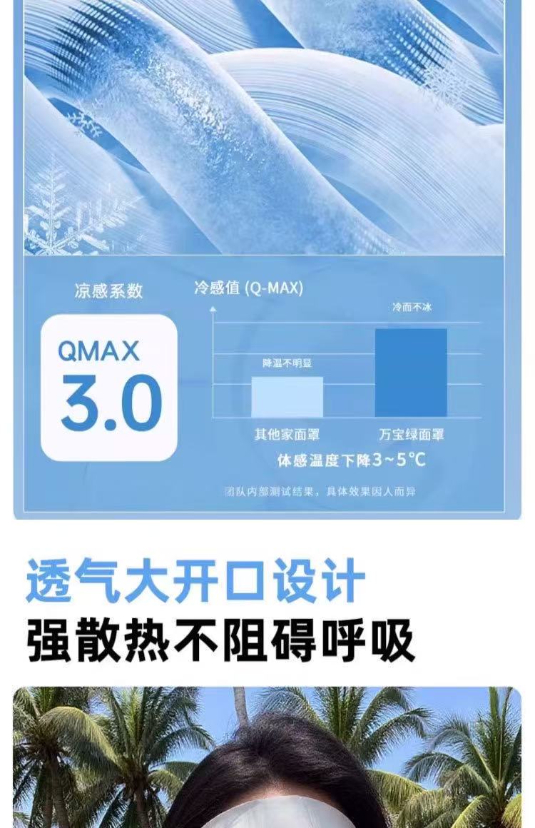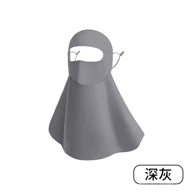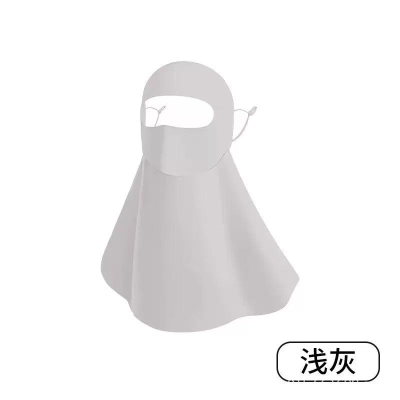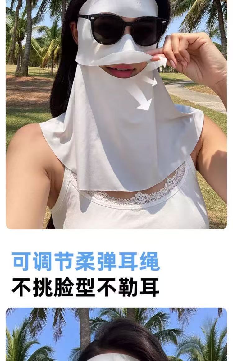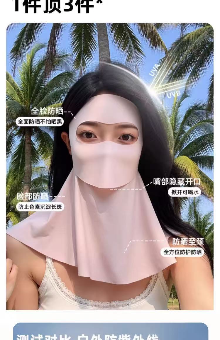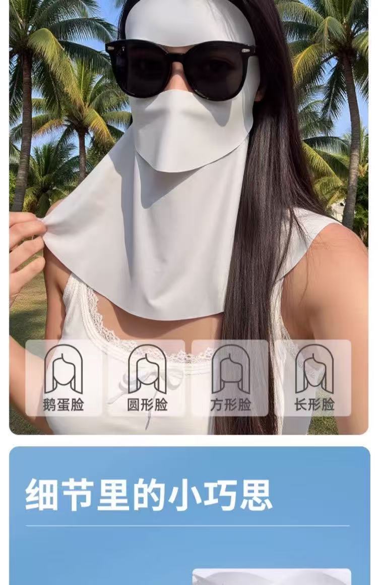 产品卖点: 1.UPF50+、紫外线阻隔≥96%、高科技凉感纤维高2.效隔热、冰凉透气、修饰脸型显脸小、可调节 3.设计隐藏式开口喝水更简便 内隐鼻洞 空气更流畅 4.加长面颈防护 防晒至肩颈 产品面料:冰丝产品尺寸:均码
