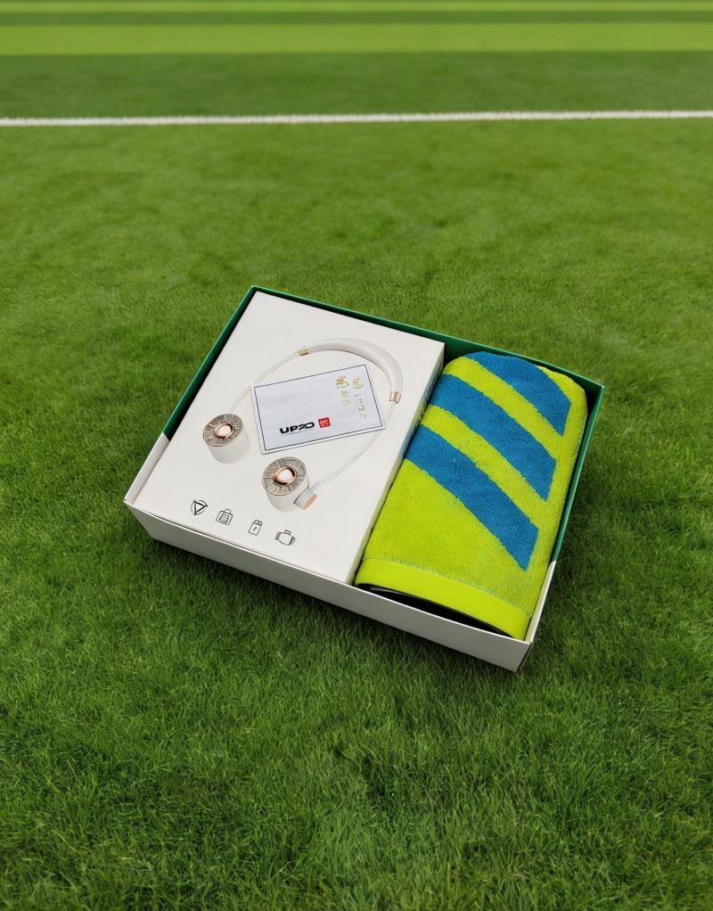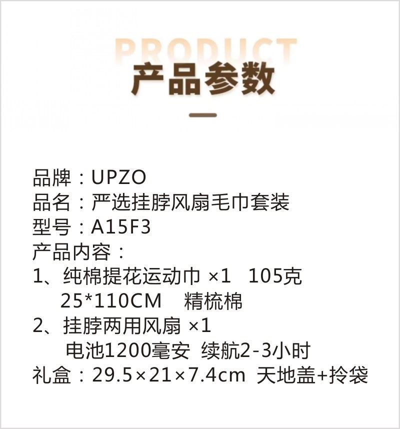 型号:A15F3 产品内容: 1、纯棉提花运动巾 ×1 尺寸:25*110CM 克重:105克 精梳棉 2、挂脖两用风扇 ×1 电池容量 : 1200毫安 续航2-3小时 礼盒:29.5×21×7.4cm 天地盖+拎袋 纯棉提花运动巾精选精梳棉材质结合色织工艺 优质美观 挂脖风扇 1200毫安 3档可调 挂脖设计解放双手