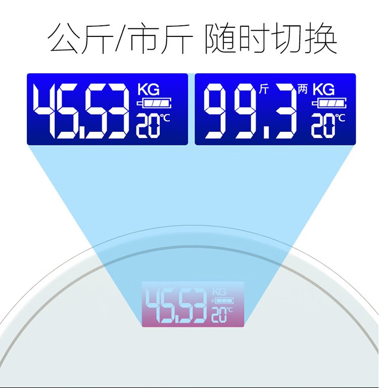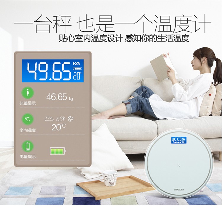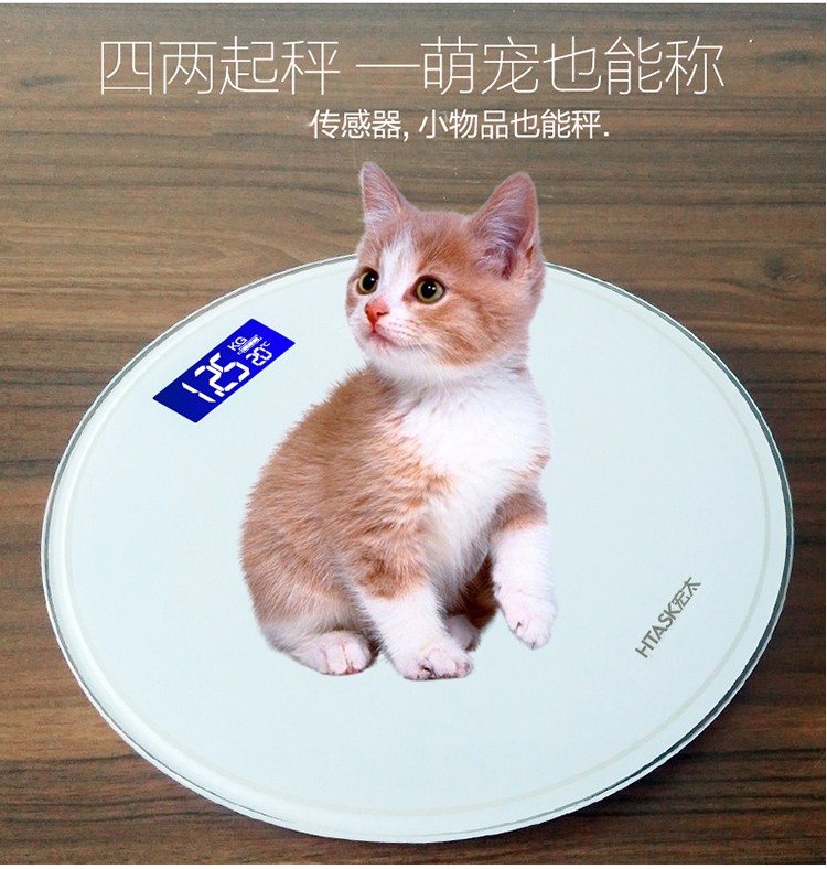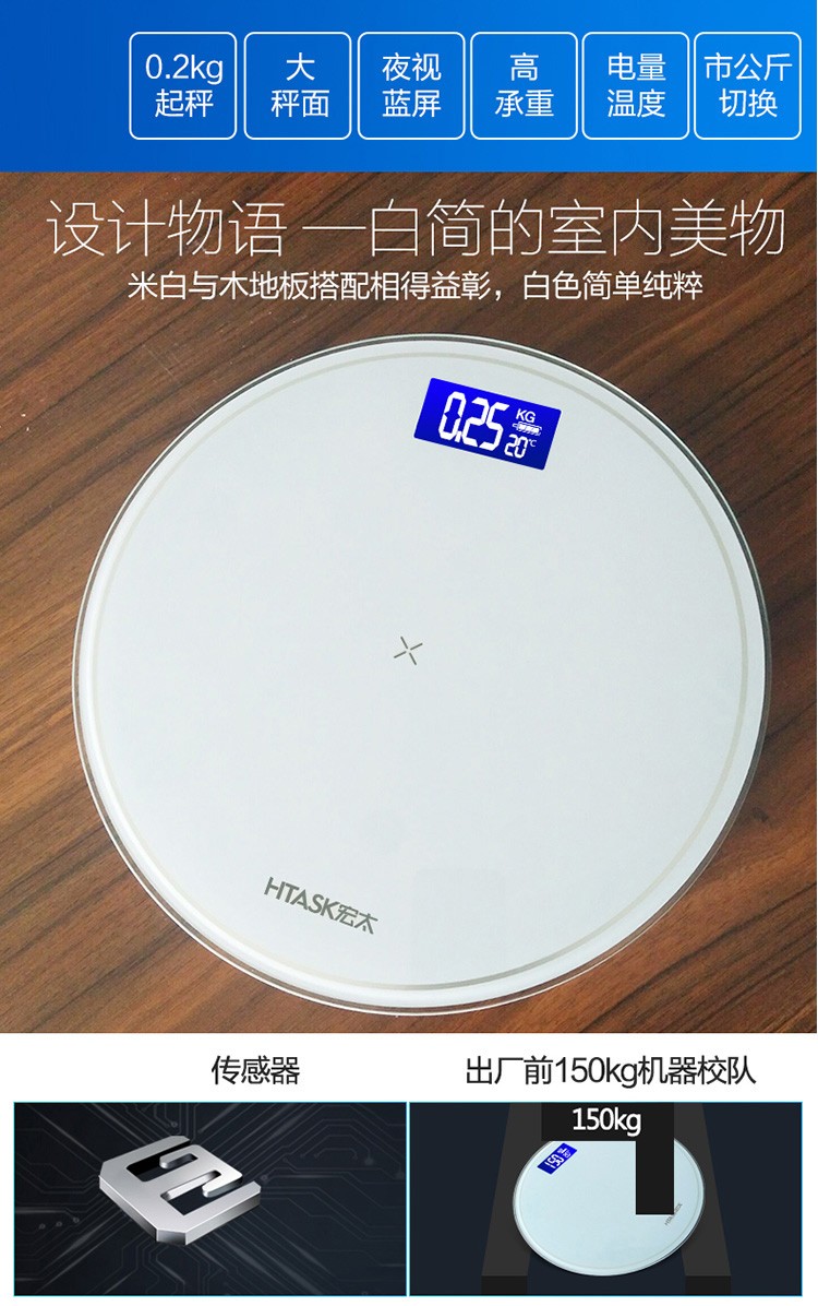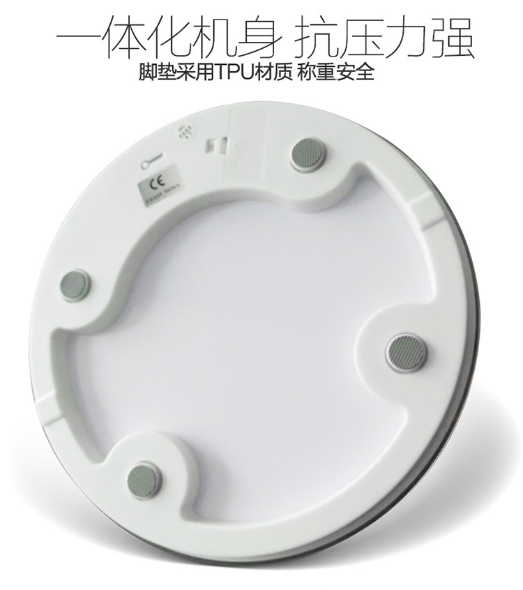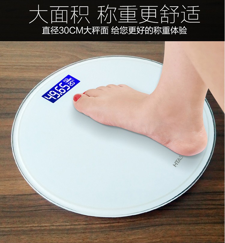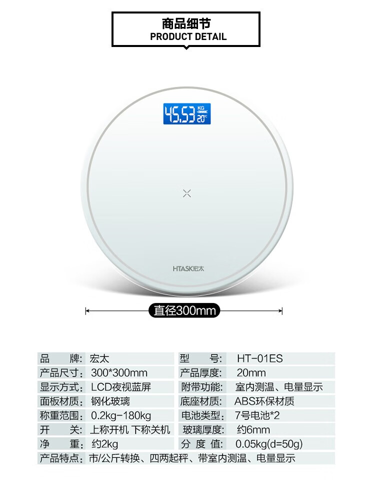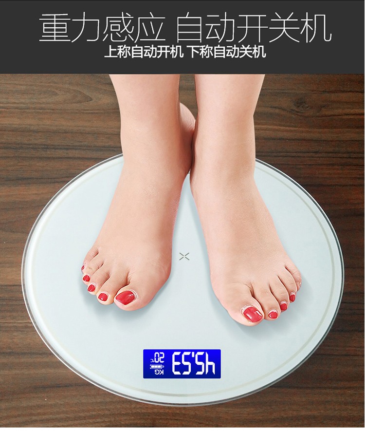 颜色:白色 材质:钢化玻璃 屏显:液晶屏显 尺寸:直径30cm 产品包装:牛皮纸盒包装液晶带温度显示电子秤,家用体重秤0.2KG起称,市公斤切换,直径30CM大秤面给您更好的称重体验,LCD高清夜视蓝屏,高清显示夜晚也能轻松读数,称重上限高达360斤,加厚钢化玻璃耐用,重力感应自动开关机,上称自动开机下称自动关机,一体化机身抗压力强,脚垫采用TPU材质称重安全。