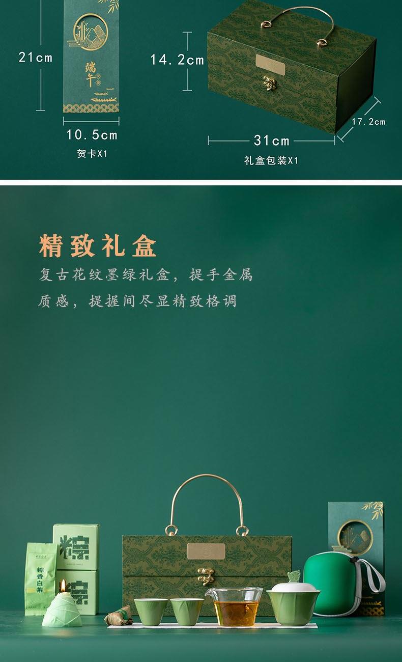配 置:盖碗和公杯各一个,茶杯两个,粽型香薰蜡烛一个,粽叶包老白茶两泡,茶巾一条,贺卡一张,EVA包一个,含提手彩盒包装。