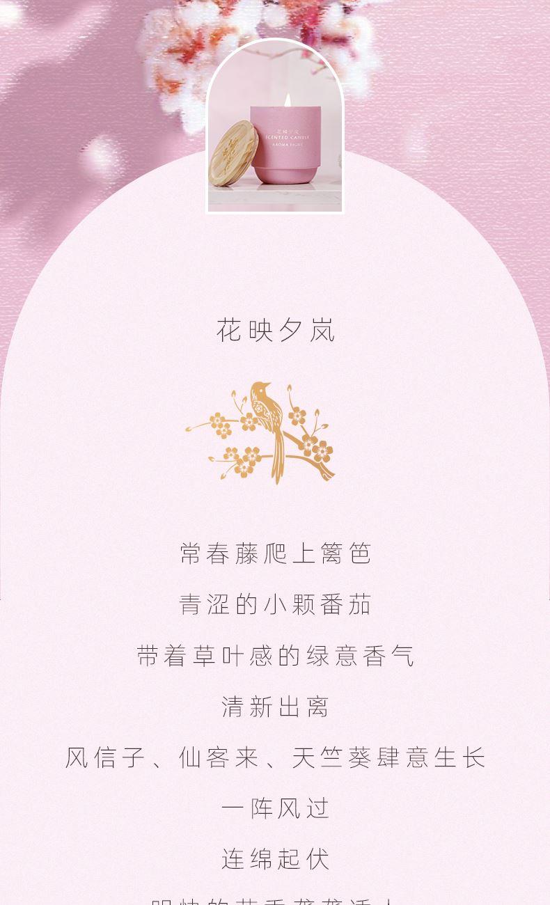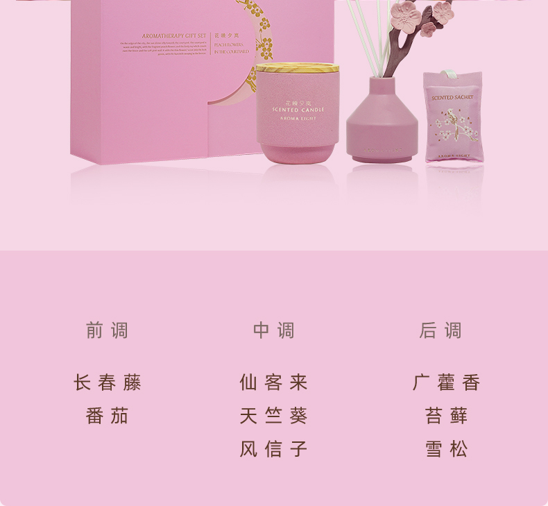 前调:常春藤、番茄中调:天竺葵、风信子仙客来、后调:广藿香、苔藓、雪松 规格:香薰蜡烛223g、无火香薰100ml、布艺香包7g