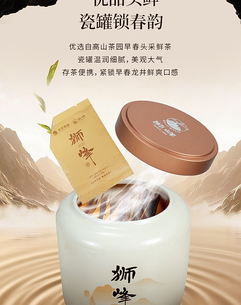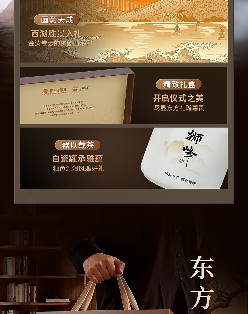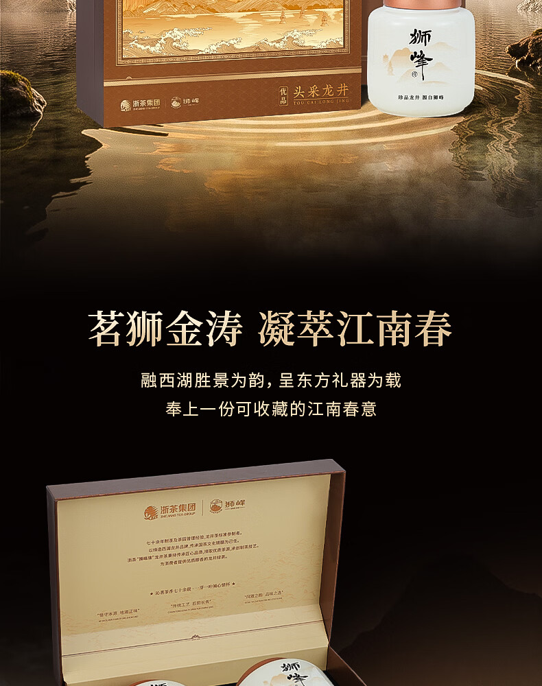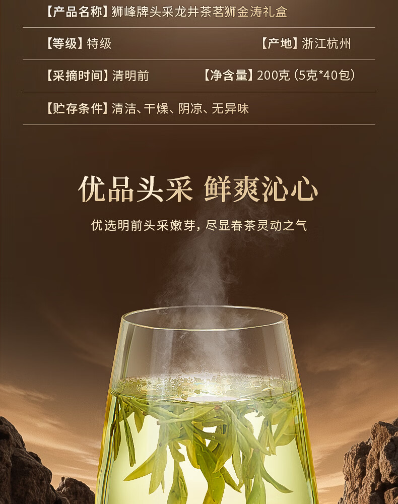 狮峰 商品编号:100018671838 储存方法:避光 密封 防潮 防异味 包装规格:1盒 保质期:12个月 采摘地:浙江 茶叶等级:特级 采摘时间:明前 采摘要求:一芽一叶 一芽两叶 包装形式:礼盒装 包装清单:礼盒*1、手提袋*1