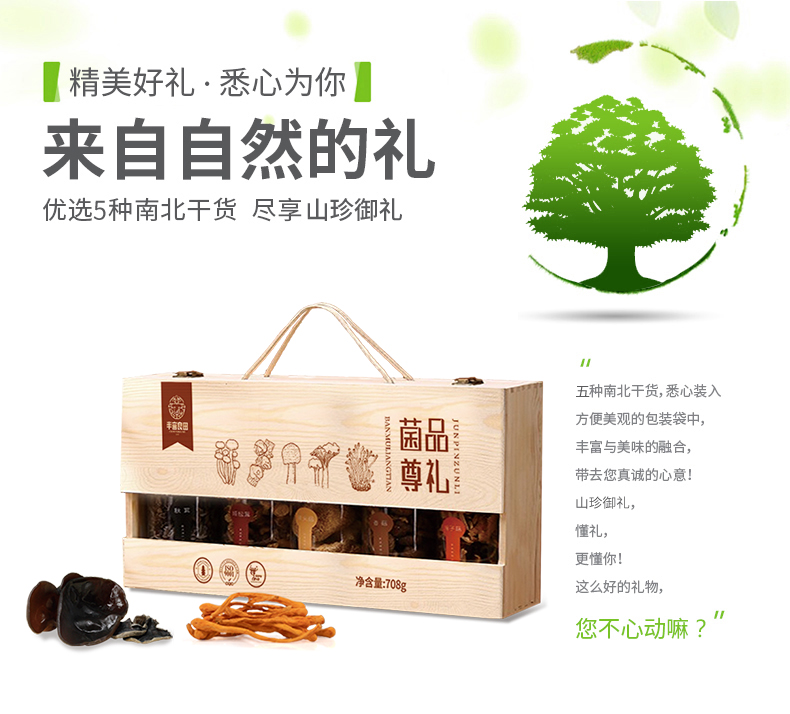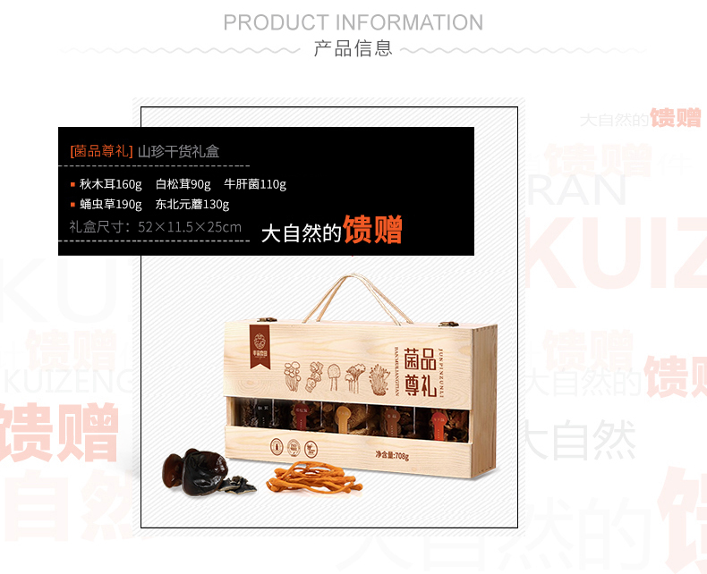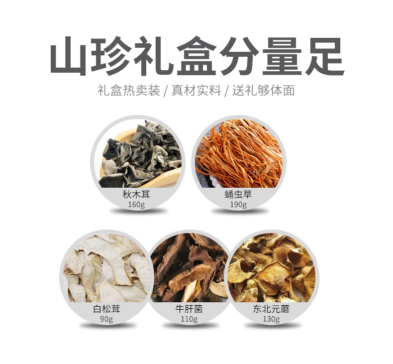 产品配置: 精选白松茸90g 野生秋木耳160g 精选牛肝菌110g 东北元蘑130g 精选蛹虫草190g 净含量:680g 礼盒尺寸:52*11.5*25cm 木盒藏珍,集野生秋木耳爽脆、蛹虫草珍有、鹿茸菇鲜香, -罐一美味,一盒尽是自然恩物,赠礼自享皆相宜。