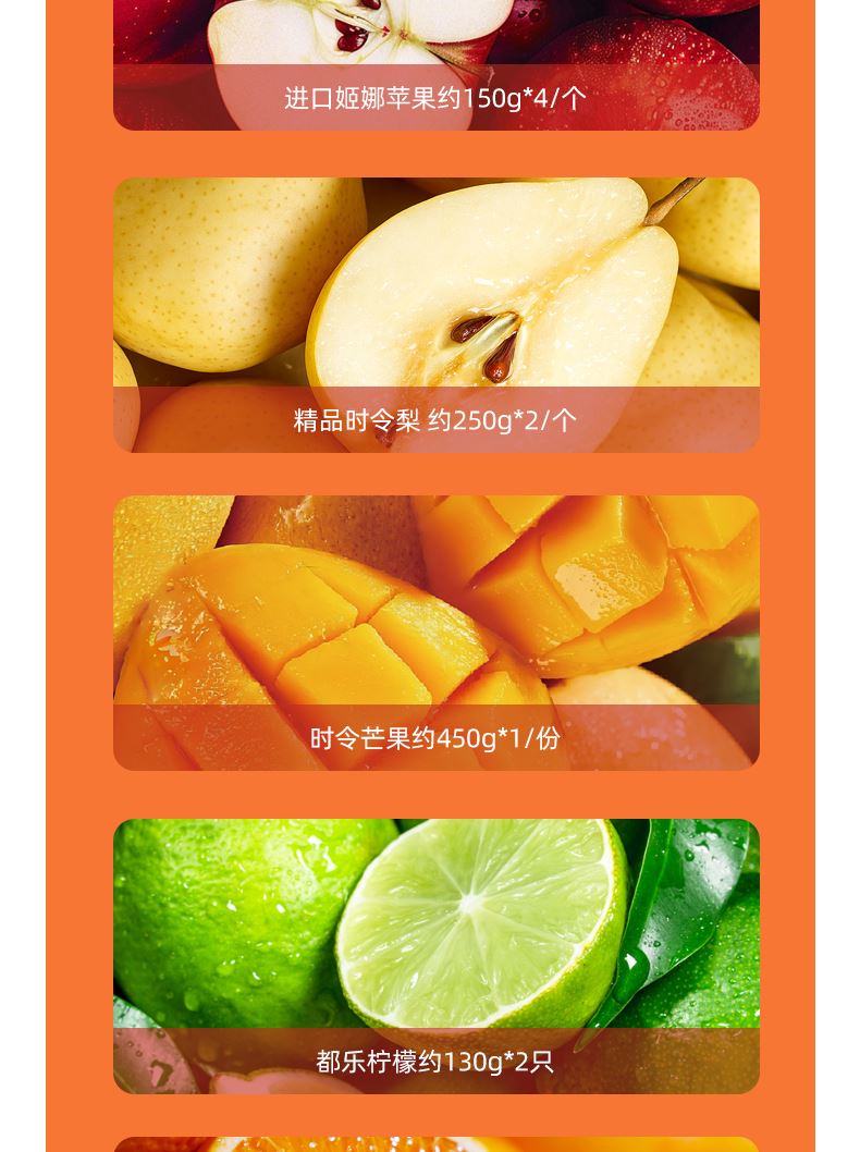 "都乐\佳农进口菠萝约1200g*1/个 都乐网文瓜 约1000g*1/个 蜜保火龙果约400g*2/只 进口牛油果约150g*2/个 进口西柚 约300g*2/个 进口姬娜苹果约150g*4/个 精品时令梨 约250g*2/个 时令芒果约450g*1/份 都乐柠檬约130g*2只 时令甜橙约220g*4 ( 时令鲜果单品断档会替换等价单品)"