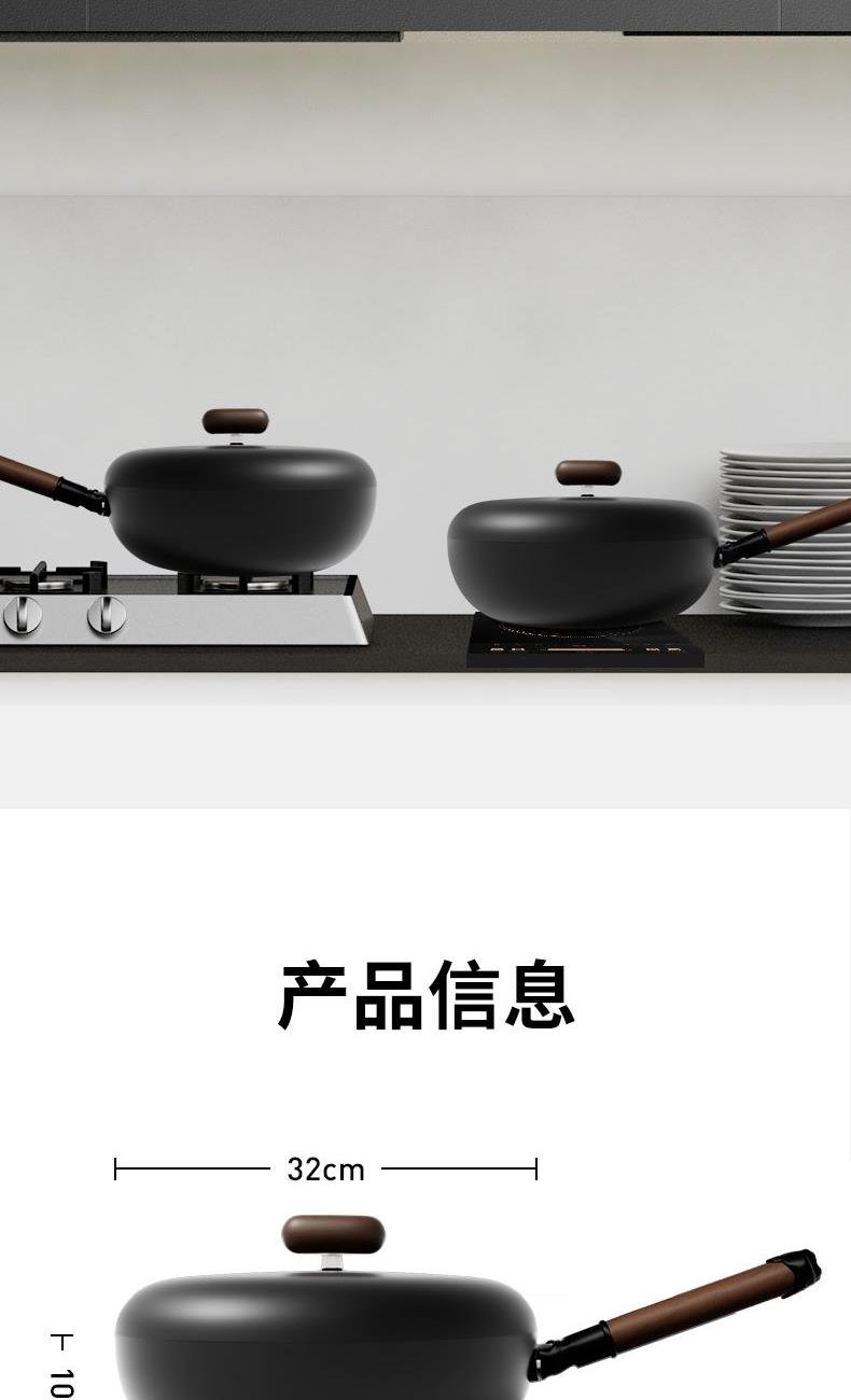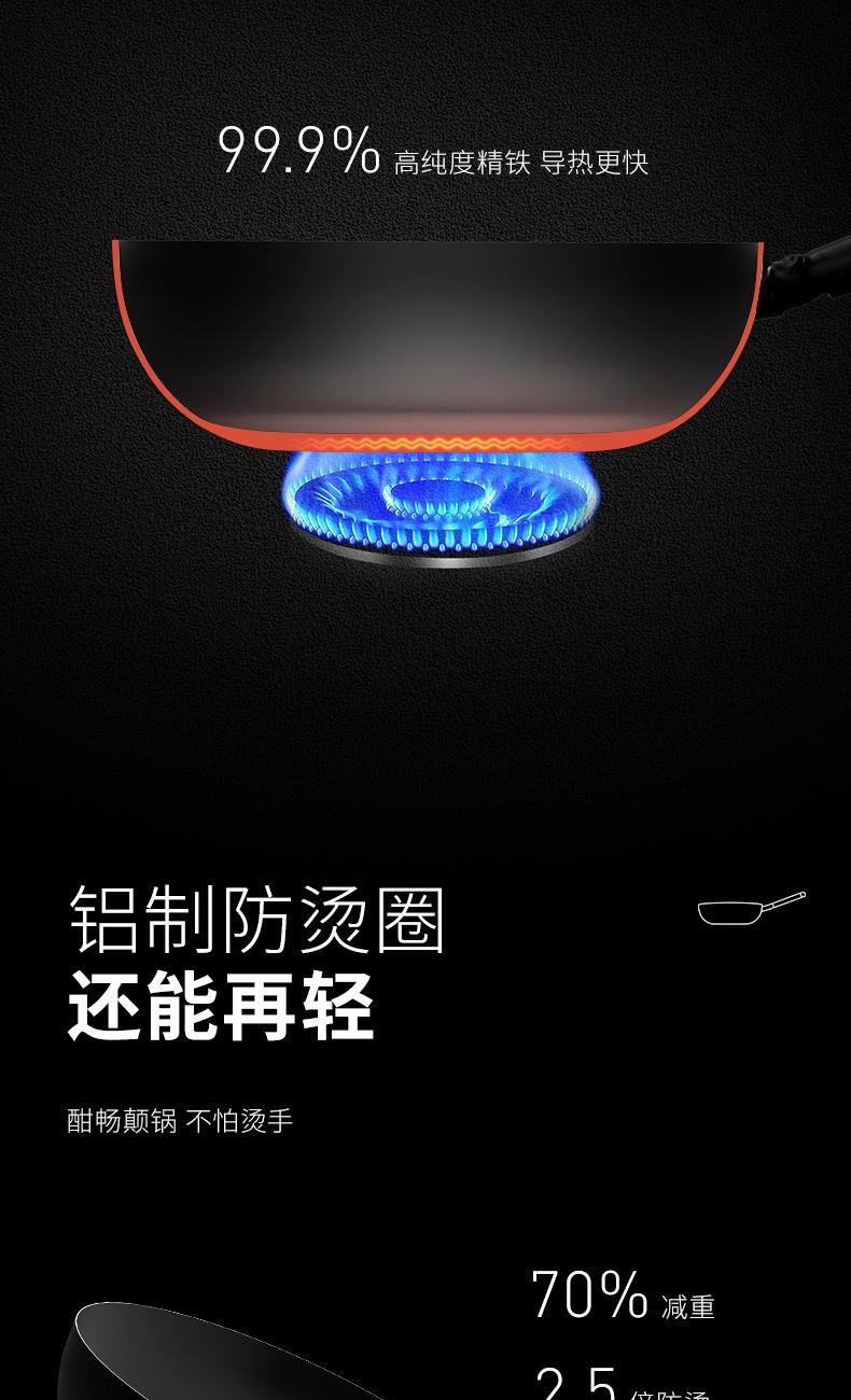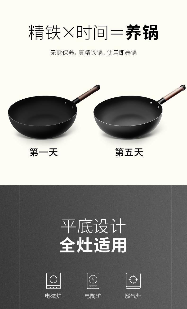 【材质】精铁 【规格】32cm 【净重】2.2kg 【毛重】3.2kg 【包装方式】彩盒+邮购箱 【外箱尺寸】395*125*395mm 【颜色】黑色 产品特点: 1.真精铁,Sa3级防锈; 2.深层渗氮,少油不粘; 3.厚底薄壁,颠锅更趁手; 4.平底设计,全灶适用。