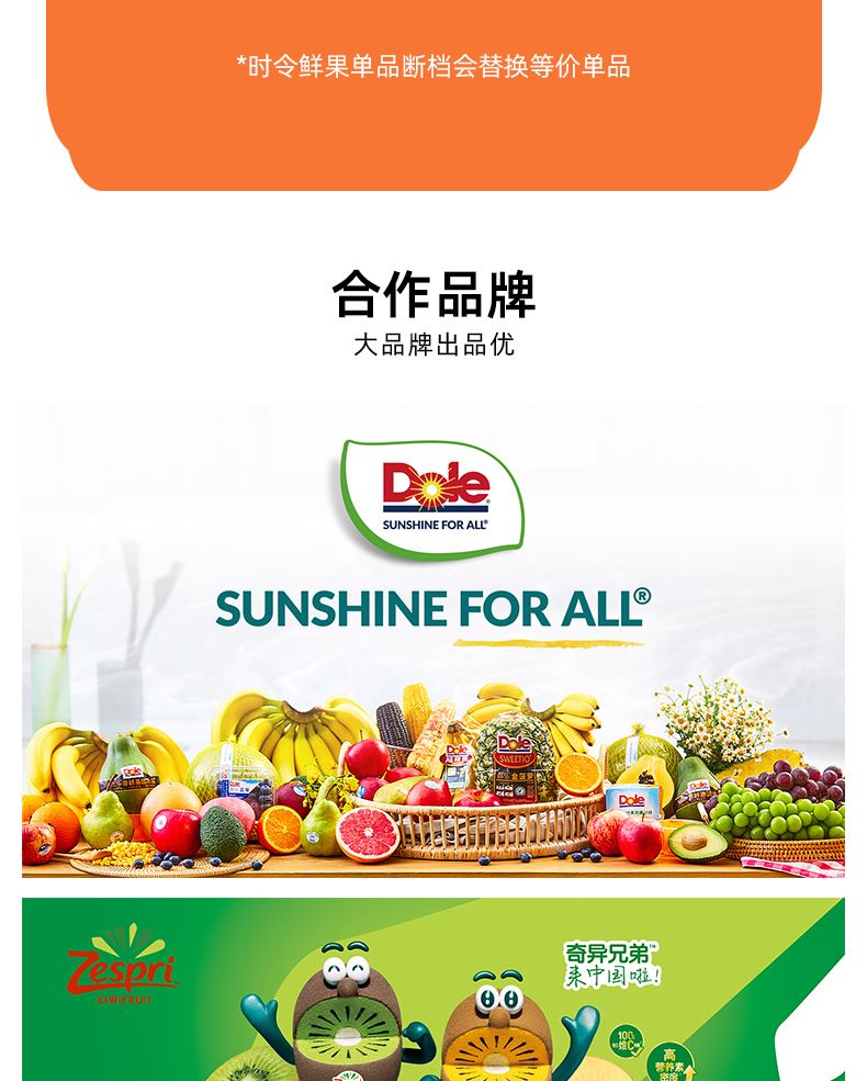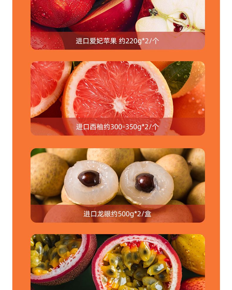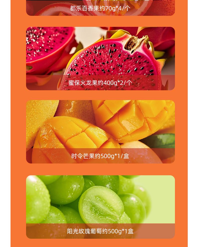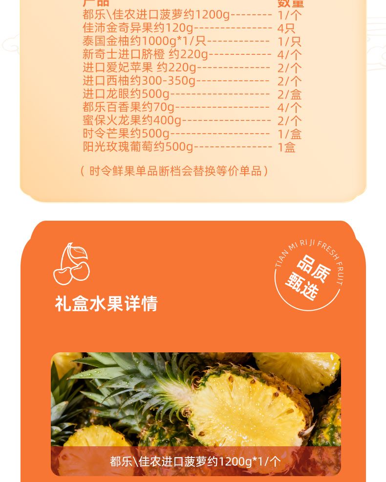 "都乐\佳农进口菠萝约1200g*1/个 佳沛金奇异果约120g*4只 泰国金柚约1000g*1/只 新奇士进口脐橙 约220g*4/个 进口爱妃苹果 约220g*2/个 进口西柚约300-350g*2/个 进口龙眼约500g*2/盒 都乐百香果约70g*4/个 蜜保火龙果约400g*2/个 时令芒果约500g*1/盒 阳光玫瑰葡萄约500g*1盒 ( 时令鲜果单品断档会替换等价单品)"