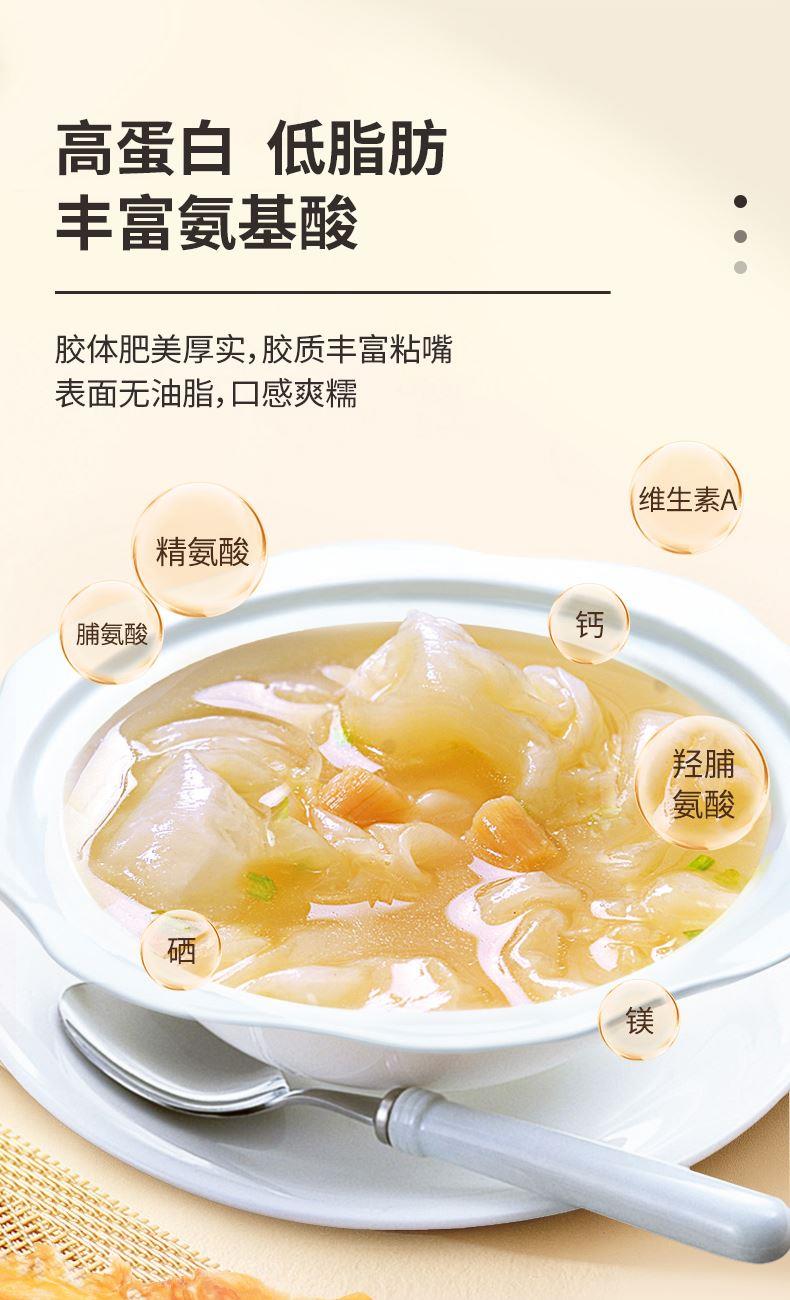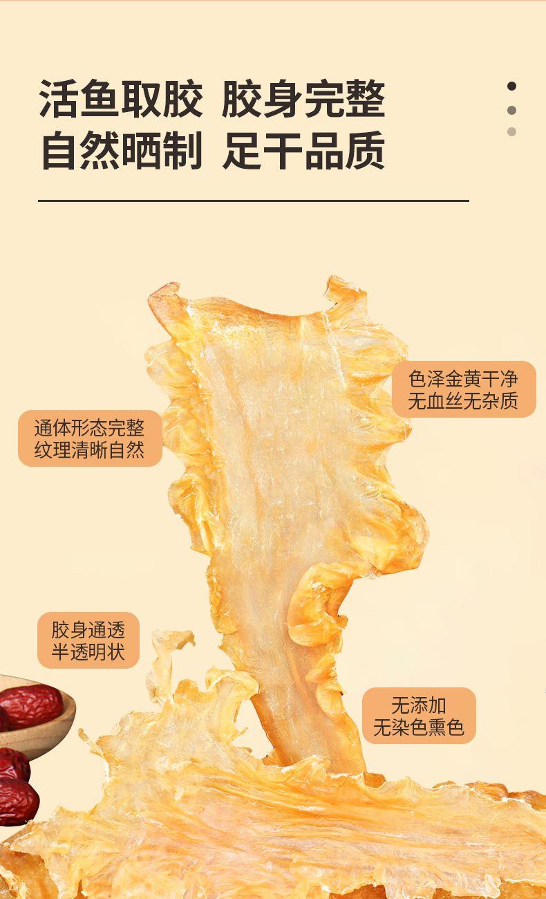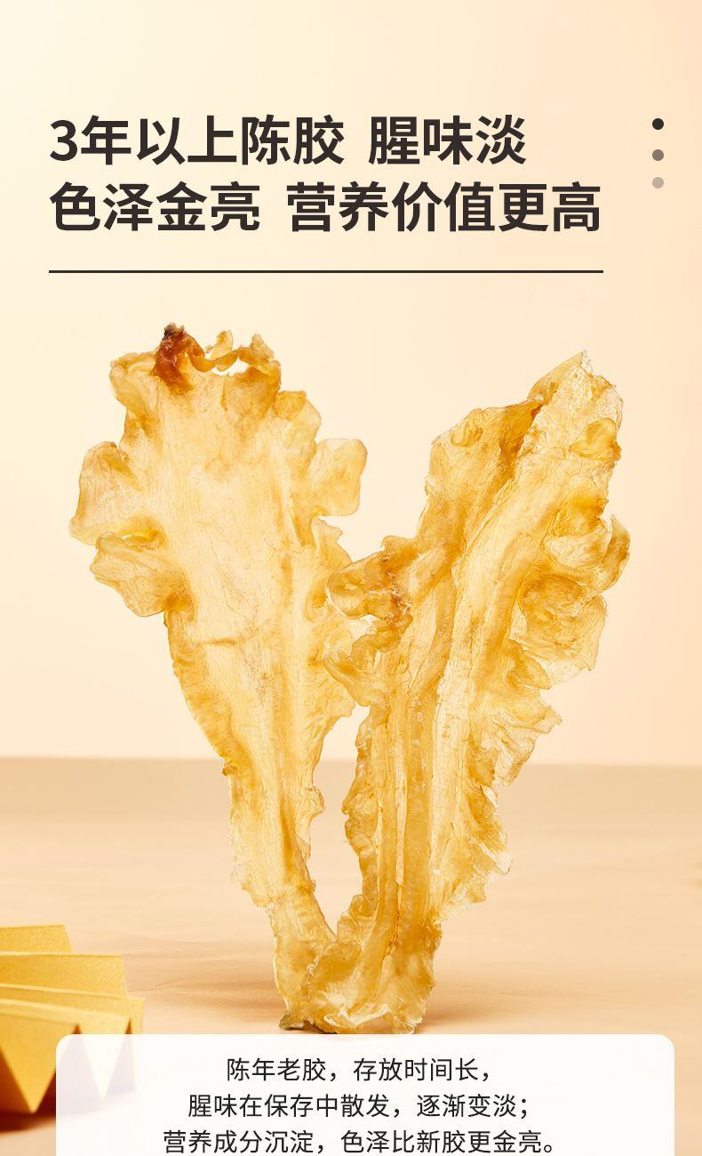 蔡府7A鳕鱼胶150g 规格:150g 包装尺寸:30*23*7.5cm 极圈冰岛鳕鱼胶,深海无污染水域出产 15年鱼龄大鱼,活鱼取胶;精选公肚,个大肉厚,泡发率2-3倍; 陈年好胶,表面干爽,无油脂无血丝,胶体肥美厚实; 天然金黄色,无漂白、无熏硫、无添加,色泽晶莹,呈半透明; 体态完整,个头匀称,胶身通透,纹理清晰; 丰富胶原蛋白,肉质细腻,口感糯滑; 适合全家滋补选择,或轻奢送礼需求。