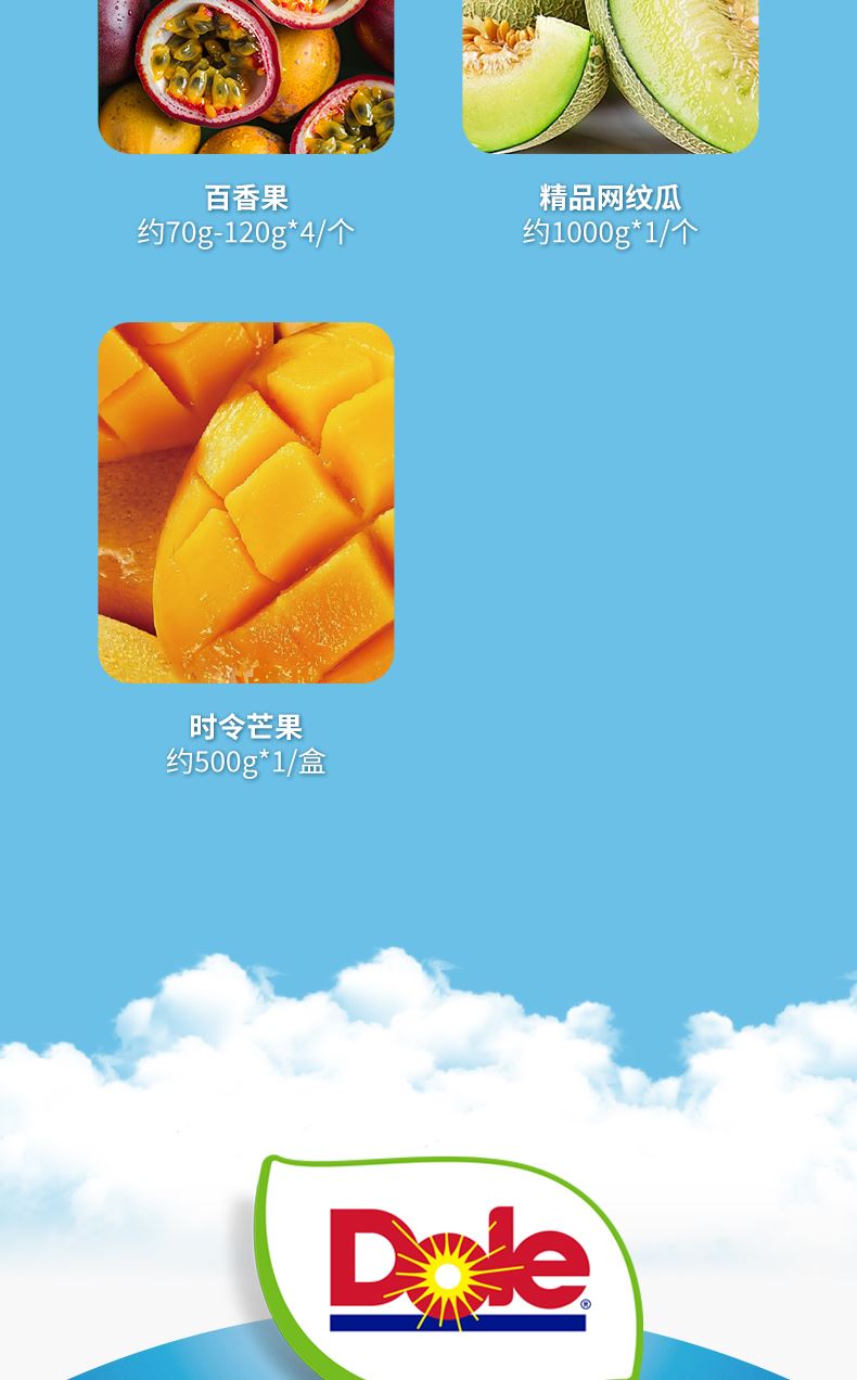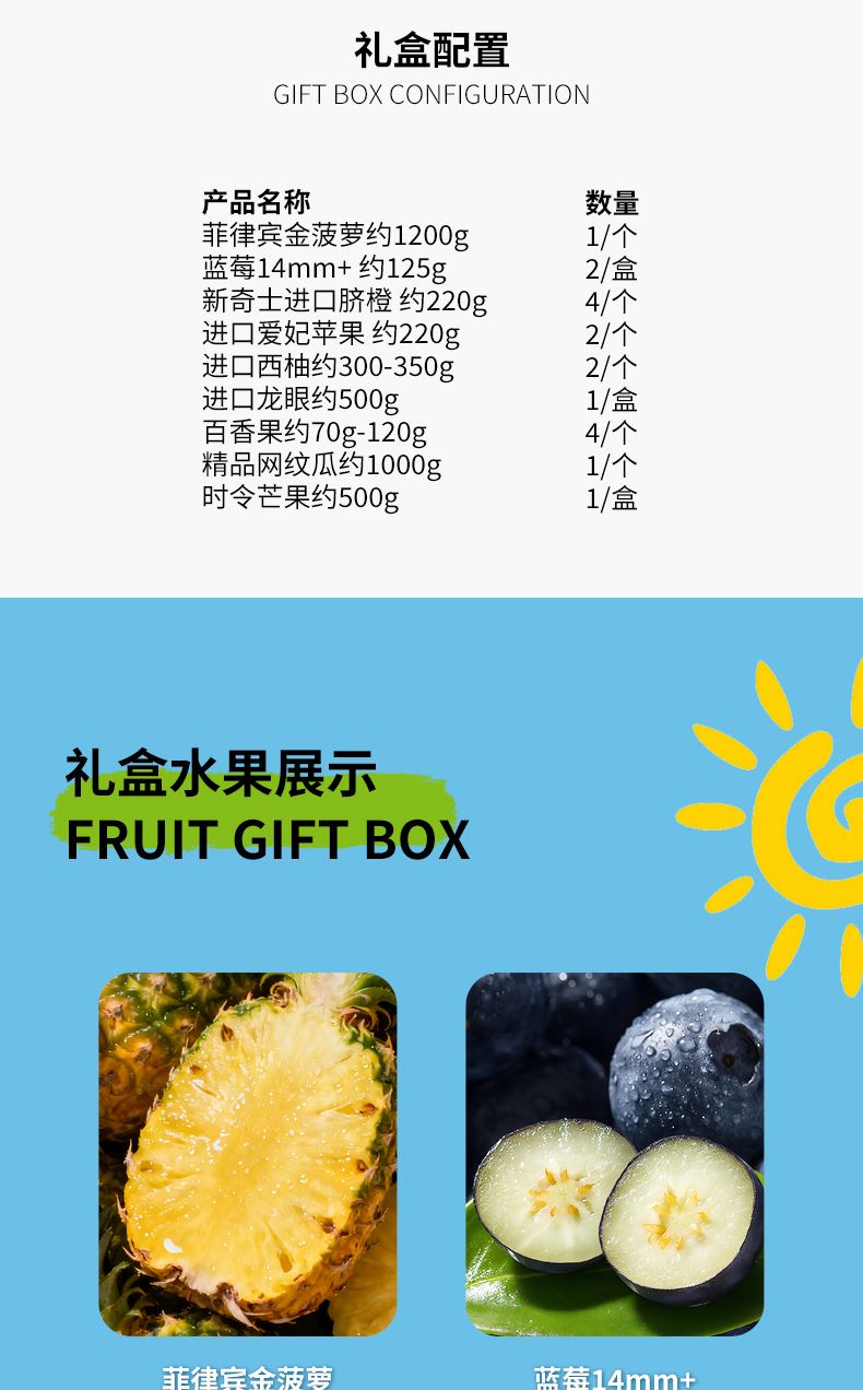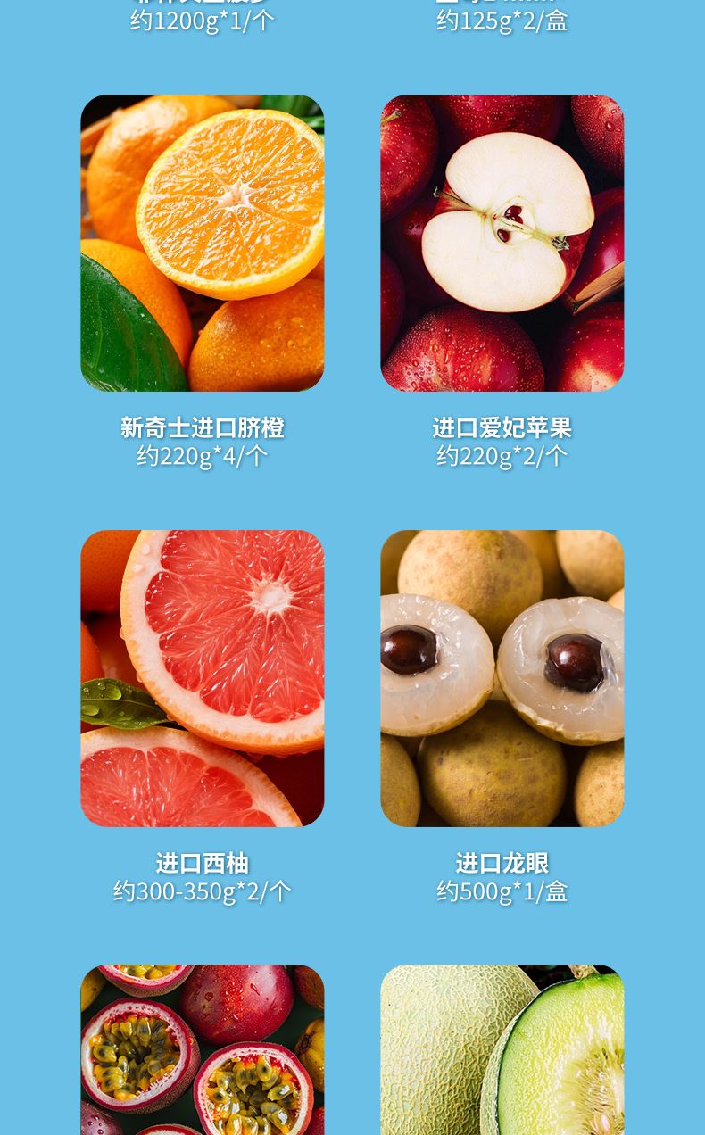 "菲律宾金菠萝约1200G*1/个 进口椰青 约900g*1/个 佳沛阳光金奇异果 约120g*4/个 蓝莓14mm+ 约125g*4/盒 进口爱妃苹果 约220g*4/个 新奇士进口甜橙 约220g*2/个 时令芒果约500g*1/盒 进口龙眼约500g*1/盒 进口西柚约300-350g*2/个"