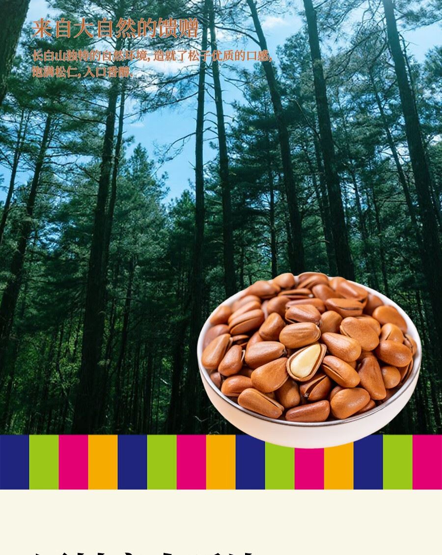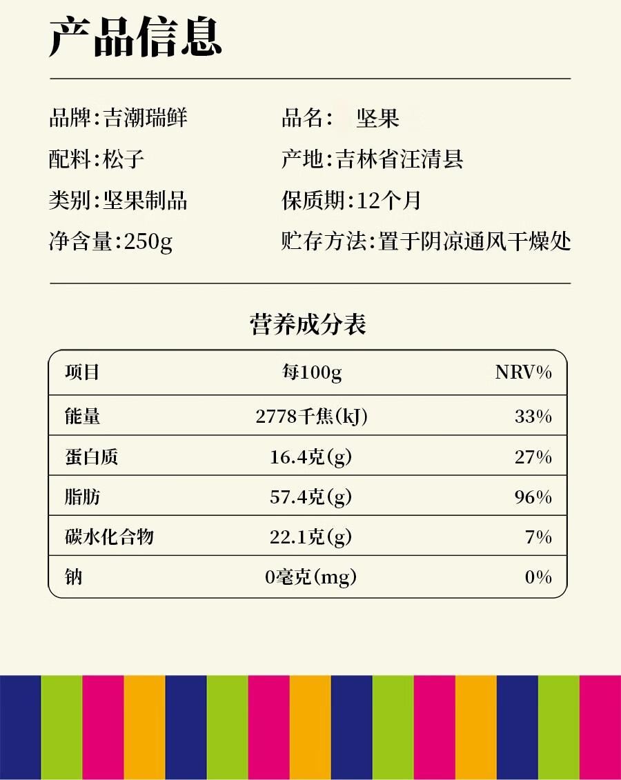 吉潮瑞鲜老树松子200克*1袋 配料:松子 类别:坚果制品 净含量:250g 产地:吉林省汪清县 保质期:12个月 贮存方法:置于阴凉通风干燥处