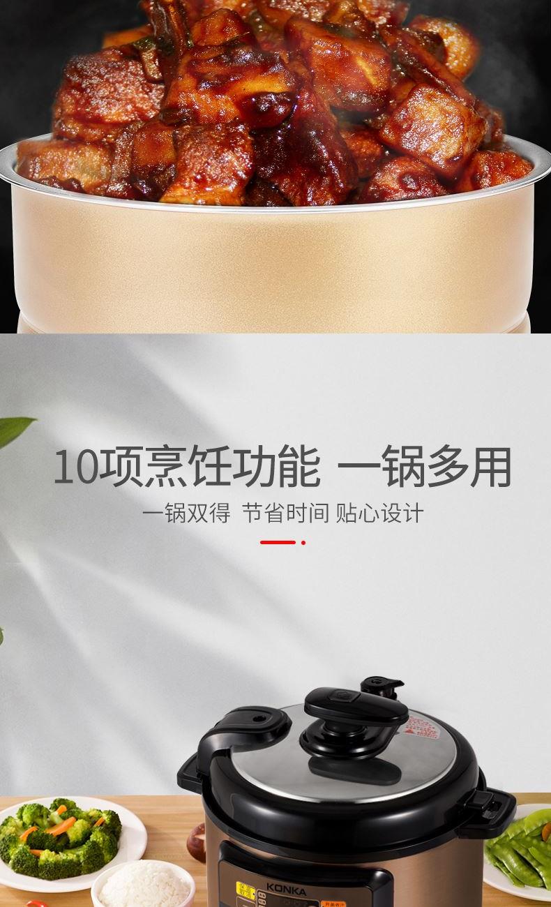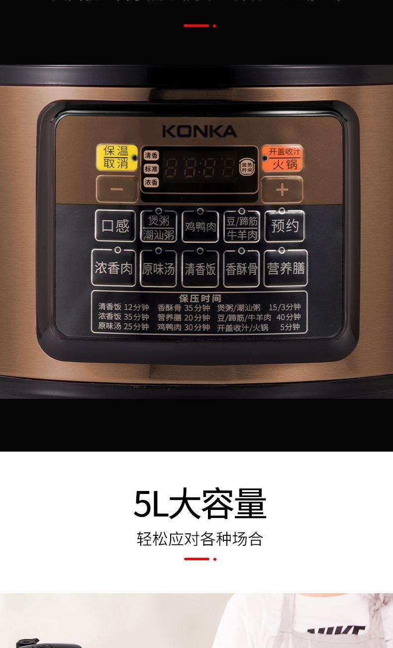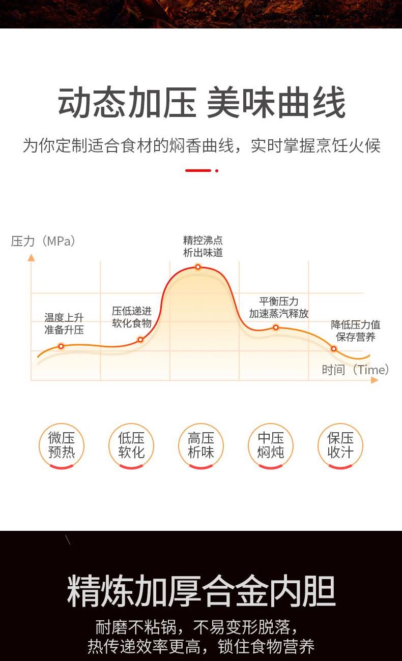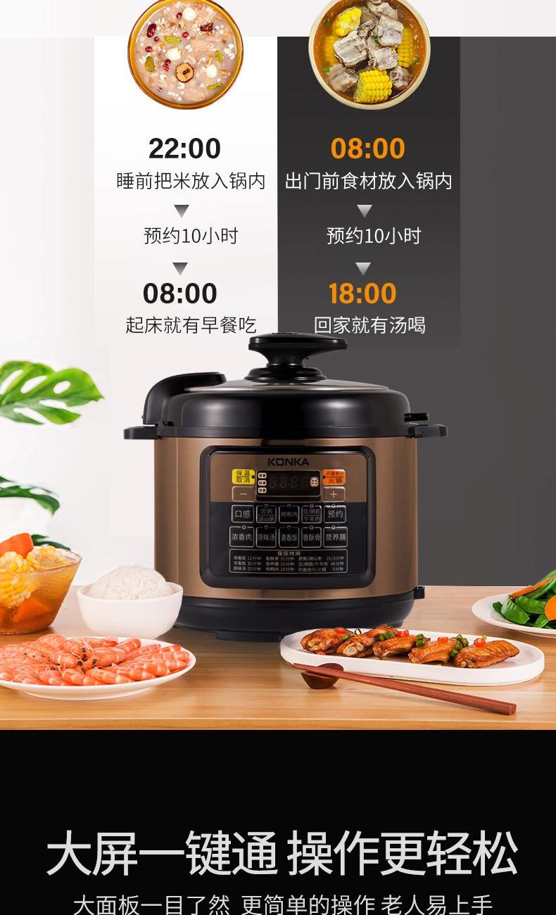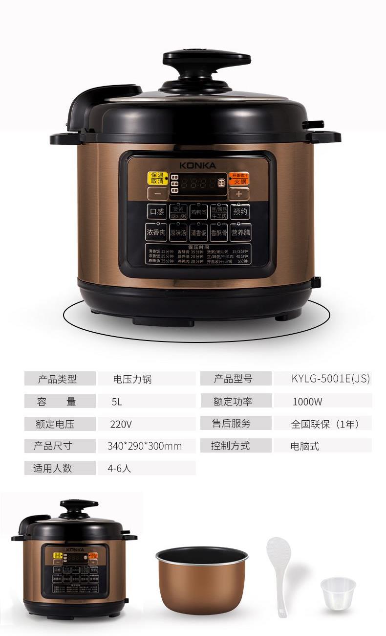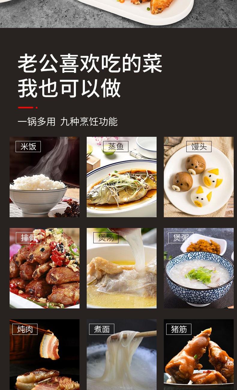 功率:1000W 款式:电脑款 额定电压:220V 额定频率:50Hz 容量: 5L 5L双喷厚边不粘内胆,导热均匀稳定,释放食物深层美味 11大营养菜单,饭、汤、粥、焖、炖、焗 9大安全防护,24小时预约,提前定时,未进家门,先闻饭香