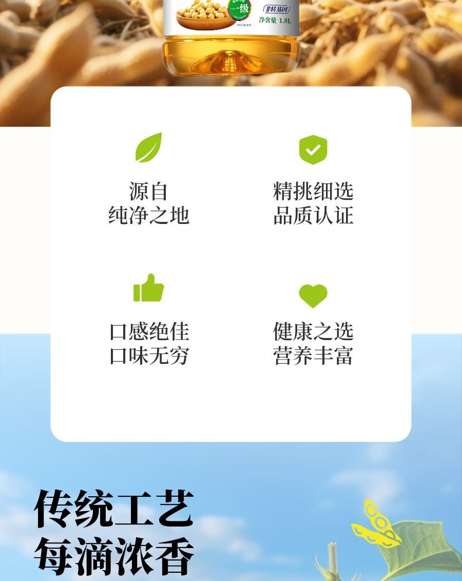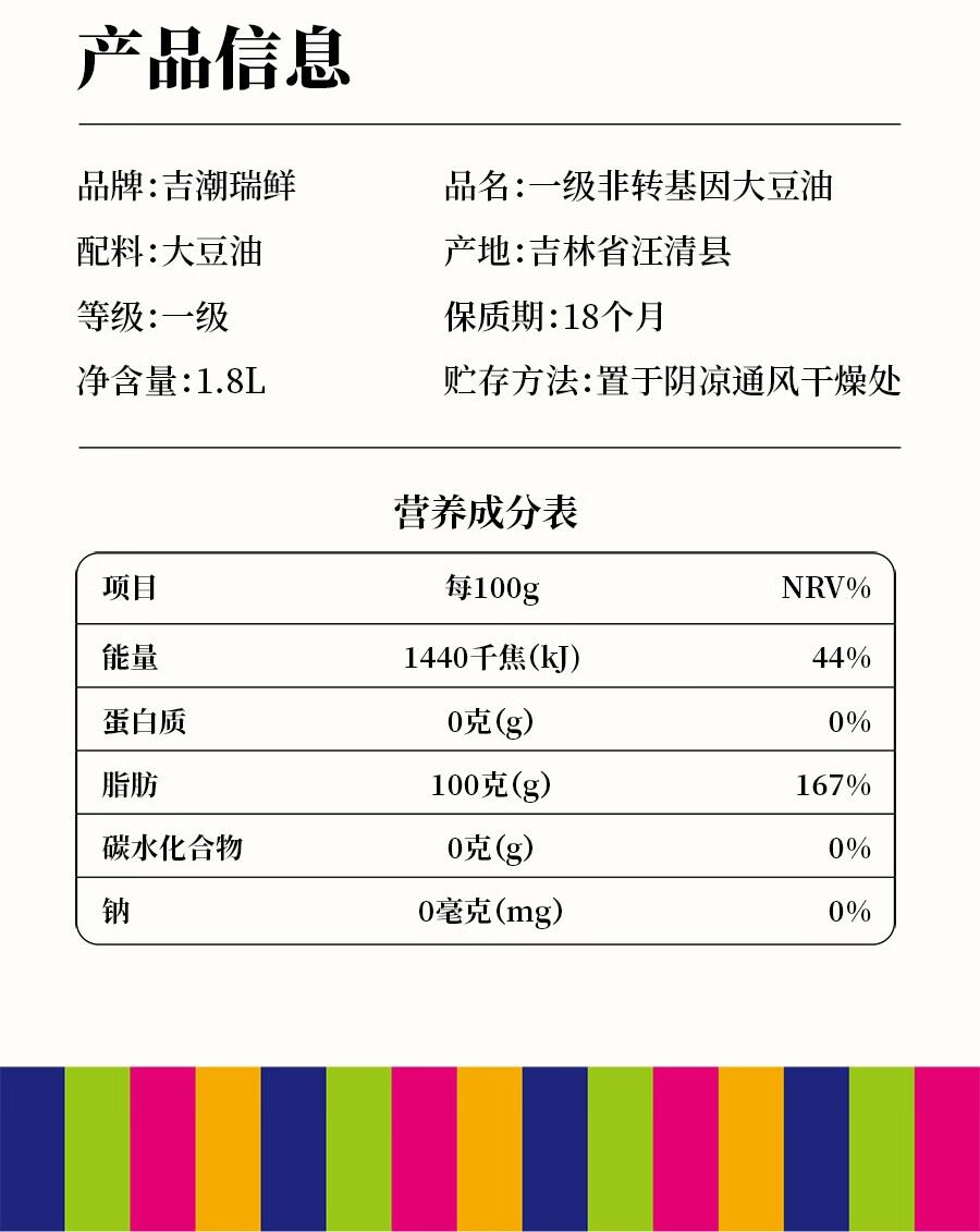 吉潮瑞鲜一级非转基因大豆油1.8L 配料:大豆油 等级:一级 净含量:1.8L 产地:吉林省汪清县 保质期:18个月 贮存方法:置于阴凉通风干燥处