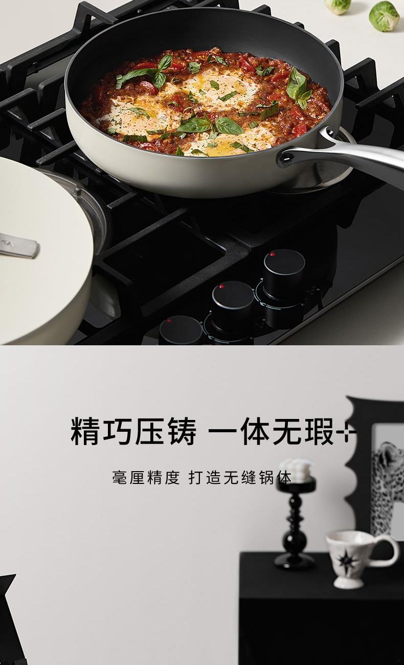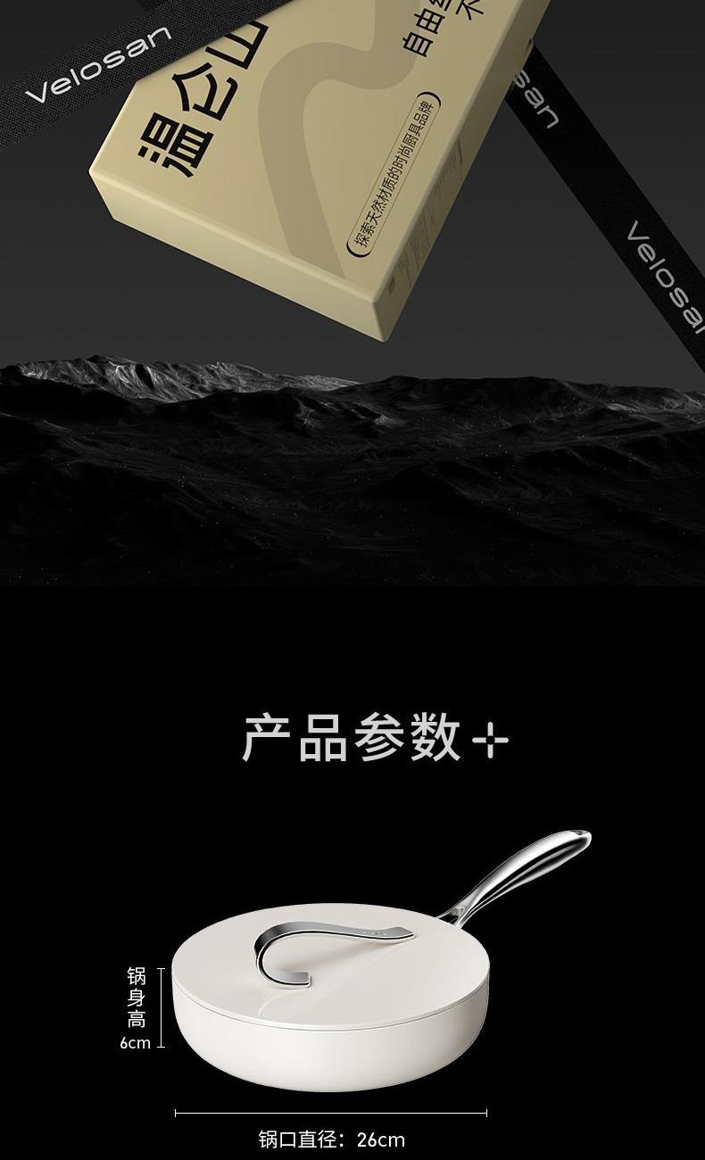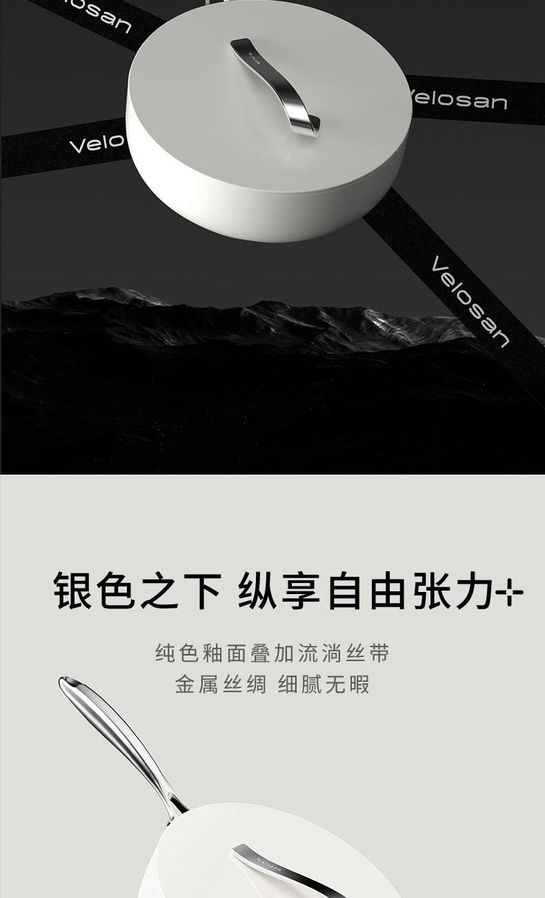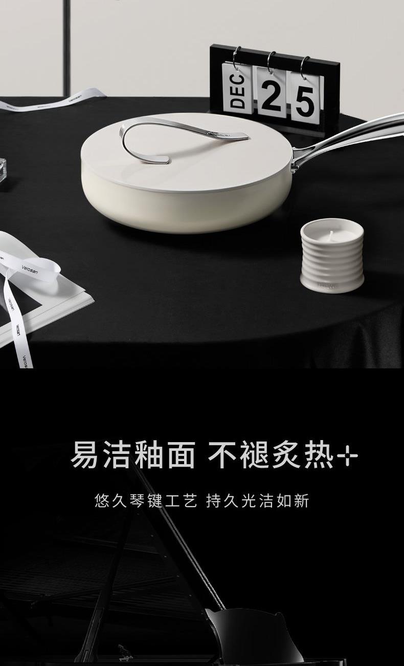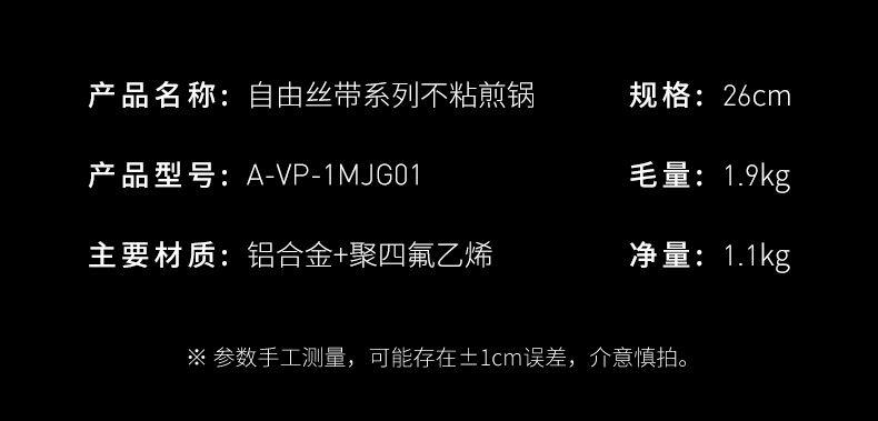 【型号】A-VP-1MJG01 【SKU】VP-3MJG01-4A26白 【材质】铝合金 【尺寸】26cm 【净重】1.1kg 【毛重】1.9kg 【包装尺寸】邮购盒 【外箱尺寸】340*100*530mm 【颜色】白色 【条码】6972547370257 丝带设计把手顶珠,造型美观; 内外防粘陶瓷釉层,不含PFAS,更安全; 凸点悬浮,立体防粘; 加长手柄,从容烹饪; 不挑炉灶,一锅搞定; 即冲即净,方便快捷。
