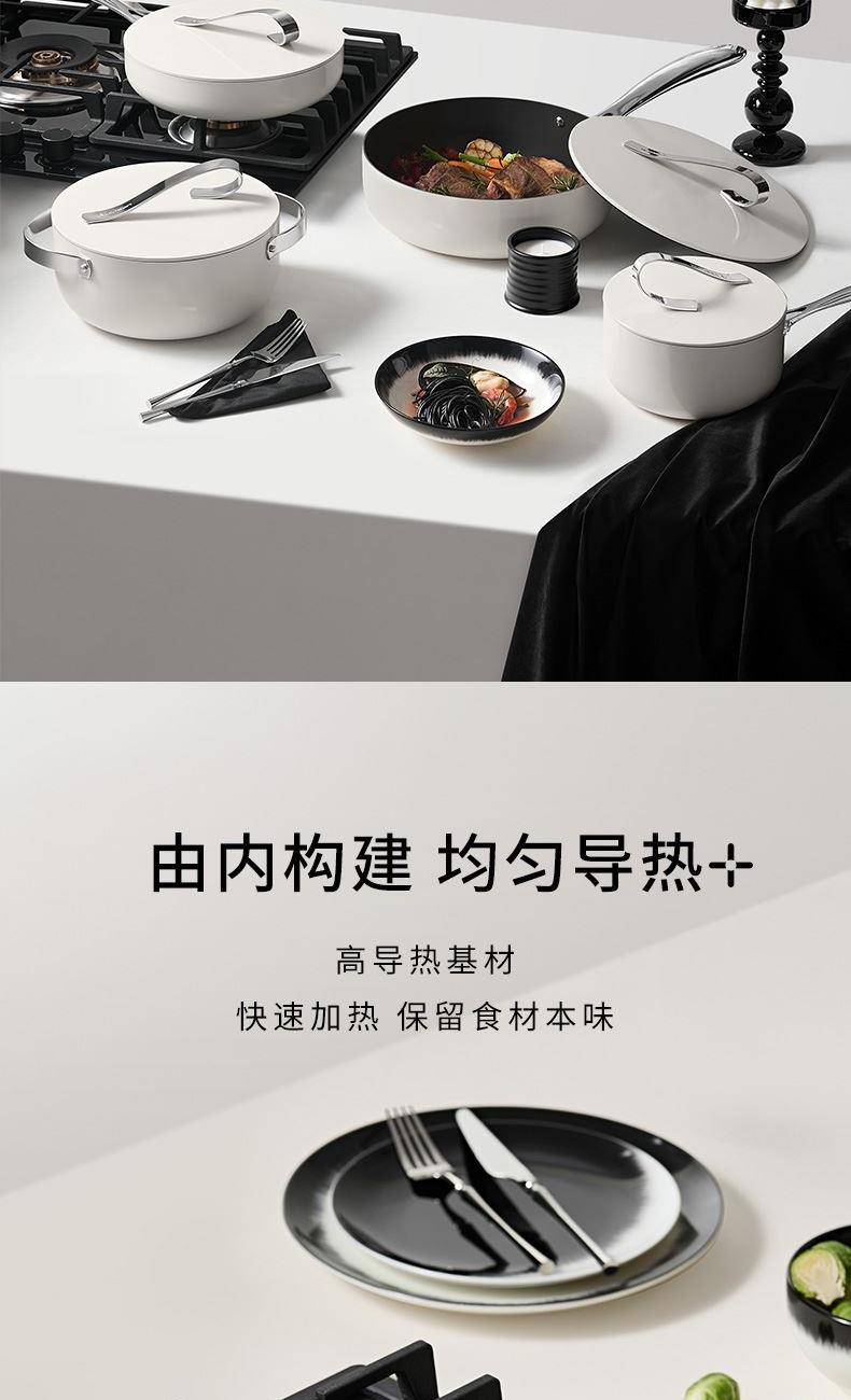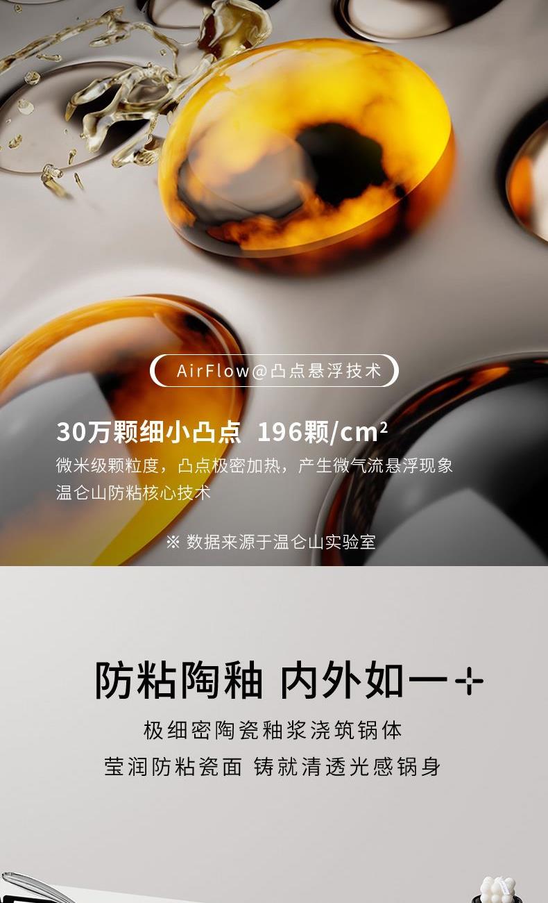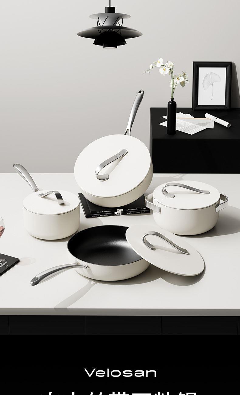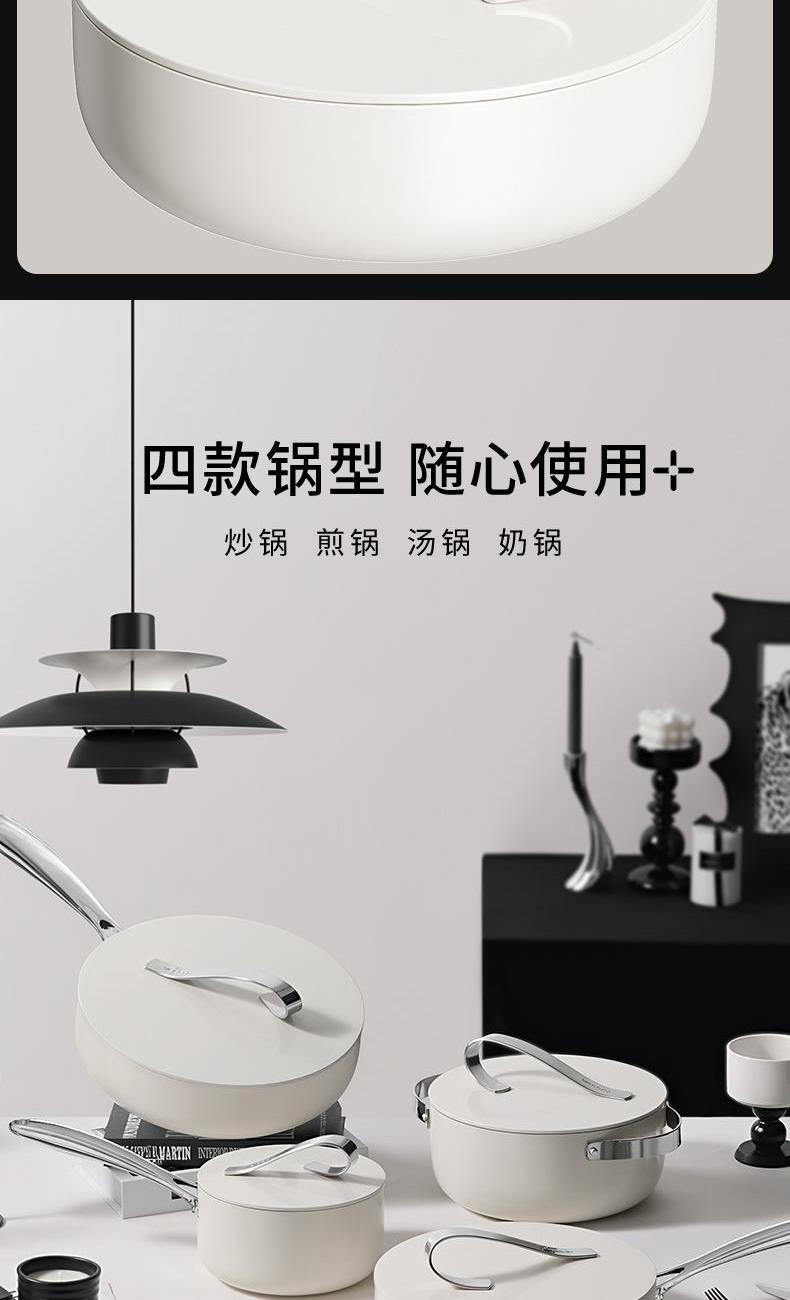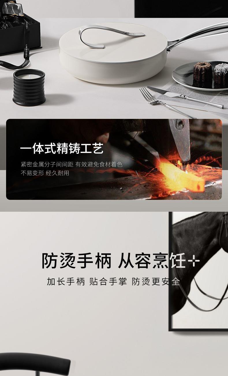 【型号】A-VP-1MJG01 【SKU】VP-3MJG01-4A26白 【材质】铝合金 【尺寸】26cm 【净重】1.1kg 【毛重】1.9kg 【包装尺寸】邮购盒 【外箱尺寸】340*100*530mm 【颜色】白色 【条码】6972547370257 丝带设计把手顶珠,造型美观; 内外防粘陶瓷釉层,不含PFAS,更安全; 凸点悬浮,立体防粘; 加长手柄,从容烹饪; 不挑炉灶,一锅搞定; 即冲即净,方便快捷。