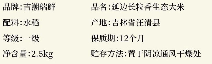 延边长粒香生态大米2.5公斤真空 配料:水稻 等级:一级 净含量:2.5kg 产地:吉林省汪清县 保质期:12个月: 贮存方法:置于阴凉通风干燥处