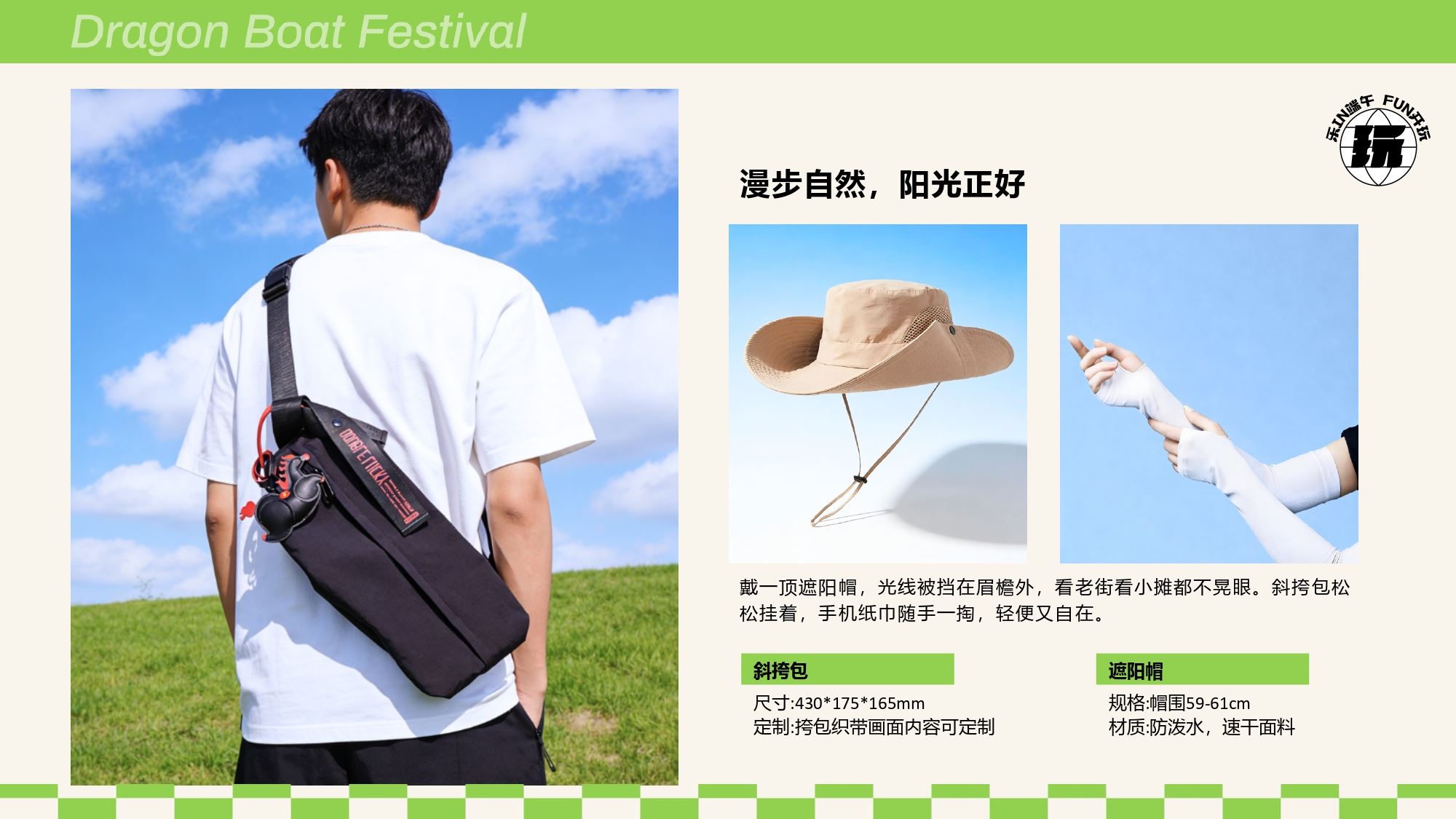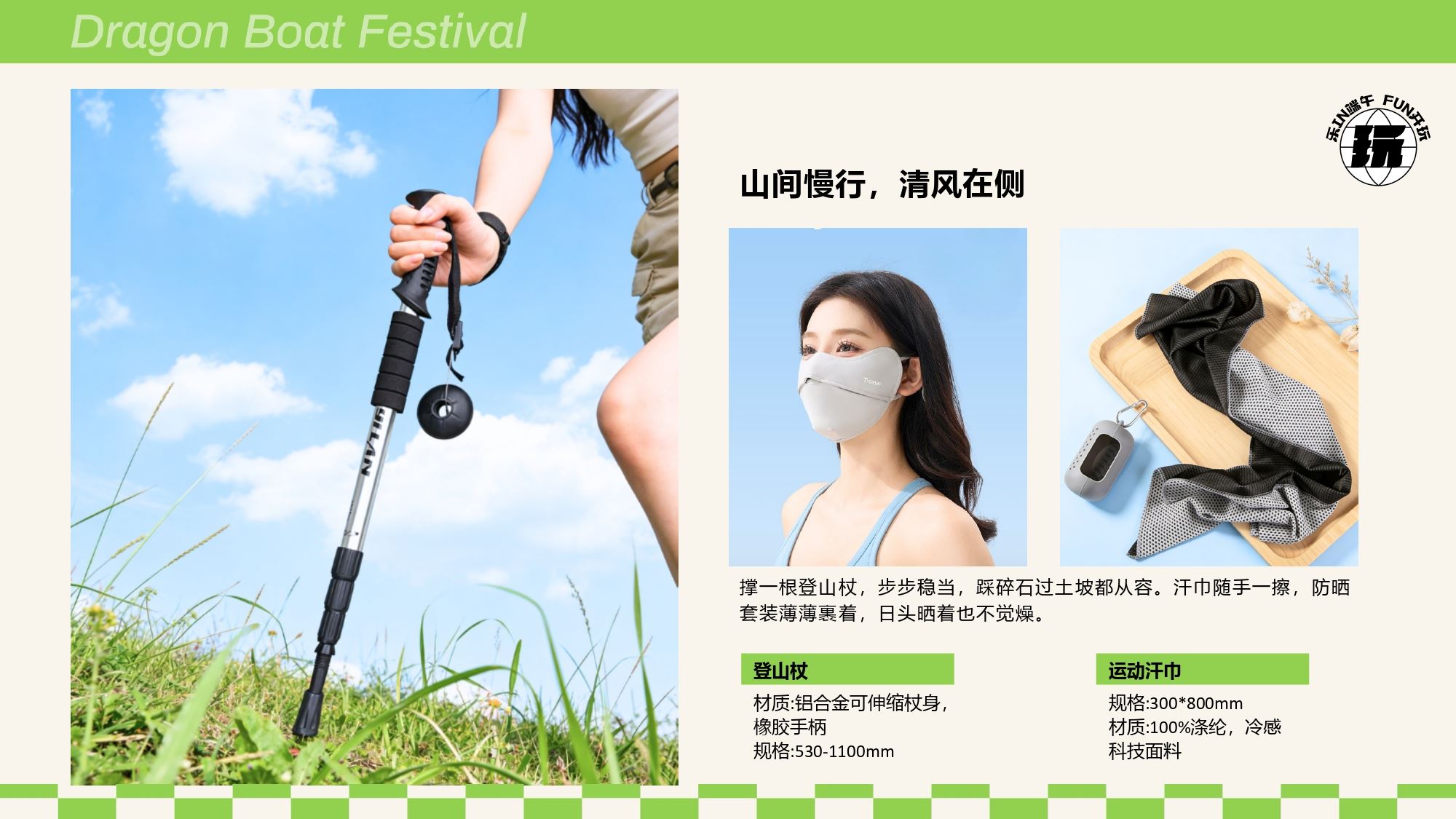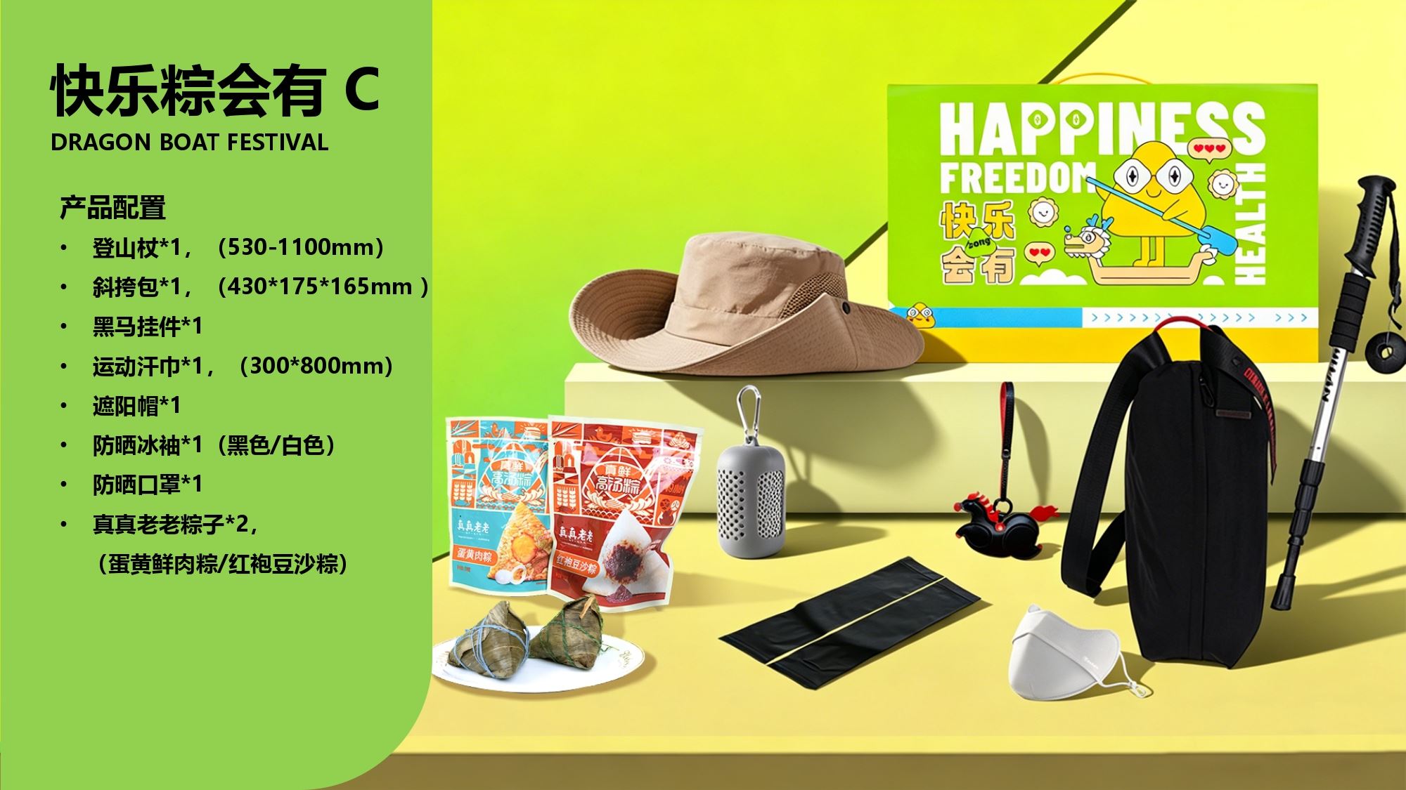 产品配置 登山杖*1,(530-1100mm) 斜挎包*1,(430*175*165mm ) 黑马挂件*1 运动汗巾*1,(300*800mm) 遮阳帽*1 防晒冰袖*1(黑色/白色) 防晒口罩*1 真真老老粽子*2, (蛋黄鲜肉粽/红袍豆沙粽)