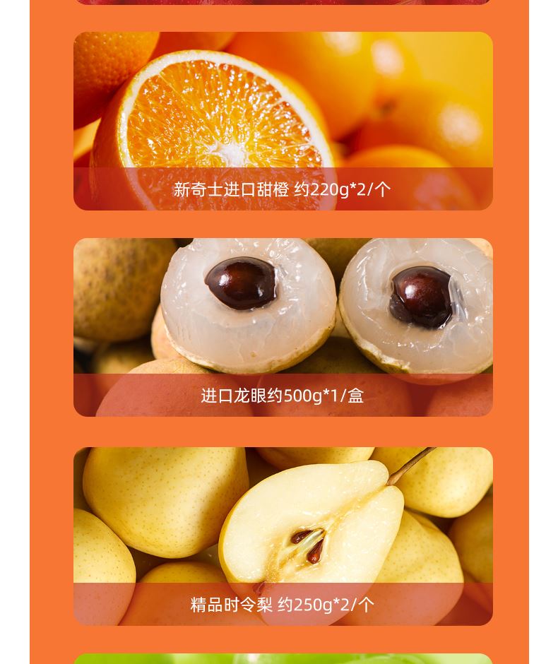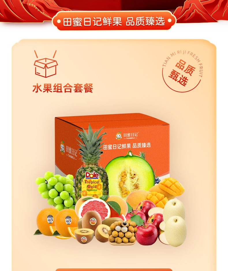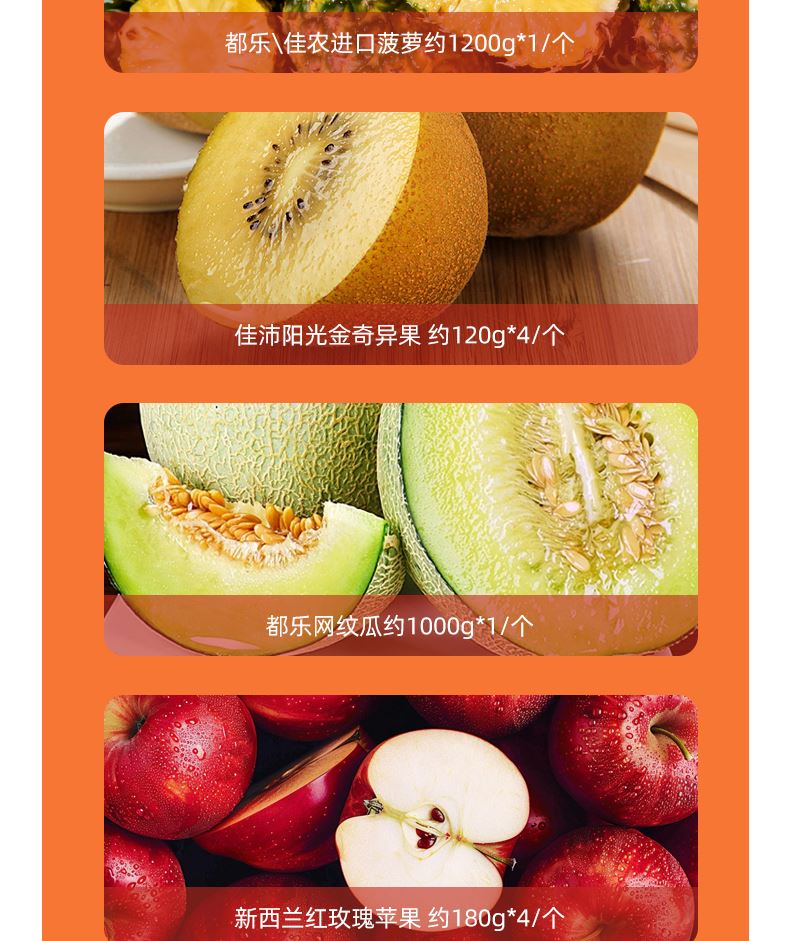 "都乐\佳农进口菠萝约1200g*1/个 佳沛阳光金奇异果 约120g*4/个 都乐网纹瓜约1000g*1/个 新西兰红玫瑰苹果 约180g*4/个 新奇士进口甜橙 约220g*2/个 进口龙眼约500g*1/盒 精品时令梨 约250g*2/个 阳光玫瑰葡萄约500g*2/盒 进口西柚 约300-350g*2/个 时令芒果约500g*1/盒 ( 时令鲜果单品断档会替换等价单品)"