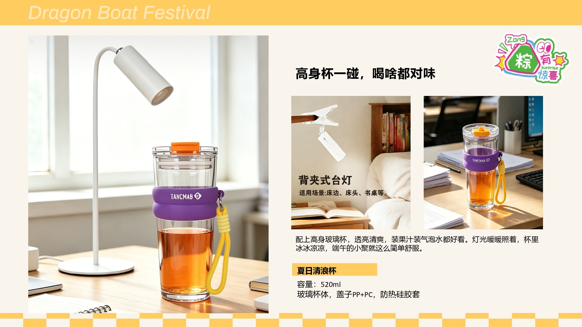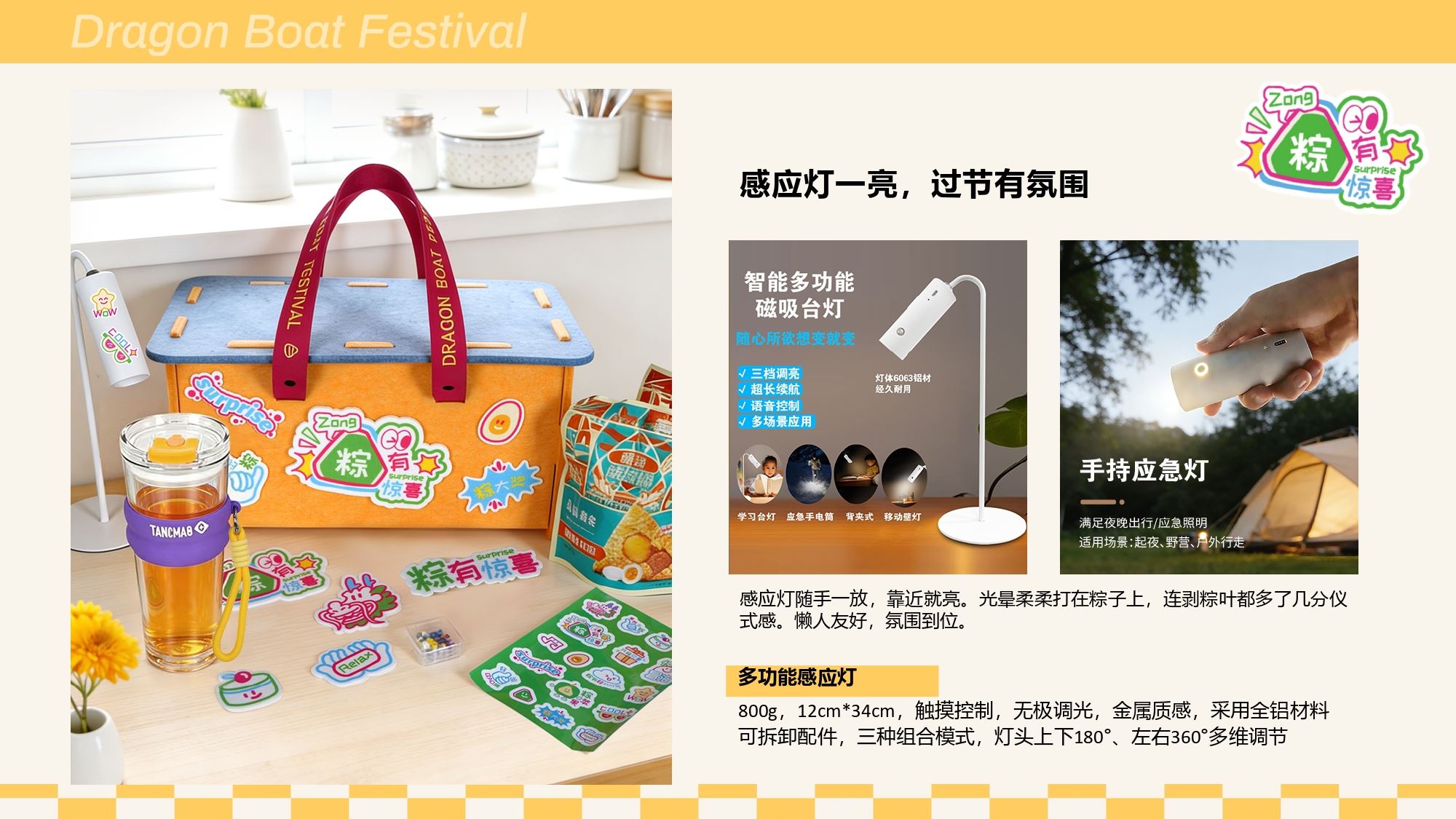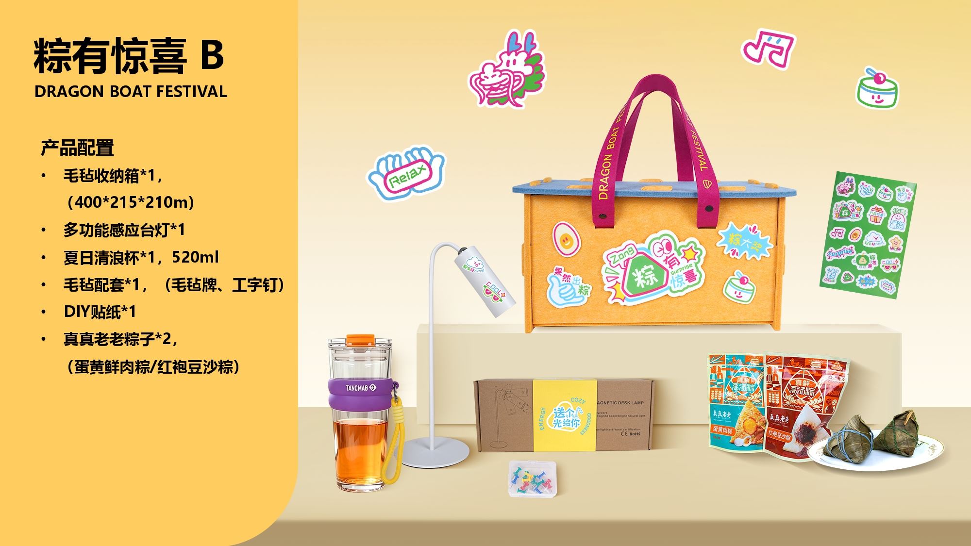 产品配置 毛毡收纳箱*1, (400*215*210m) 多功能感应台灯*1 夏日清浪杯*1,520ml 毛毡配套*1,(毛毡牌、工字钉) DIY贴纸*1 真真老老粽子*2, (蛋黄鲜肉粽/红袍豆沙粽)