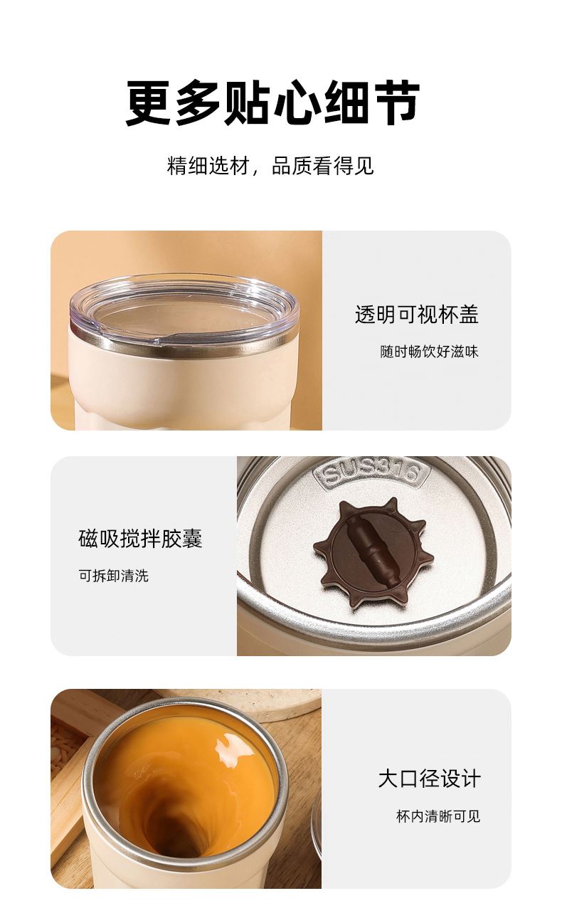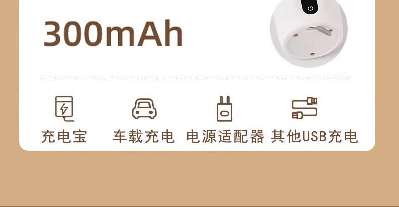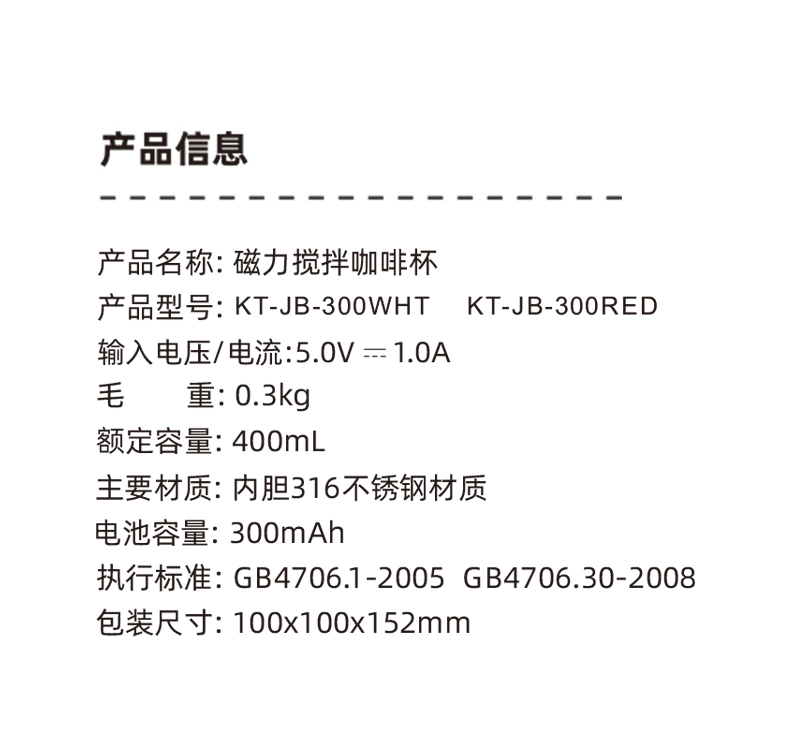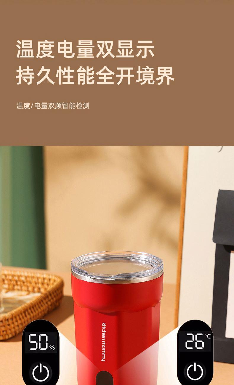 功率:0.15W 电压:5V/1A 容量:400mL 毛重:0.3Kg 材质:PP+316不锈钢+AS 彩盒包装尺寸:100*100*152mm 外箱包装尺寸:520*430*333mm 推荐理由: 1、AS安全材质,内胆316安全材质 2、Type-C充电接口,充电方便 3、高速磁力搅拌刀头,快速均匀搅拌 4、温度显示,不烫口