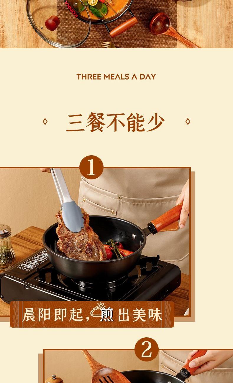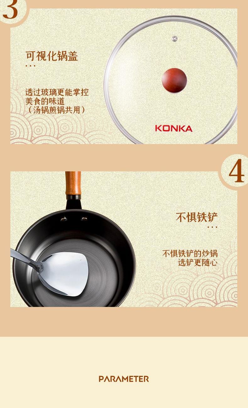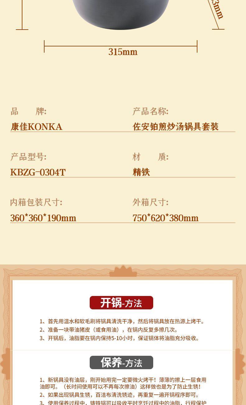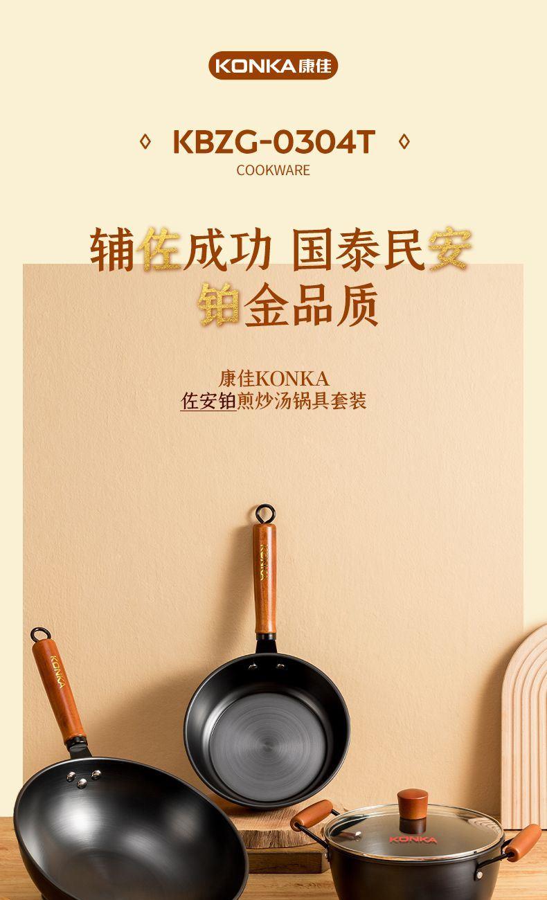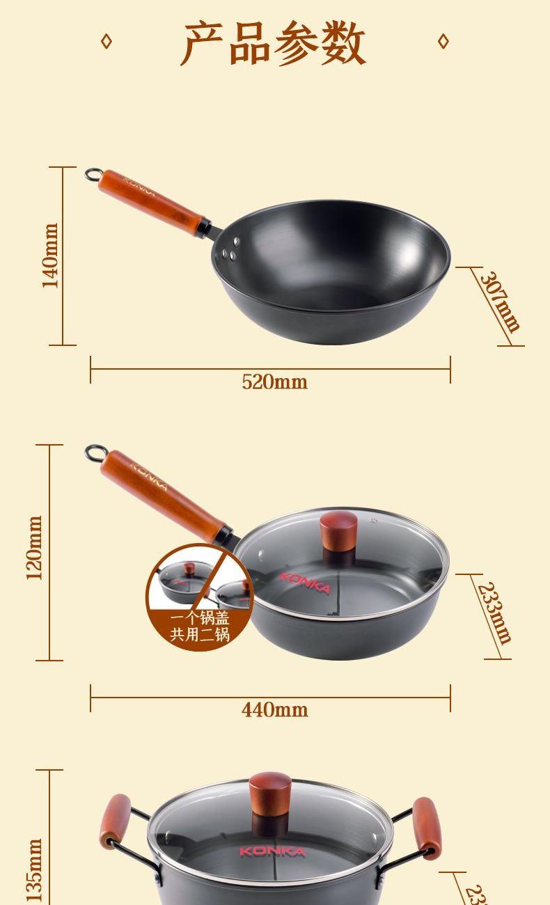 煎锅:22cn 炒锅:30cm 汤锅:22cm 1、内壁不粘环保涂层技术,超硬表层具有极强的防刮花、耐腐蚀、易清洗等特性 ; 2、煎、炒、汤、炖、炸等功能一应俱全; 3、优质铁基材,具有很高的热传导性,受热快;健康环保,轻便耐用; 4、外壁烤漆工艺,强度极高,光滑细腻,抗油污,易清洗; 5、 特制的优质胶木手柄,时尚环保,触握更舒适。