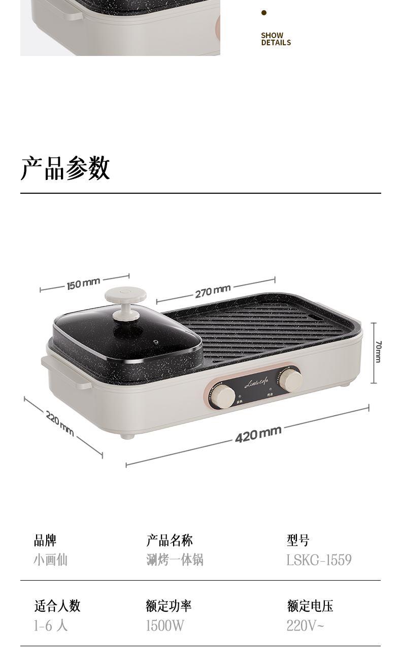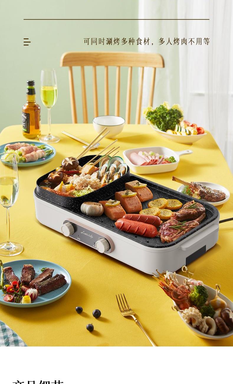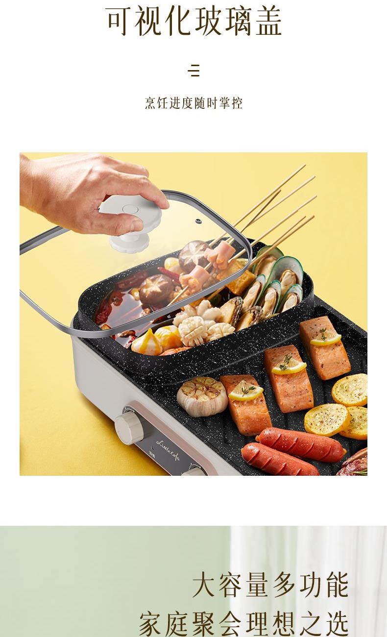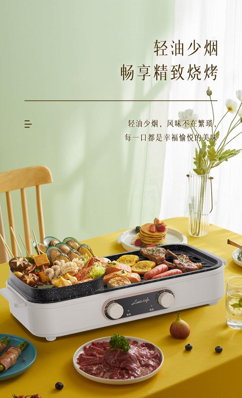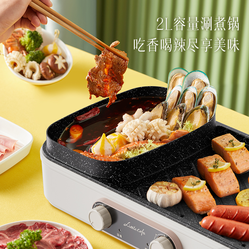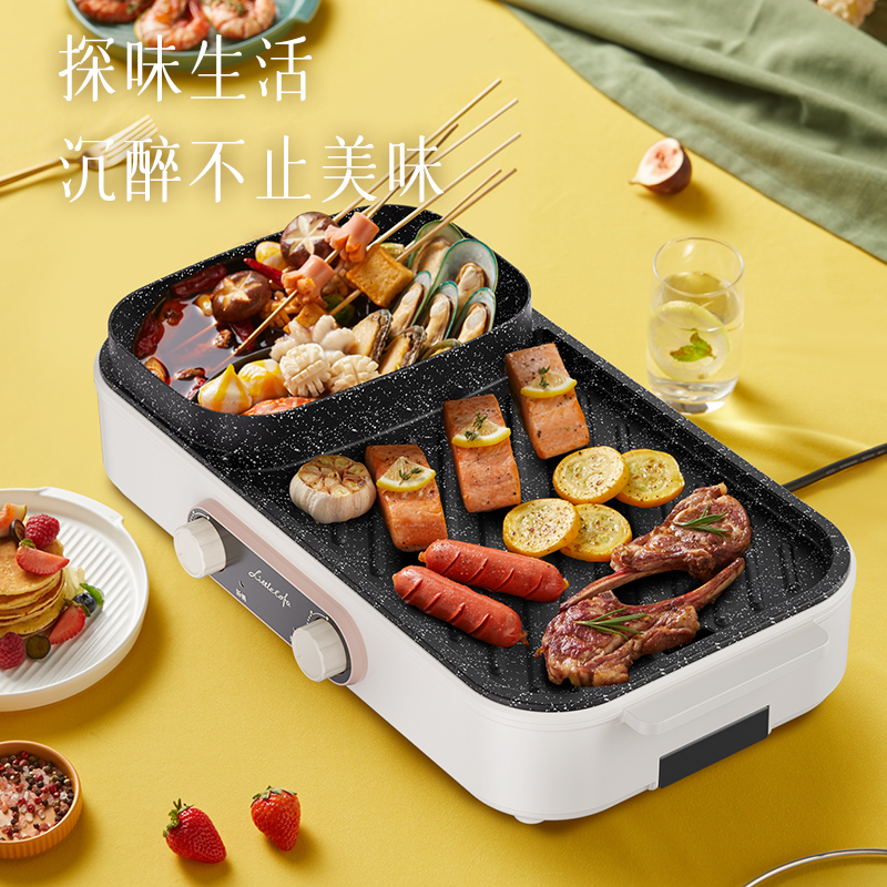 材 质:胶木+压铸+高硅玻璃+PP 功 率:1500W(烤盘800W 火锅700W) 火锅容量:2L 款 式:旋钮款 专业级温度控制系统,把握火候,口感很对味。 1500W大功率,环形立体速热 可涮可烤,独立控温,分区调控,互不干扰 轻油少烟,畅享精致烧烤