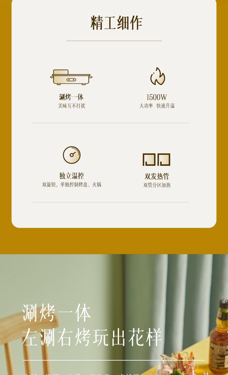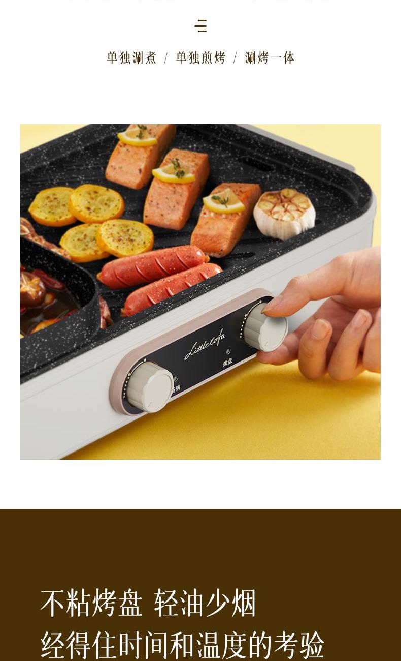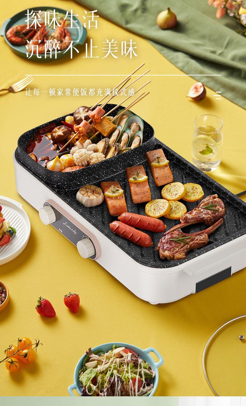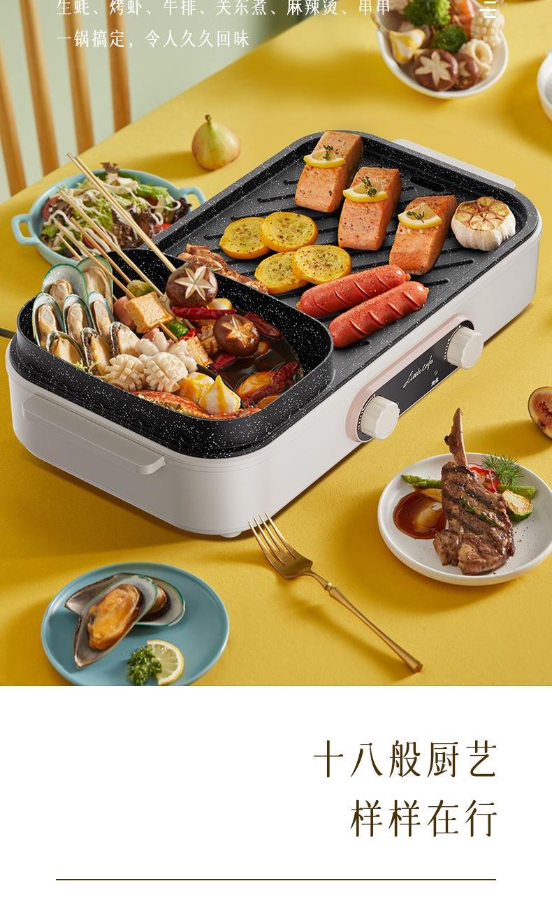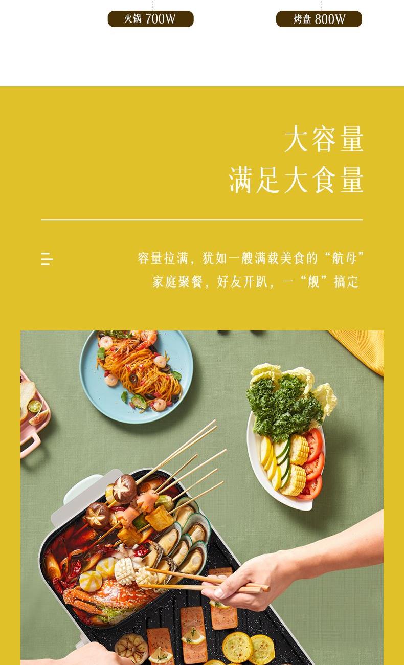材 质:胶木+压铸+高硅玻璃+PP 功 率:1500W(烤盘800W 火锅700W) 火锅容量:2L 款 式:旋钮款 专业级温度控制系统,把握火候,口感很对味。 1500W大功率,环形立体速热 可涮可烤,独立控温,分区调控,互不干扰 轻油少烟,畅享精致烧烤