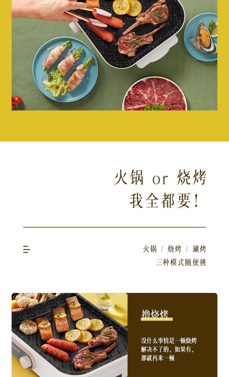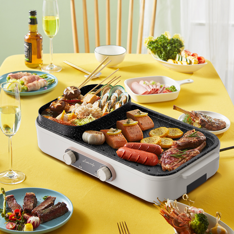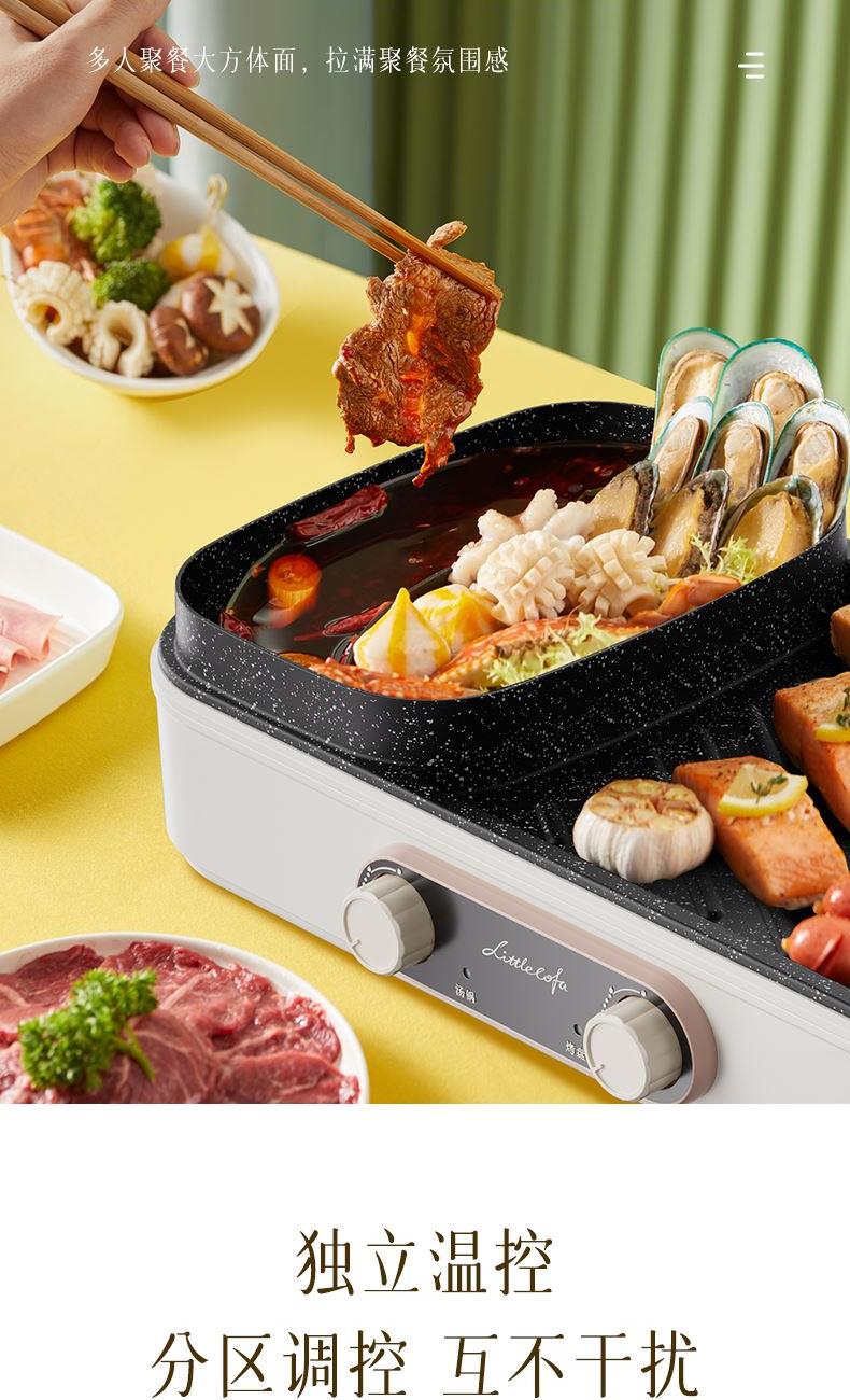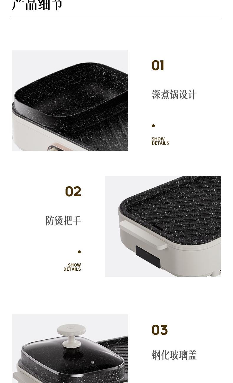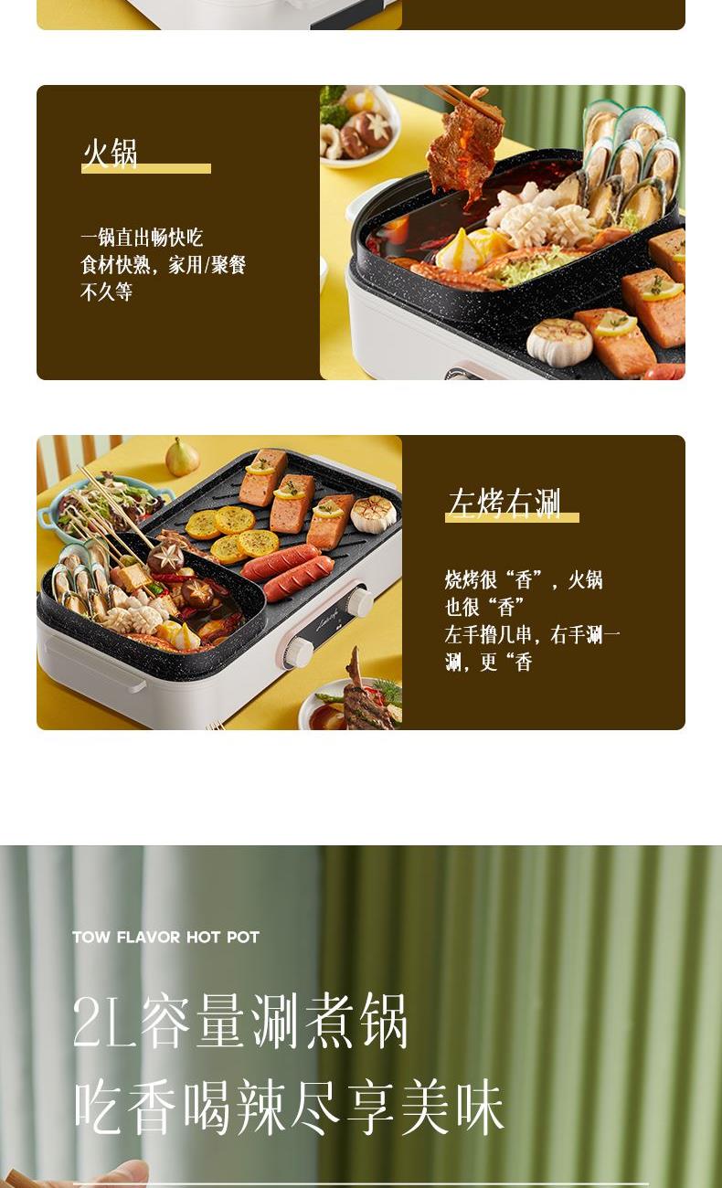 材 质:胶木+压铸+高硅玻璃+PP 功 率:1500W(烤盘800W 火锅700W) 火锅容量:2L 款 式:旋钮款 专业级温度控制系统,把握火候,口感很对味。 1500W大功率,环形立体速热 可涮可烤,独立控温,分区调控,互不干扰 轻油少烟,畅享精致烧烤