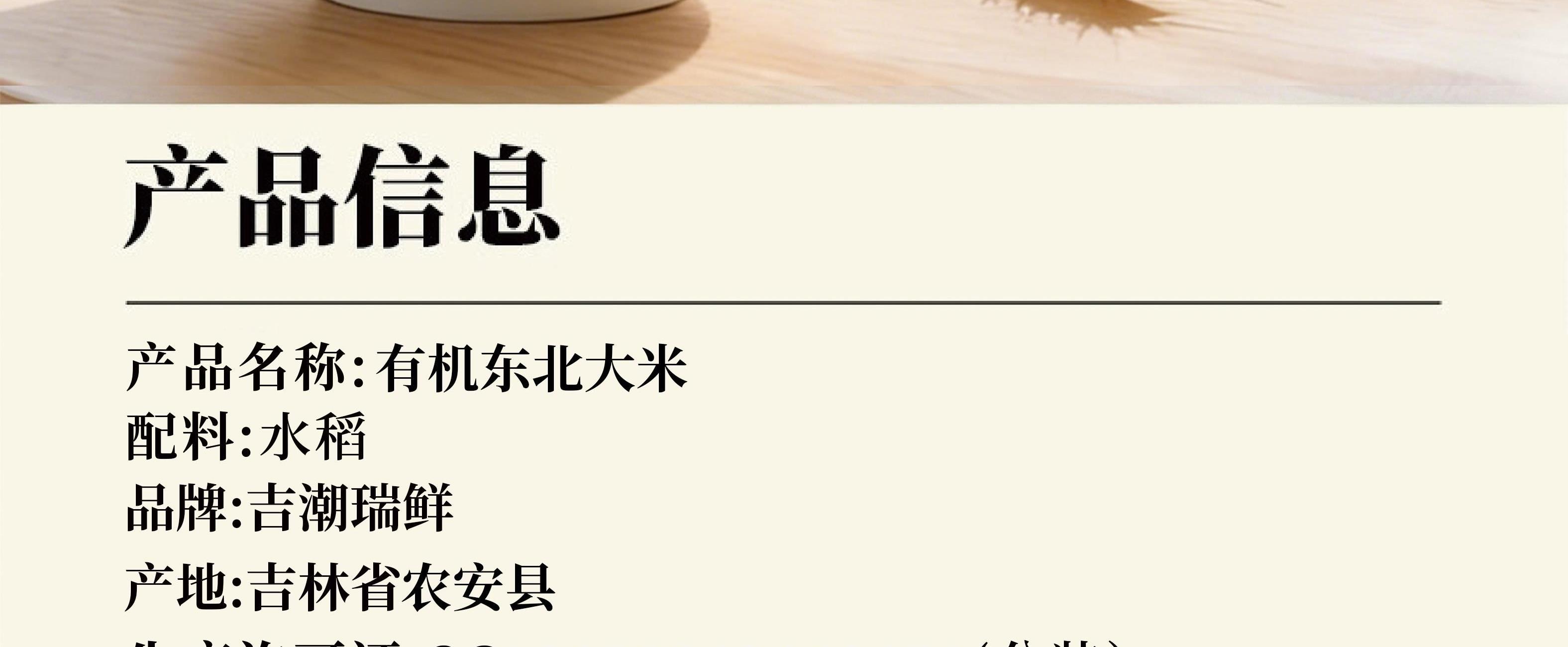 吉潮瑞鲜有机东北大米5公斤真空 配料:水稻 产地:吉林省农安县 质量等级:一级质量 净含量:5kg 保质期:12个月