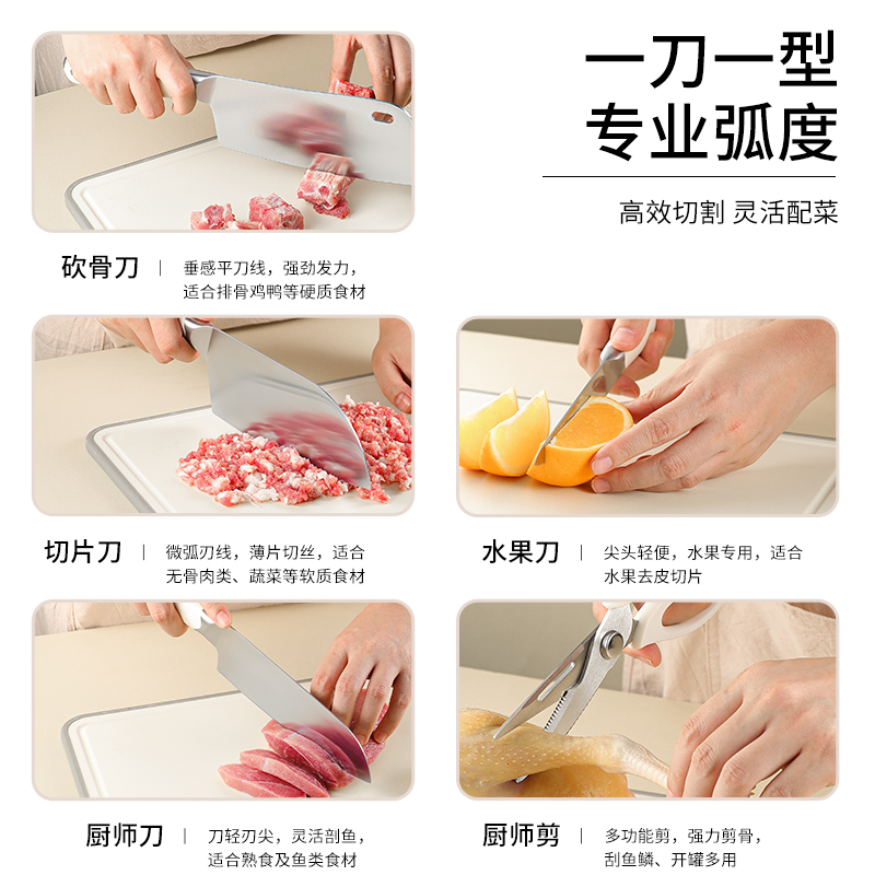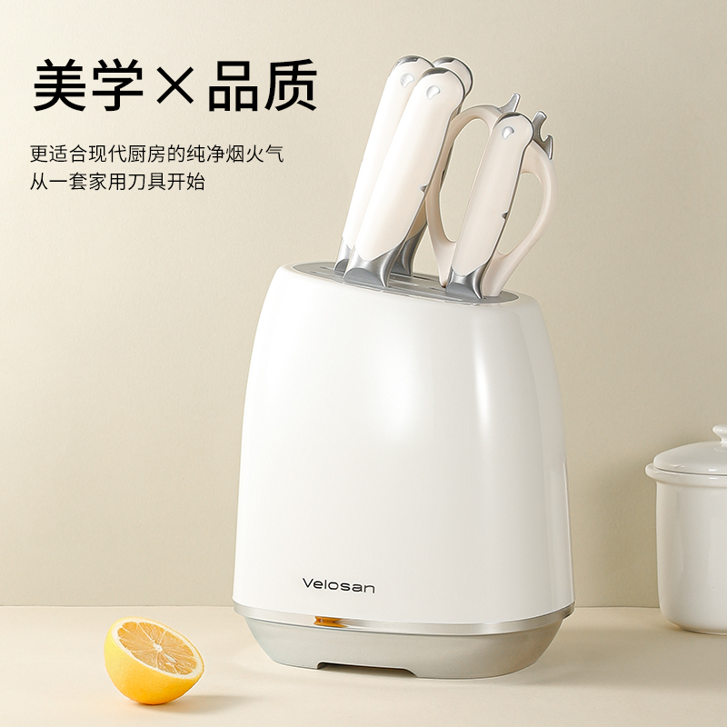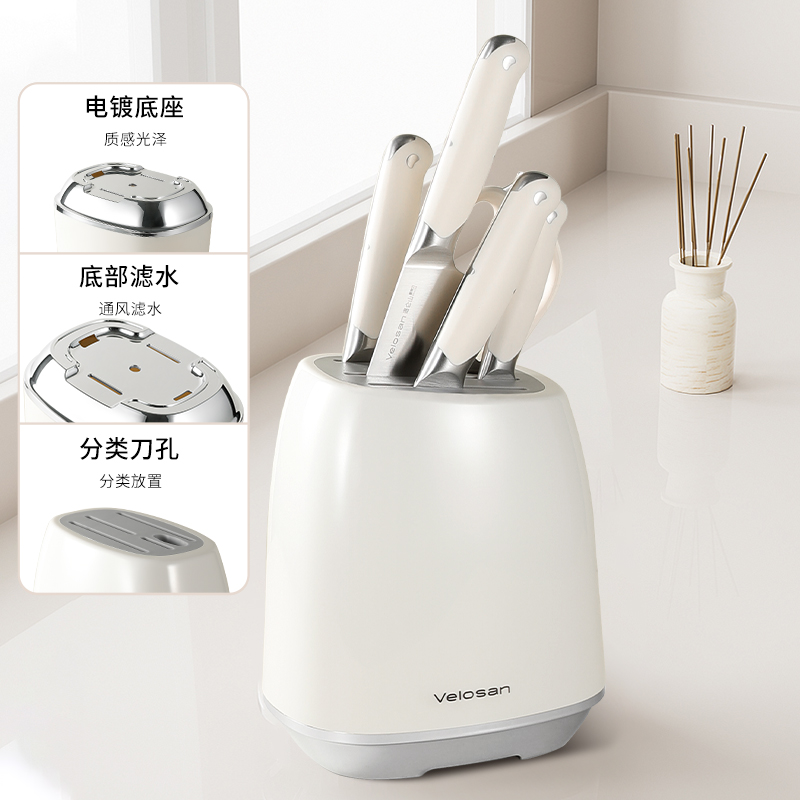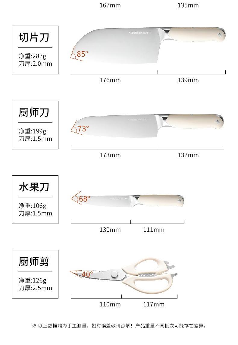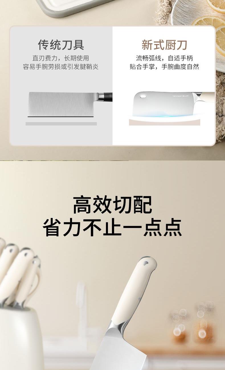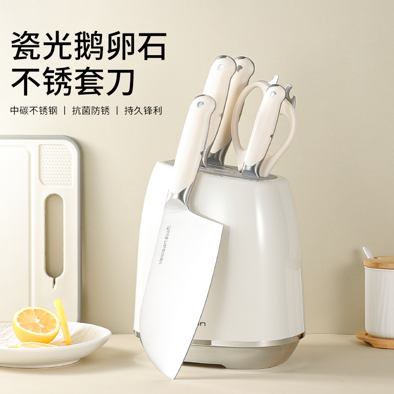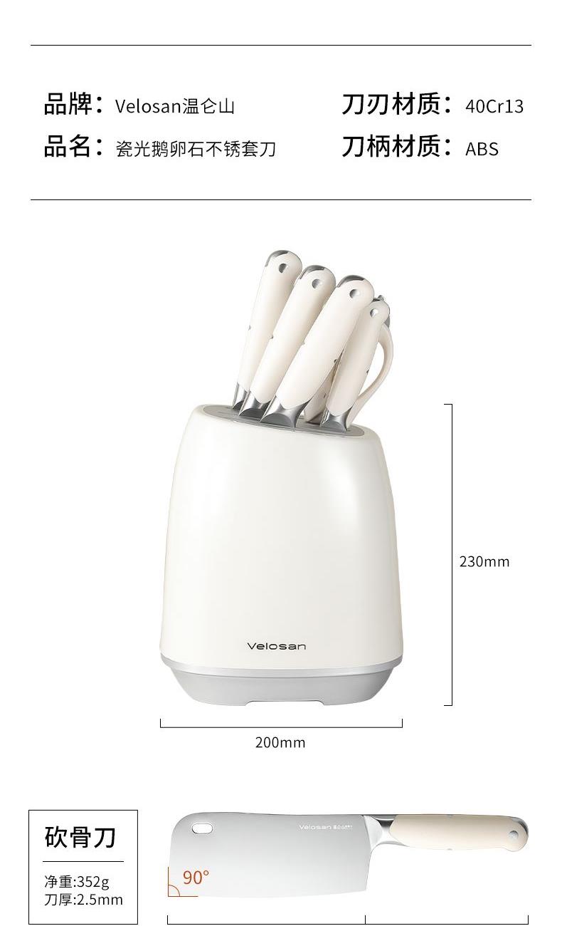 【型号】VE075 【SKU】VE075-WW02 【材质】不锈钢+PP 【规格】砍骨刀、菜刀、厨师刀、水果刀、厨师剪、收纳底座共6件。 【净重】1.4kg 【毛重】1.8kg 【包装方式】邮购盒 【包装尺寸】160*235*355 mm 【颜色】 奶白色 4CR13材质,持久锋利,无需磨刃; 物理防锈,无需涂层; 防滑手柄,舒适握感; 可拆刀座,清洗方便; 收纳自如,秩序规整。