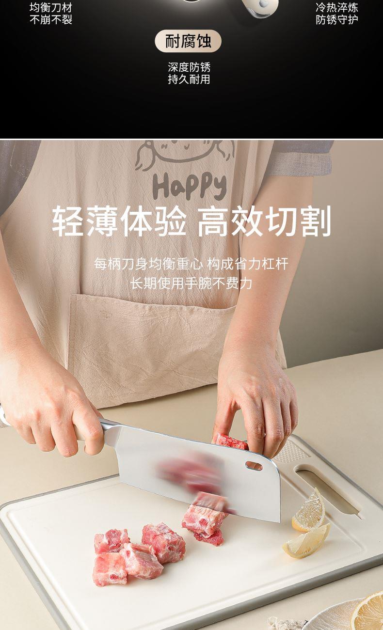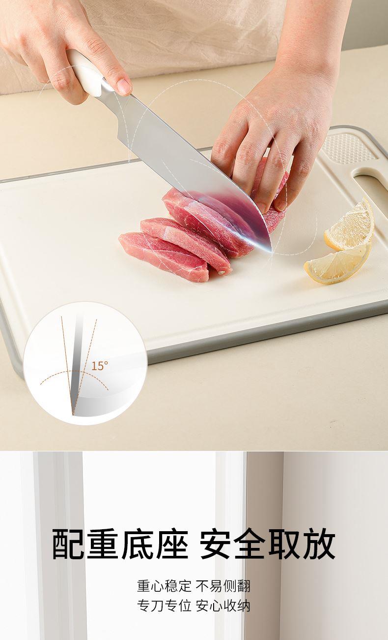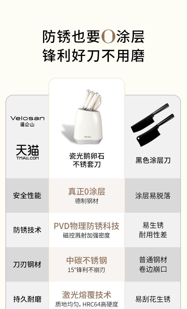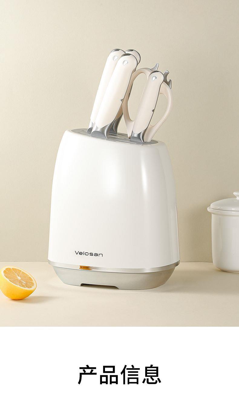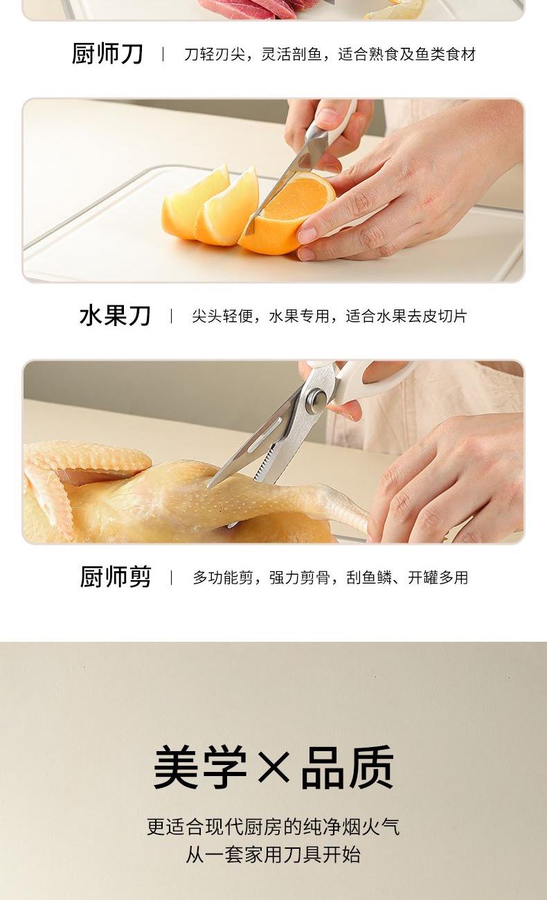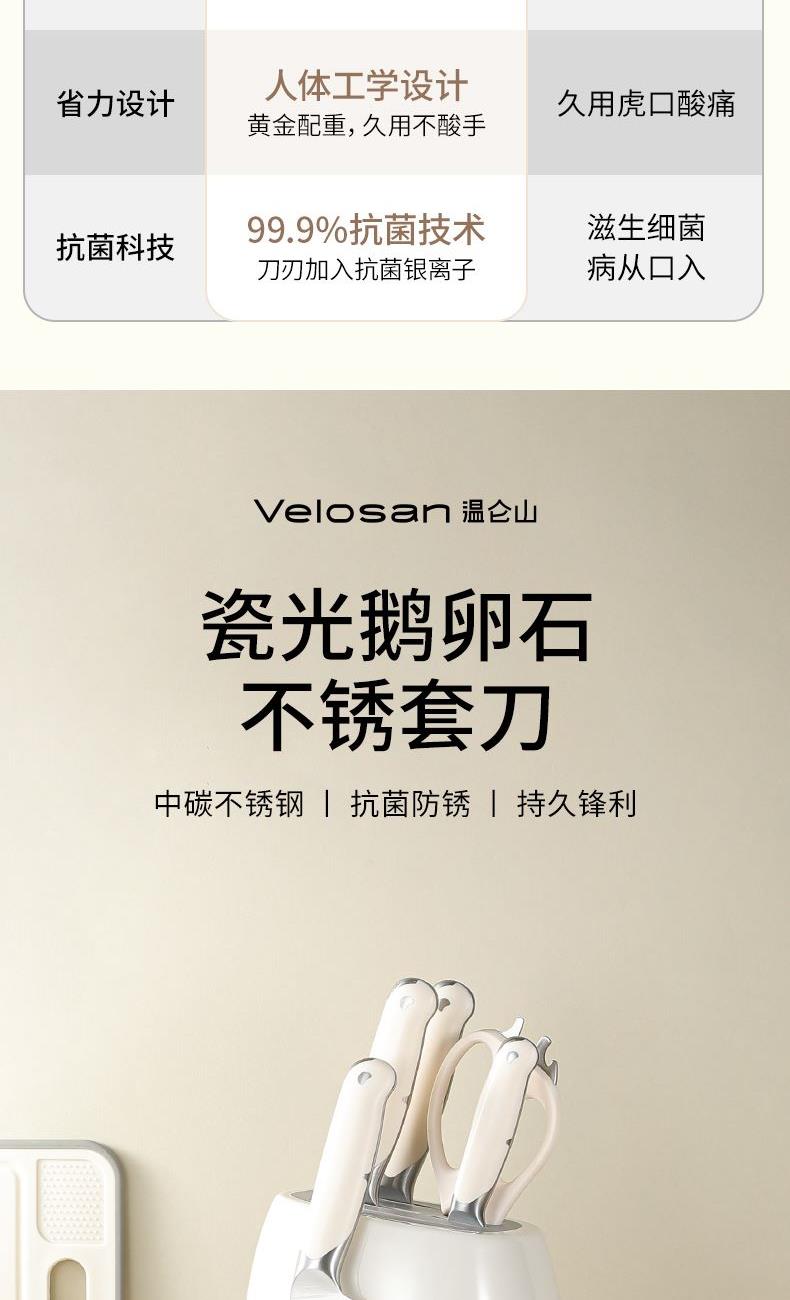 【型号】VE075 【SKU】VE075-WW02 【材质】不锈钢+PP 【规格】砍骨刀、菜刀、厨师刀、水果刀、厨师剪、收纳底座共6件。 【净重】1.4kg 【毛重】1.8kg 【包装方式】邮购盒 【包装尺寸】160*235*355 mm 【颜色】 奶白色 4CR13材质,持久锋利,无需磨刃; 物理防锈,无需涂层; 防滑手柄,舒适握感; 可拆刀座,清洗方便; 收纳自如,秩序规整。