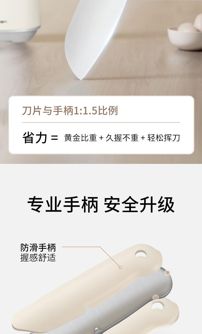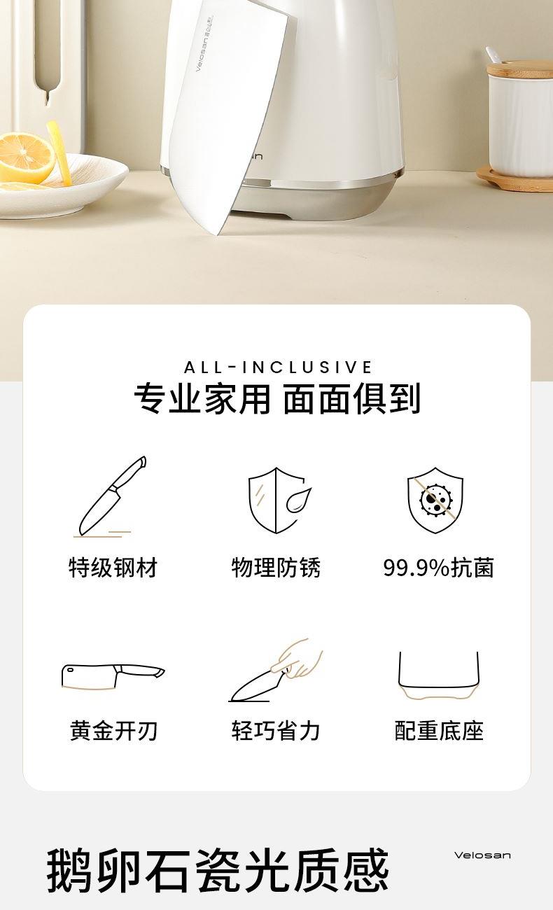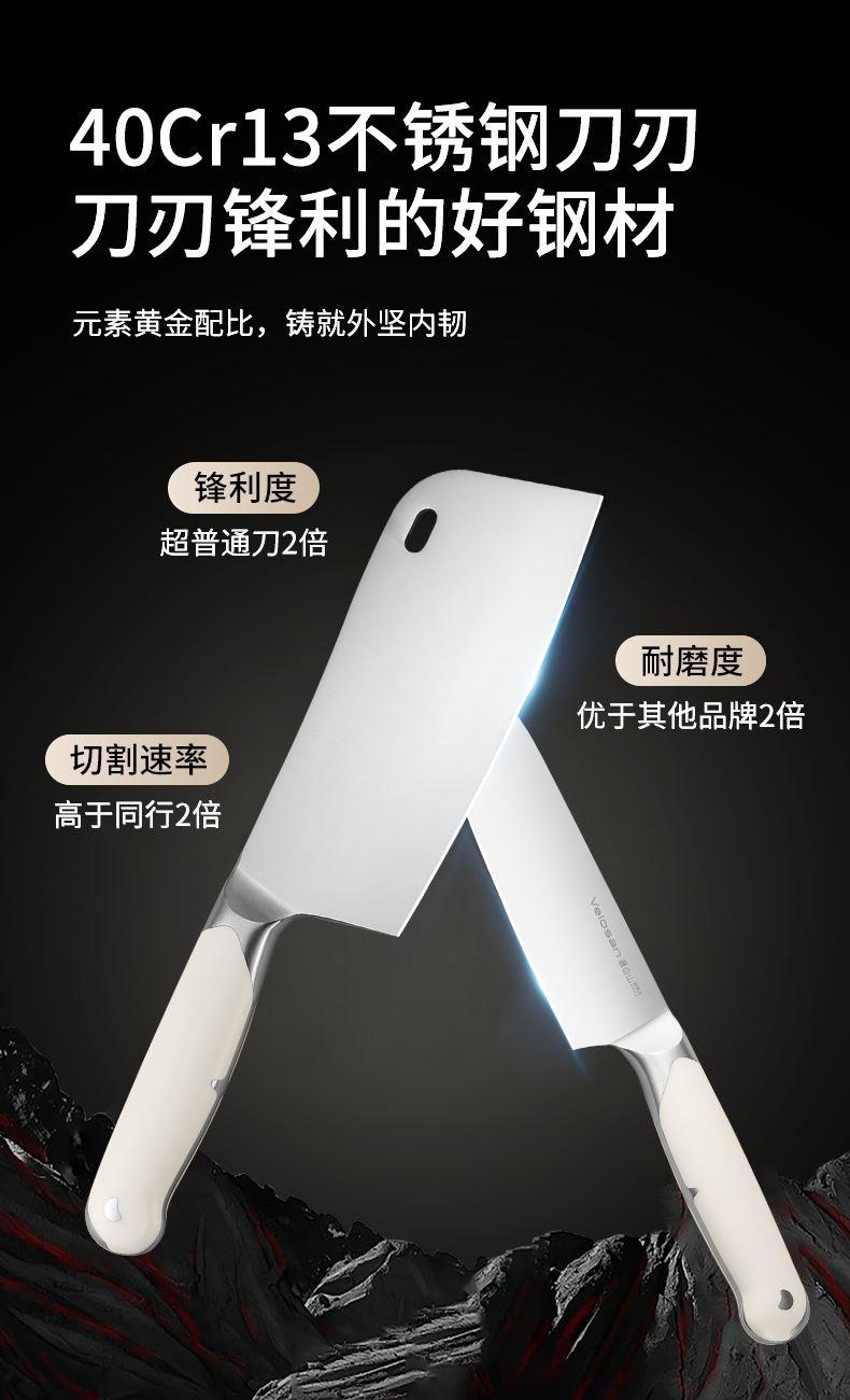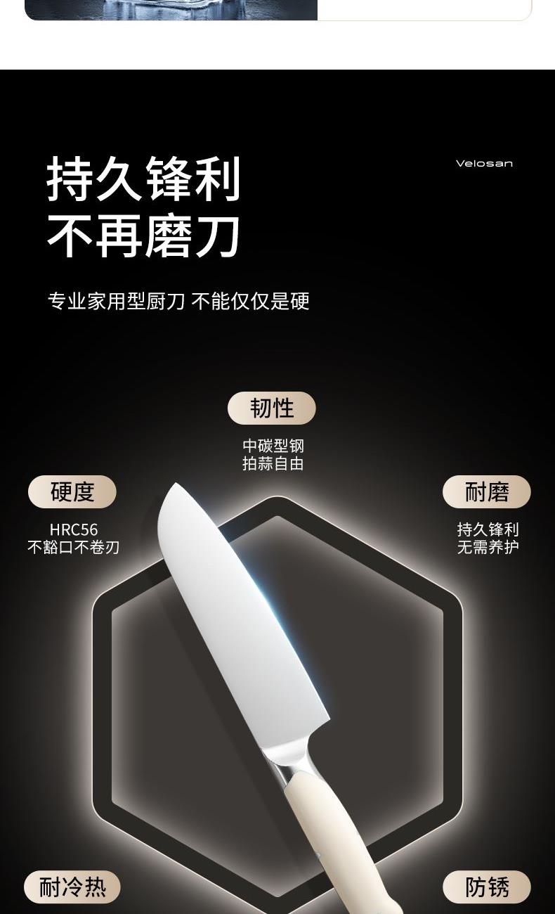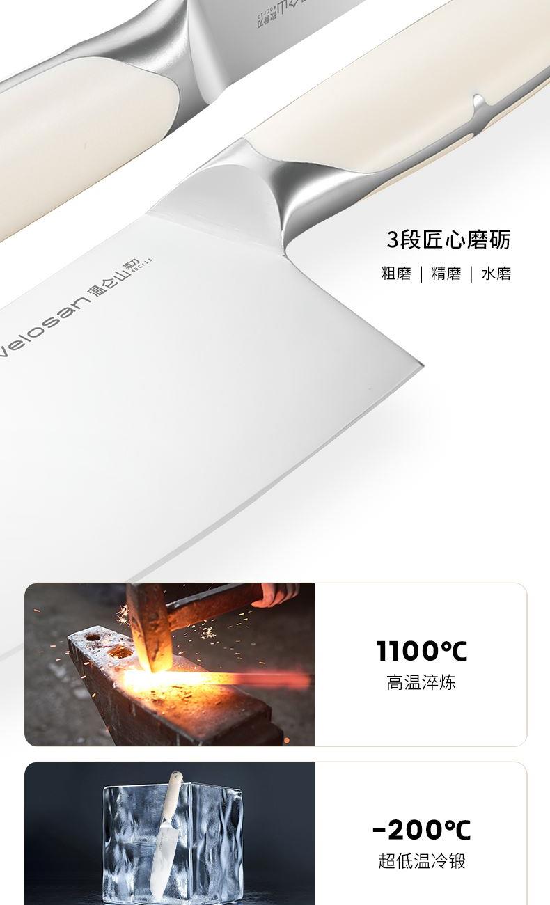 【型号】VE075 【SKU】VE075-WW02 【材质】不锈钢+PP 【规格】砍骨刀、菜刀、厨师刀、水果刀、厨师剪、收纳底座共6件。 【净重】1.4kg 【毛重】1.8kg 【包装方式】邮购盒 【包装尺寸】160*235*355 mm 【颜色】 奶白色 4CR13材质,持久锋利,无需磨刃; 物理防锈,无需涂层; 防滑手柄,舒适握感; 可拆刀座,清洗方便; 收纳自如,秩序规整。