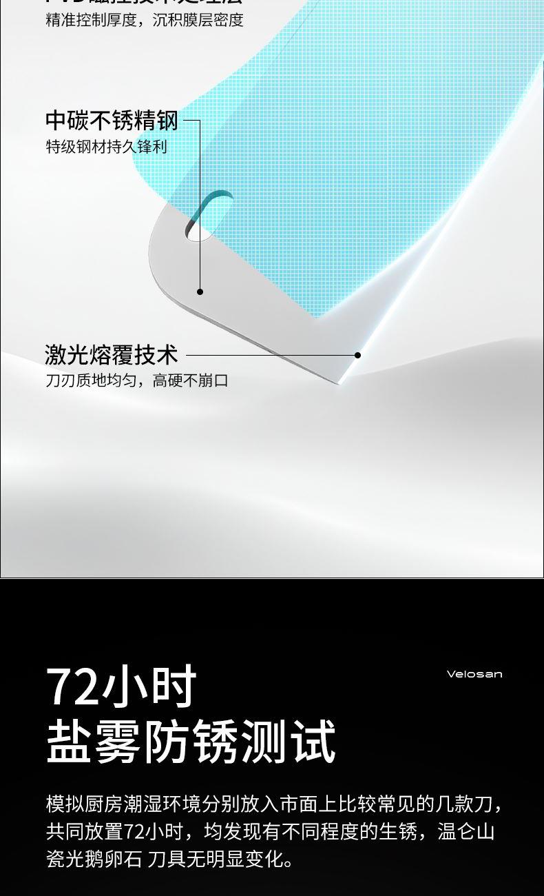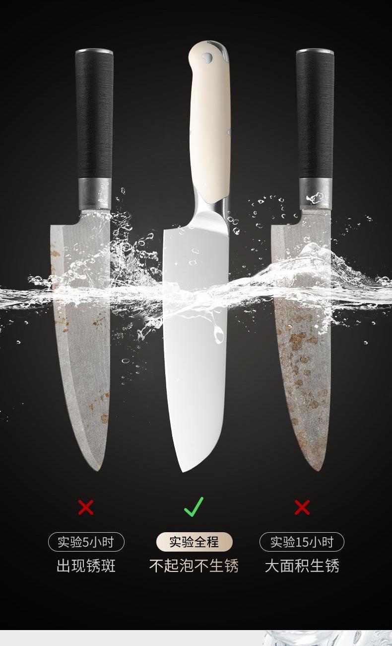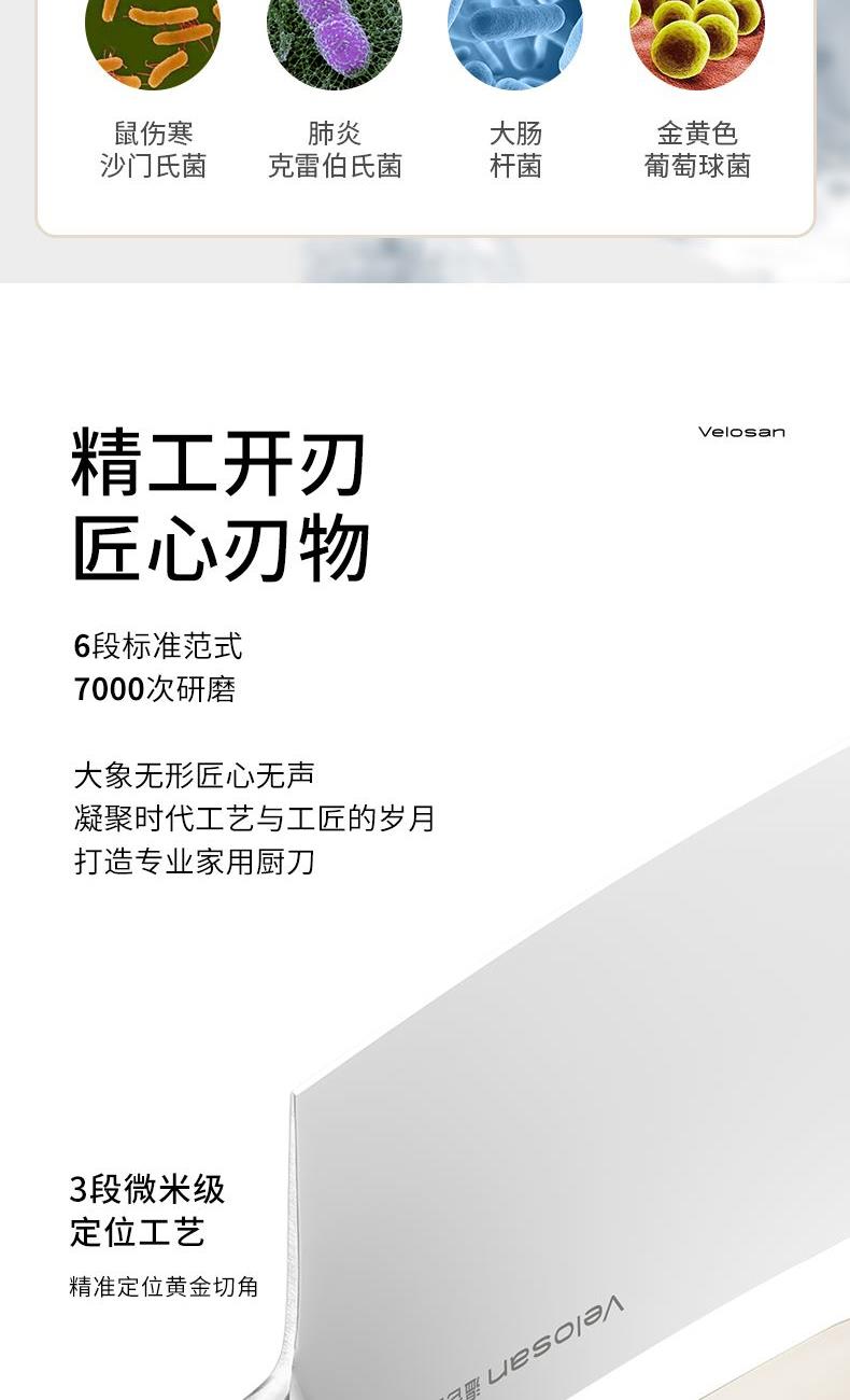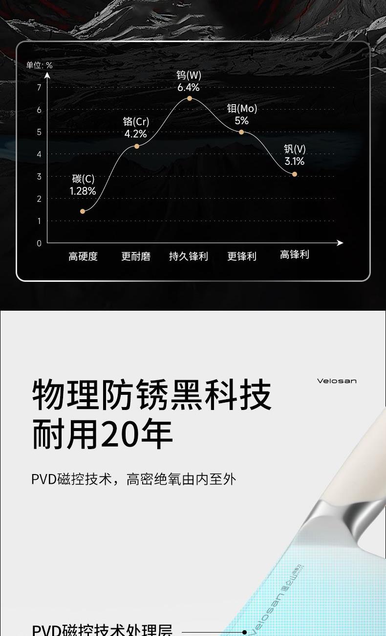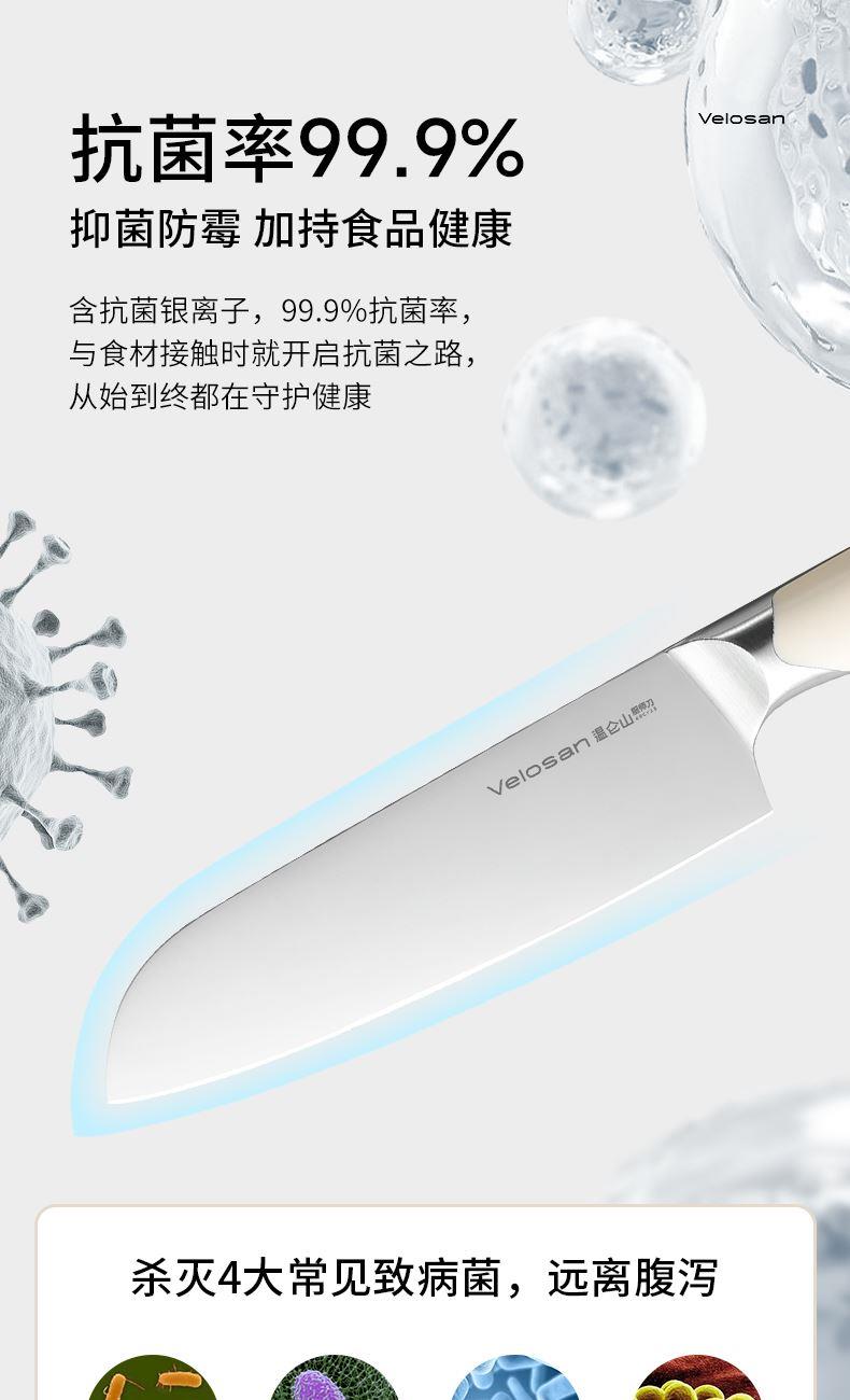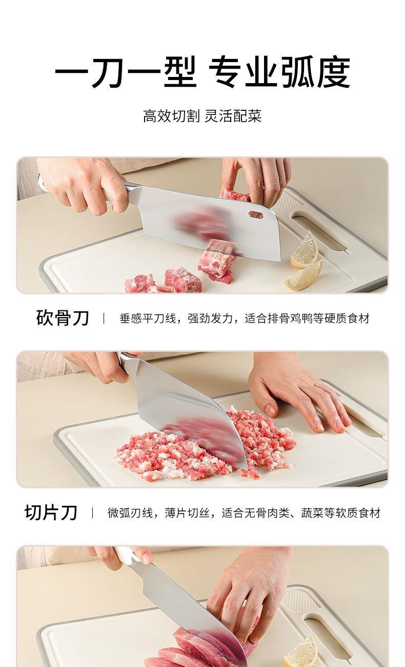 【型号】VE075 【SKU】VE075-WW02 【材质】不锈钢+PP 【规格】砍骨刀、菜刀、厨师刀、水果刀、厨师剪、收纳底座共6件。 【净重】1.4kg 【毛重】1.8kg 【包装方式】邮购盒 【包装尺寸】160*235*355 mm 【颜色】 奶白色 4CR13材质,持久锋利,无需磨刃; 物理防锈,无需涂层; 防滑手柄,舒适握感; 可拆刀座,清洗方便; 收纳自如,秩序规整。