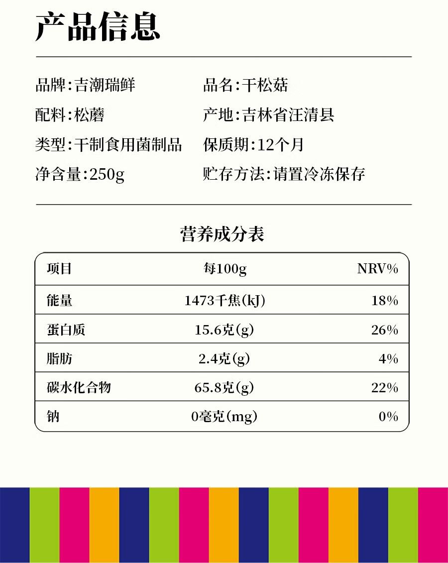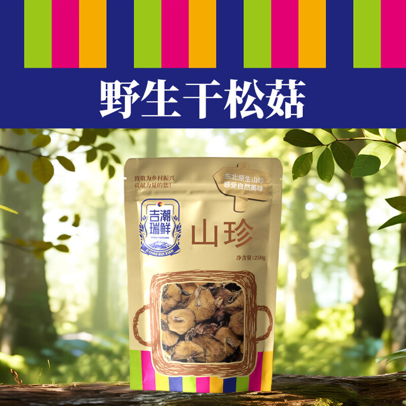 吉潮瑞鲜野生干松菇250G*1袋 配料:松蘑 产地:吉林省汪清县 类型:干制食用菌制品 保质期:12个月净含量:250g 贮存方法:请置冷冻保存。