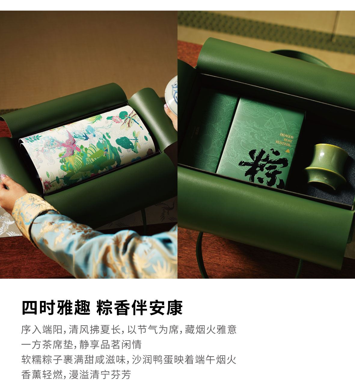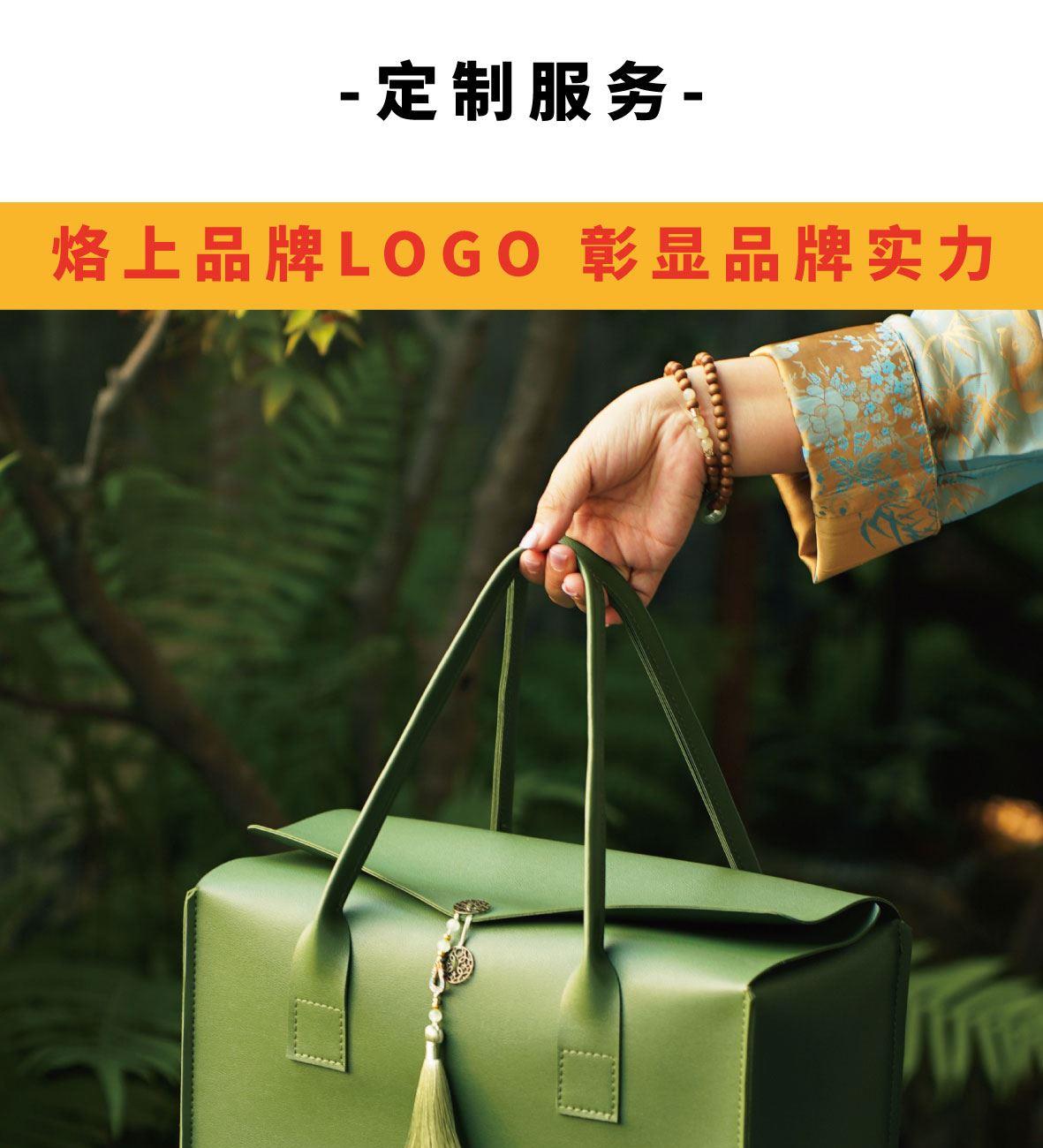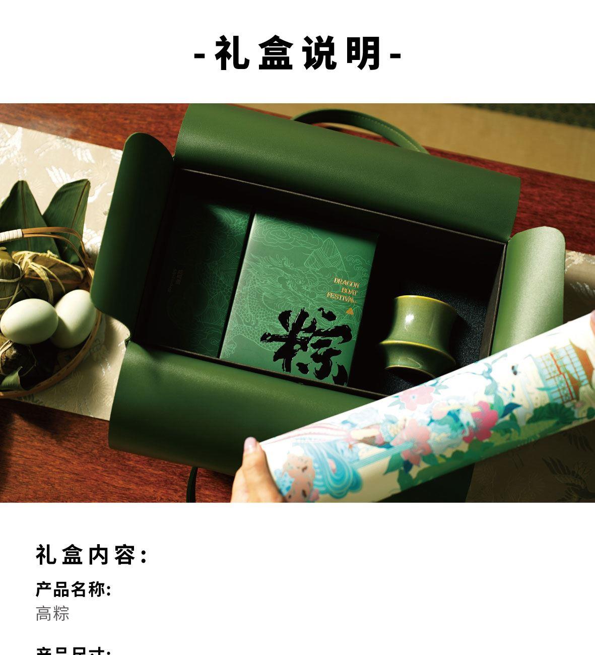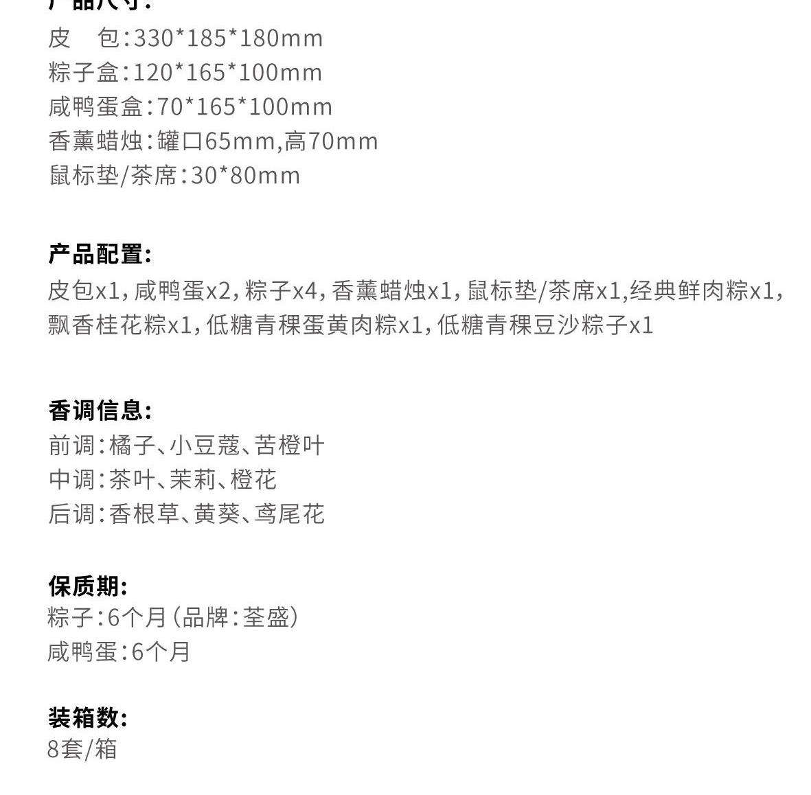 产品尺寸: 皮包:330*185*180mm 粽子盒:120*165*100mm 咸鸭蛋盒:70*165*100mm 香薰蜡烛:罐口65mm,高70mm 鼠标垫/茶席:30*80mm 产品配置公 皮包x1,咸鸭蛋x2,粽子x4,香薰蜡烛x1,鼠标垫/茶席x1,经典鲜肉粽x1,飘香桂花粽x1,低糖青稞蛋黄肉粽x1,低糖青稞豆沙粽子x1 香调信息: 前调:橘子、小豆蔻、苦橙叶 中调:茶叶、茉莉、橙花 后调:香根草、黄葵、鸢尾花 保质期: 粽子:6个月 咸鸭蛋:6个月