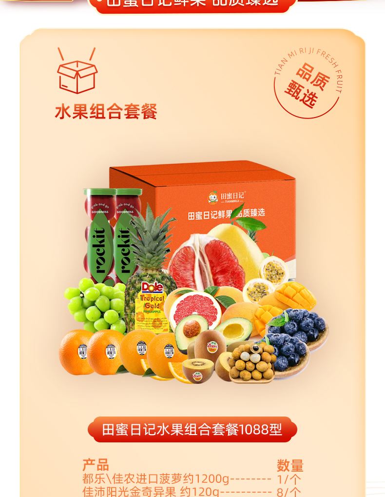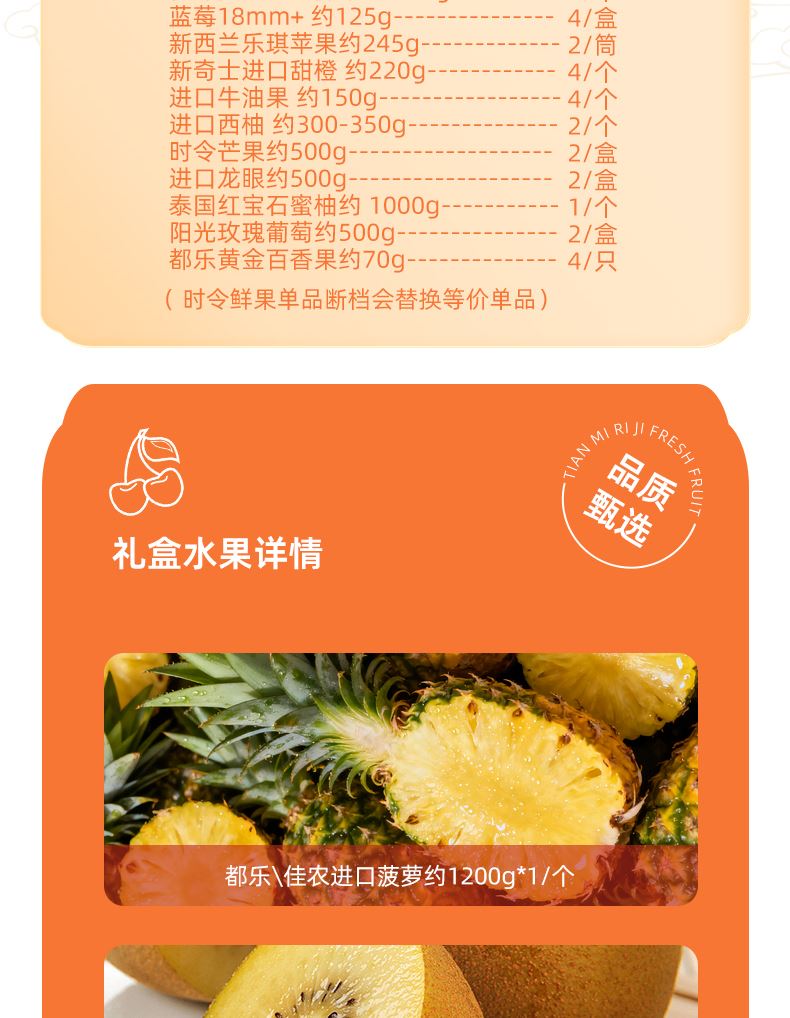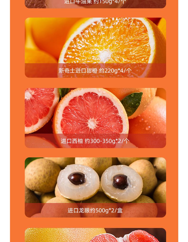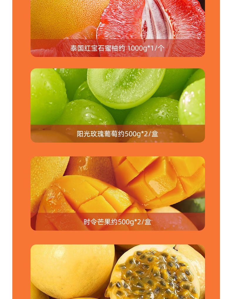 进口西柚 约300-350g*2/个 时令芒果约500g*2/盒 进口龙眼约500g*2/盒 泰国红宝石蜜柚约 1000g*1/个 阳光玫瑰葡萄约500g*2/盒) 都乐黄金百香果约70g*4/只 ( 时令鲜果单品断档会替换等价单品)"