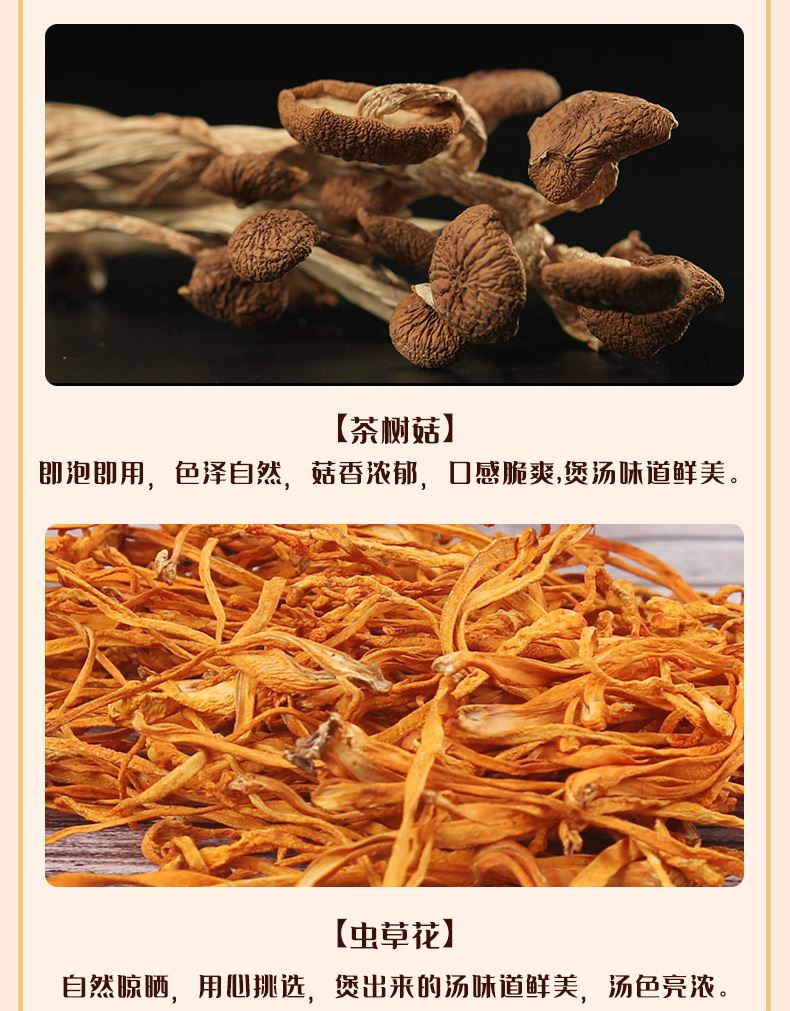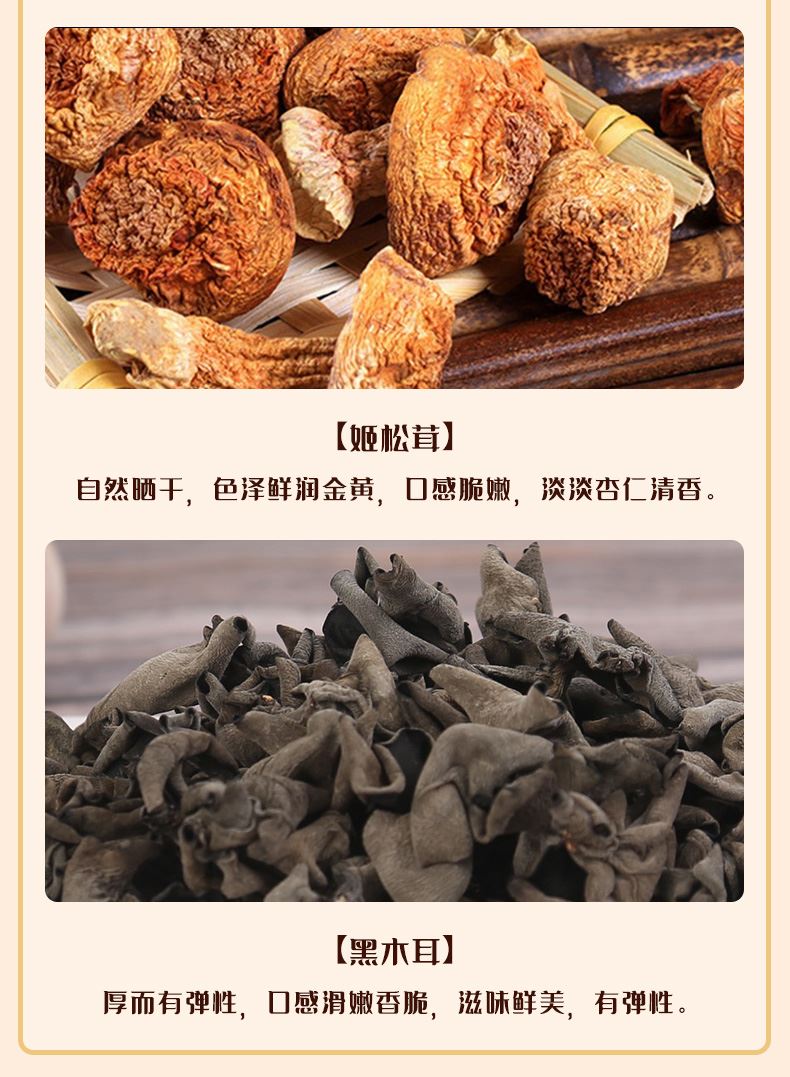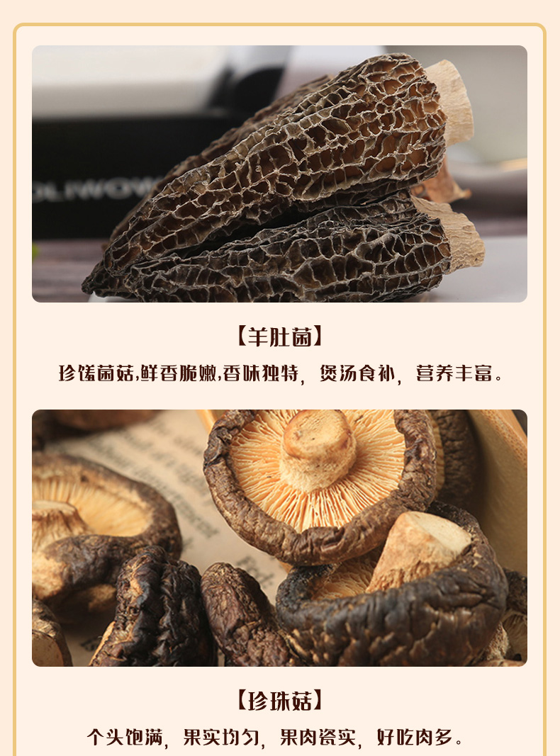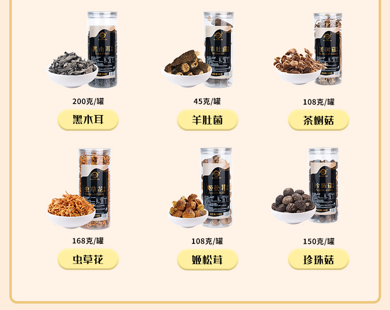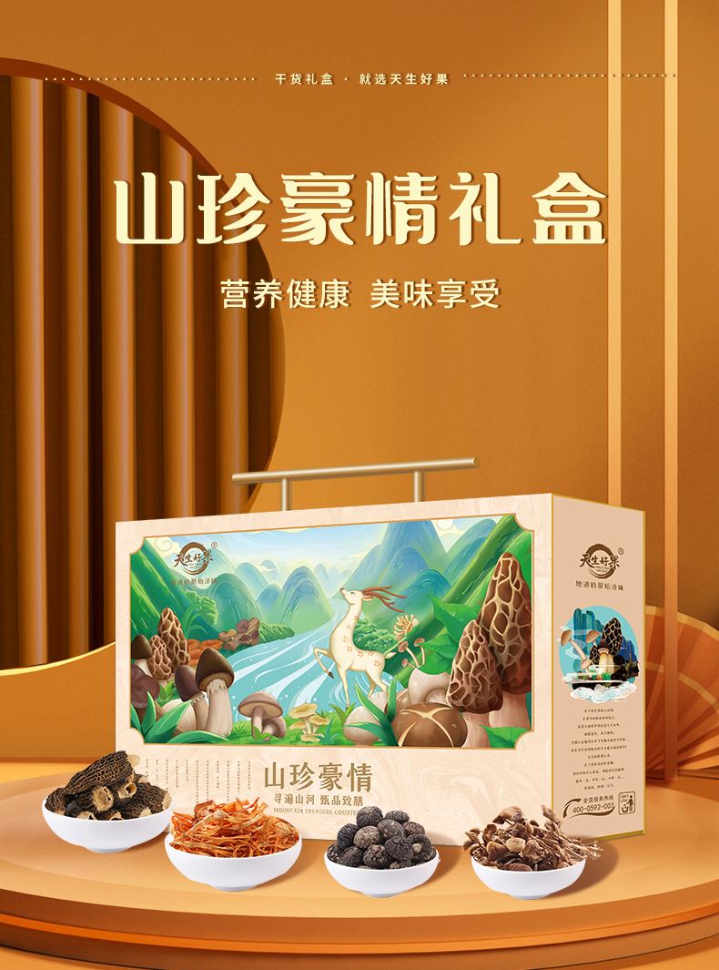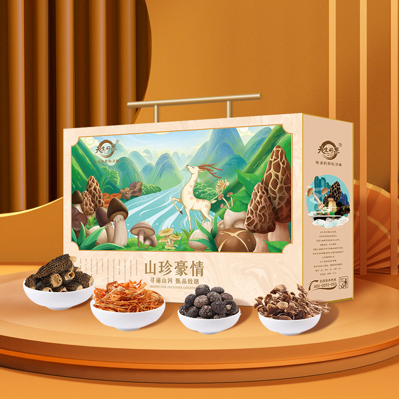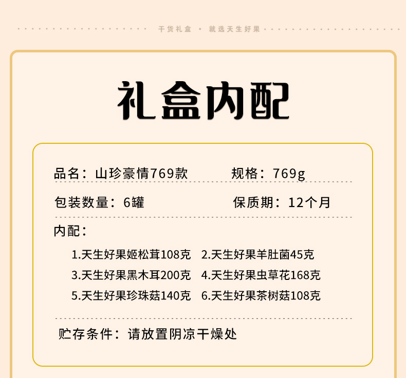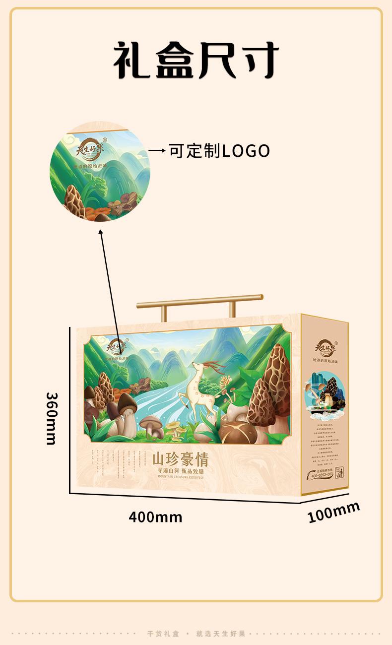 彩盒尺寸:450*100*360mm 产品规格:769克 1.天生好果姬松茸108克 2.天生好果羊肚菌45克 3.天生好果虫草花168克 4.天生好果珍珠菇140克 5.天生好果茶树菇108克 6.天生好果黑木耳200克