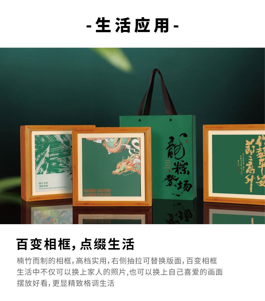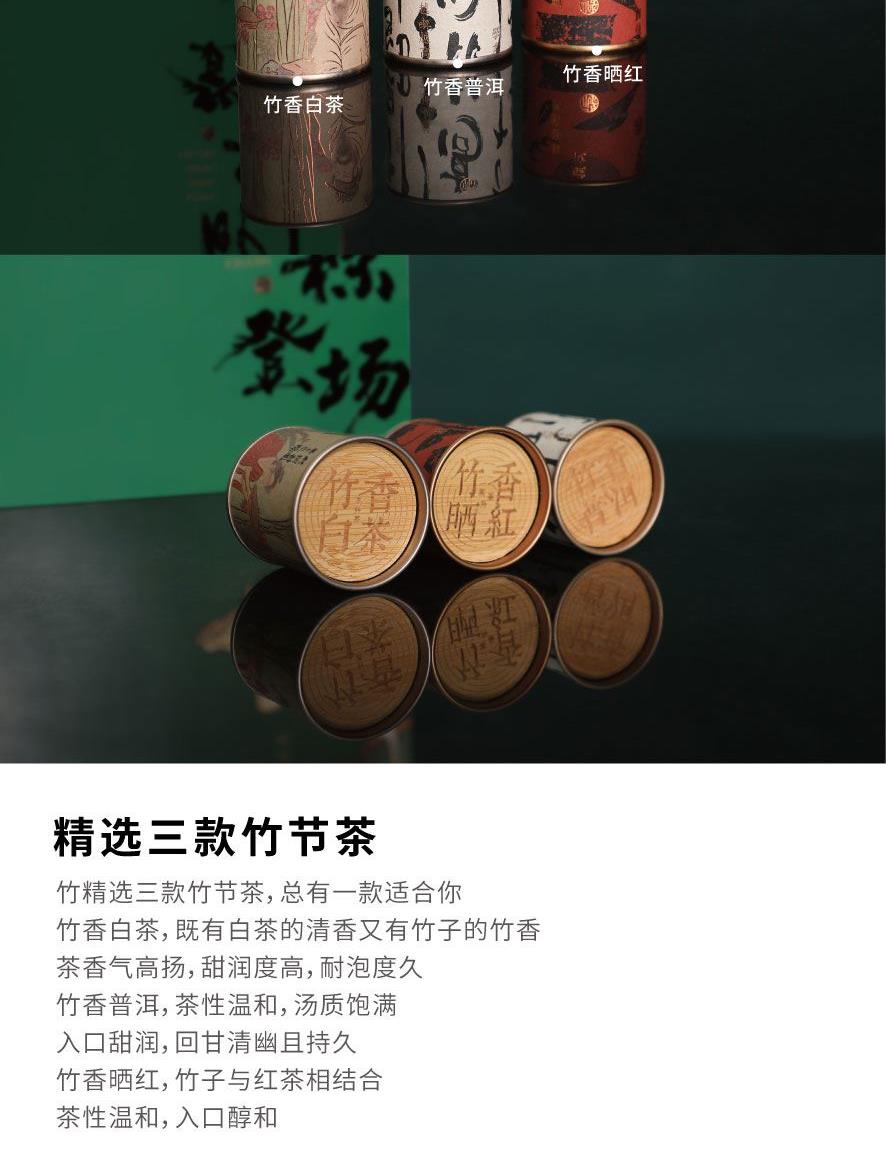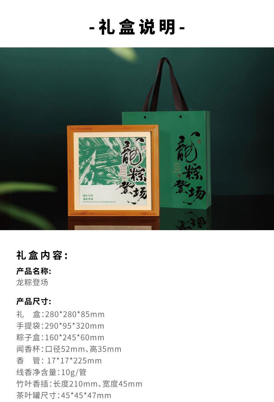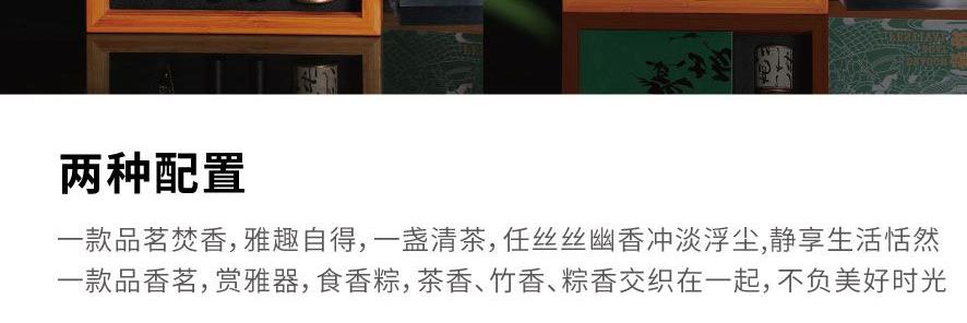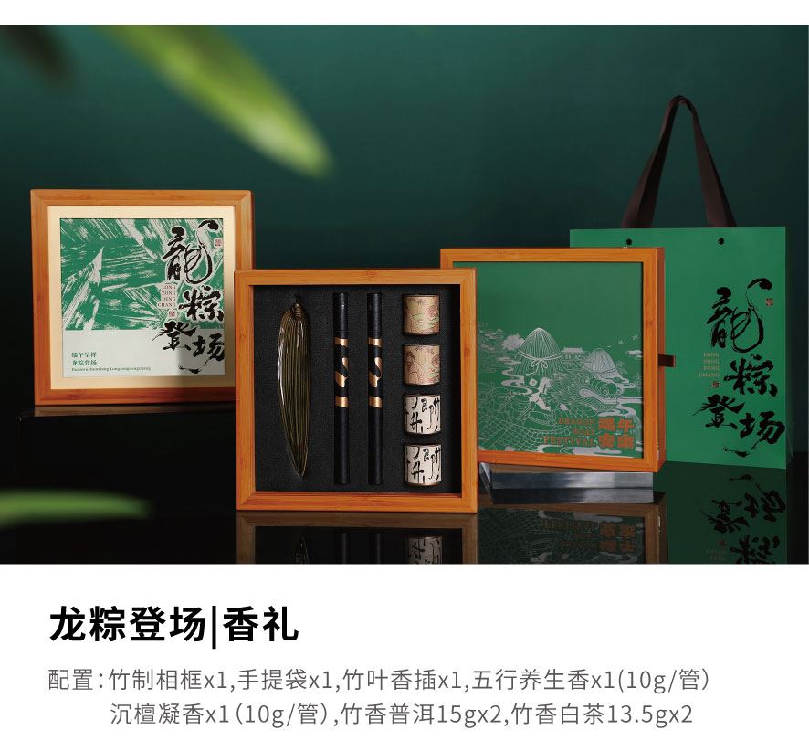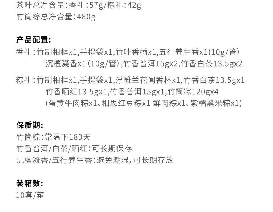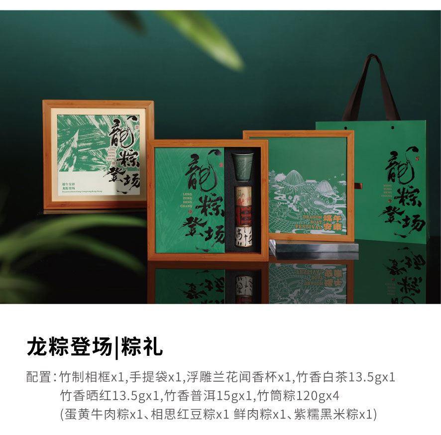 粽礼:竹制相框x1,手提袋x1,浮雕兰花闻香杯x1,竹香白茶13.5gx1竹香晒红13.5gx1,竹香普洱15gx1,竹筒粽120gx4