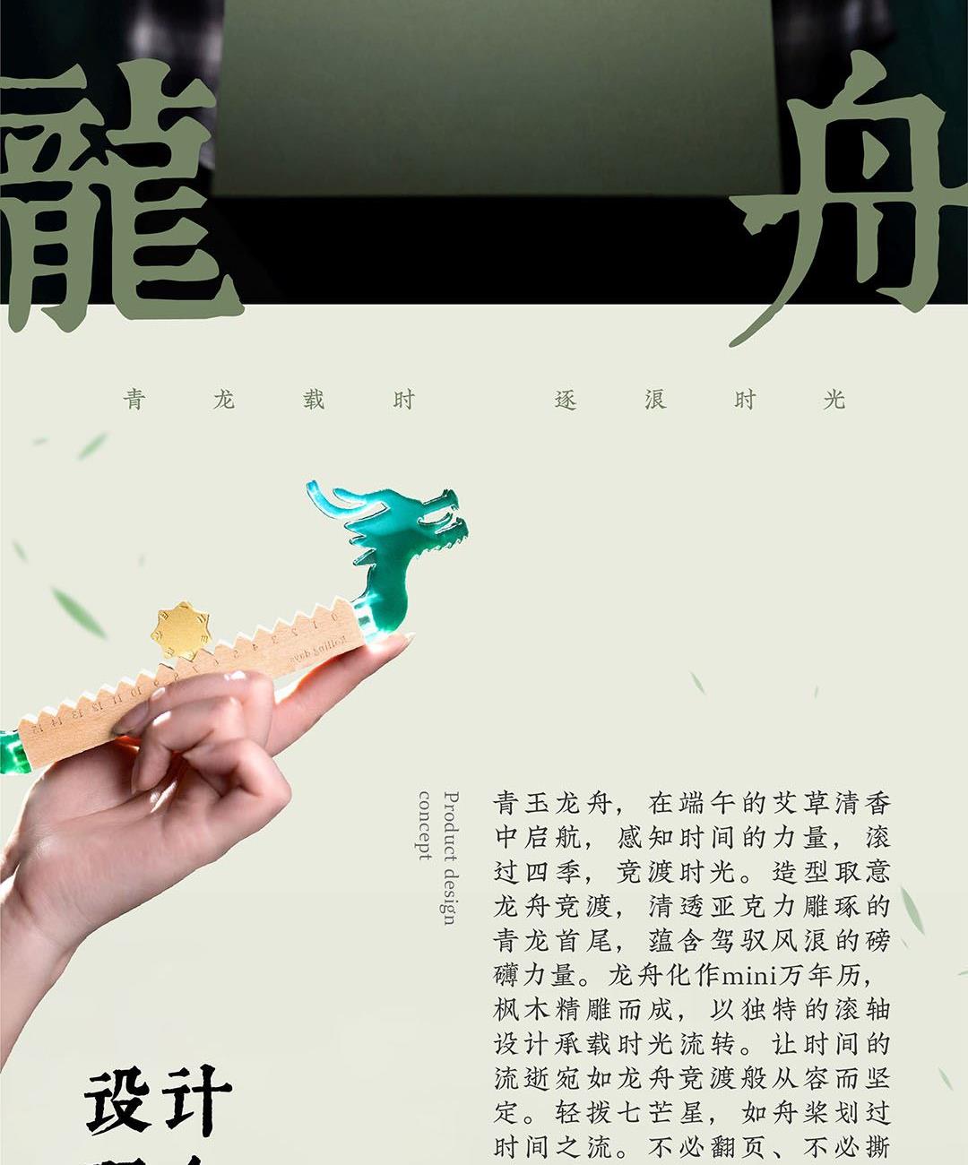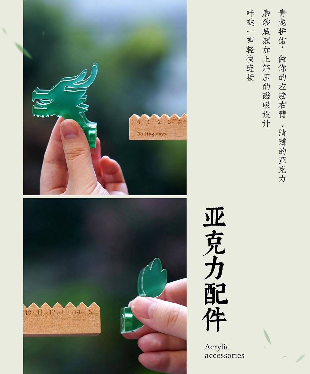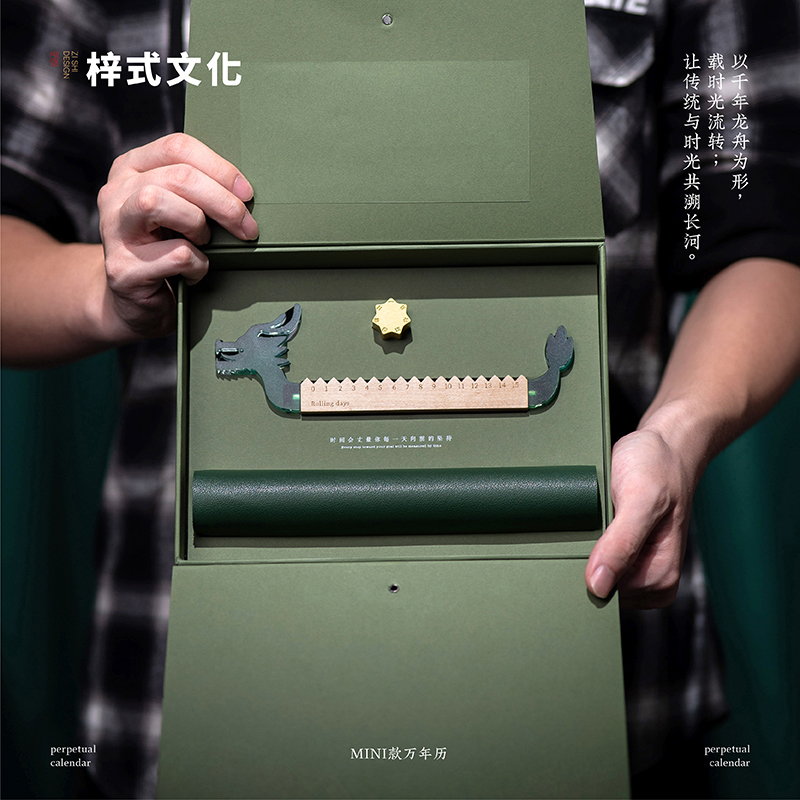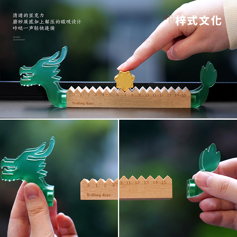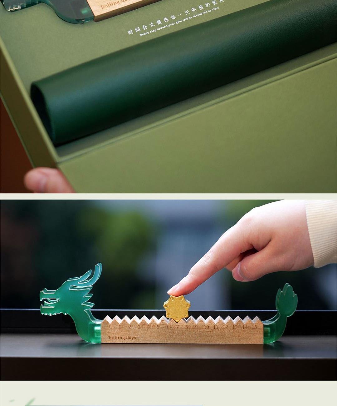 青玉龙舟,在端午的艾草清香中启航,感知时间的力量,滚过四季,竞渡时光。造型取意龙舟竞渡,清透亚克力雕琢的青龙首尾,蕴含驾驭风浪的磅礴力量。龙舟化作mini万年历,枫木精雕而成,以独特的滚轴设计承载时光流转。让时间的流逝宛如龙舟竞渡般从容而坚定。轻拨七芒星,如舟桨划过时间之流。不必翻页、不必撕纸,轻轻一拨,日子便如龙舟前行,静默而有力。 礼盒清单 1.枫木月份底座 2.七芒星滚轮 3.PU多用垫 4.龙头/龙尾 5.礼盒 6.礼袋