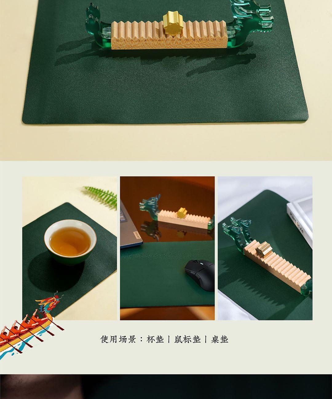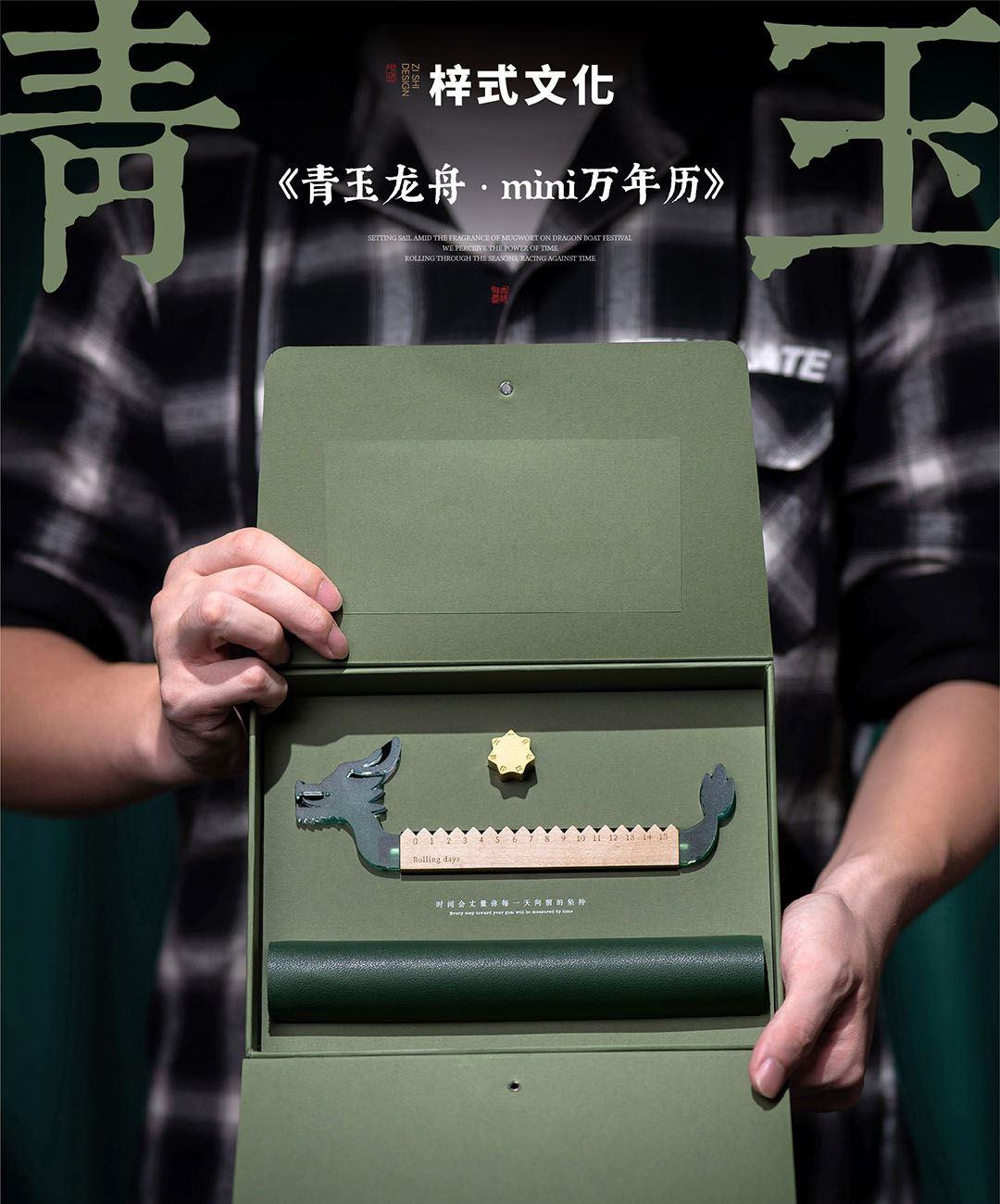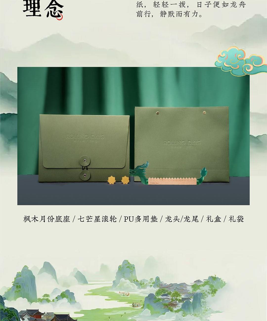 青玉龙舟,在端午的艾草清香中启航,感知时间的力量,滚过四季,竞渡时光。造型取意龙舟竞渡,清透亚克力雕琢的青龙首尾,蕴含驾驭风浪的磅礴力量。龙舟化作mini万年历,枫木精雕而成,以独特的滚轴设计承载时光流转。让时间的流逝宛如龙舟竞渡般从容而坚定。轻拨七芒星,如舟桨划过时间之流。不必翻页、不必撕纸,轻轻一拨,日子便如龙舟前行,静默而有力。 礼盒清单 1.枫木月份底座 2.七芒星滚轮 3.PU多用垫 4.龙头/龙尾 5.礼盒 6.礼袋
