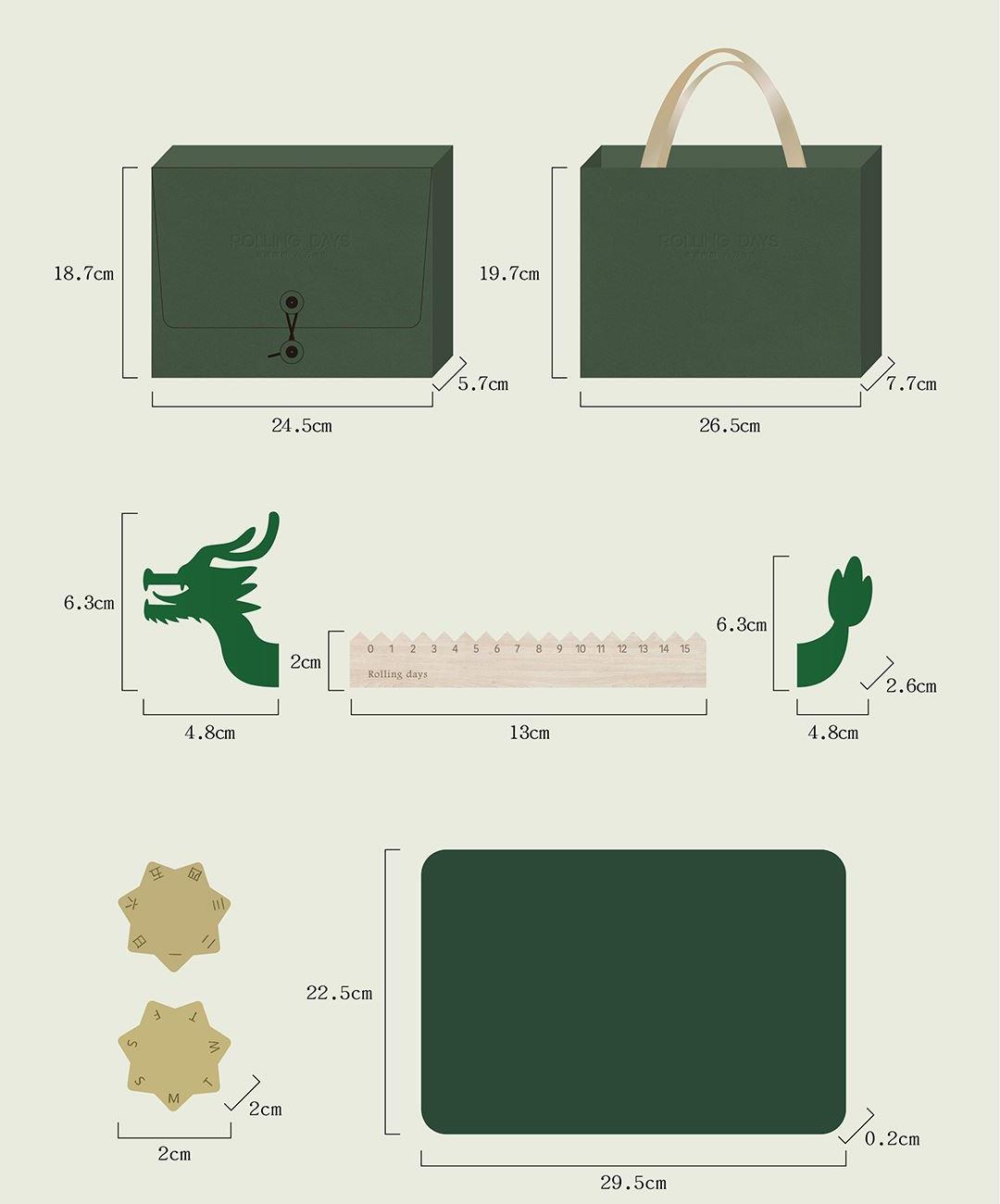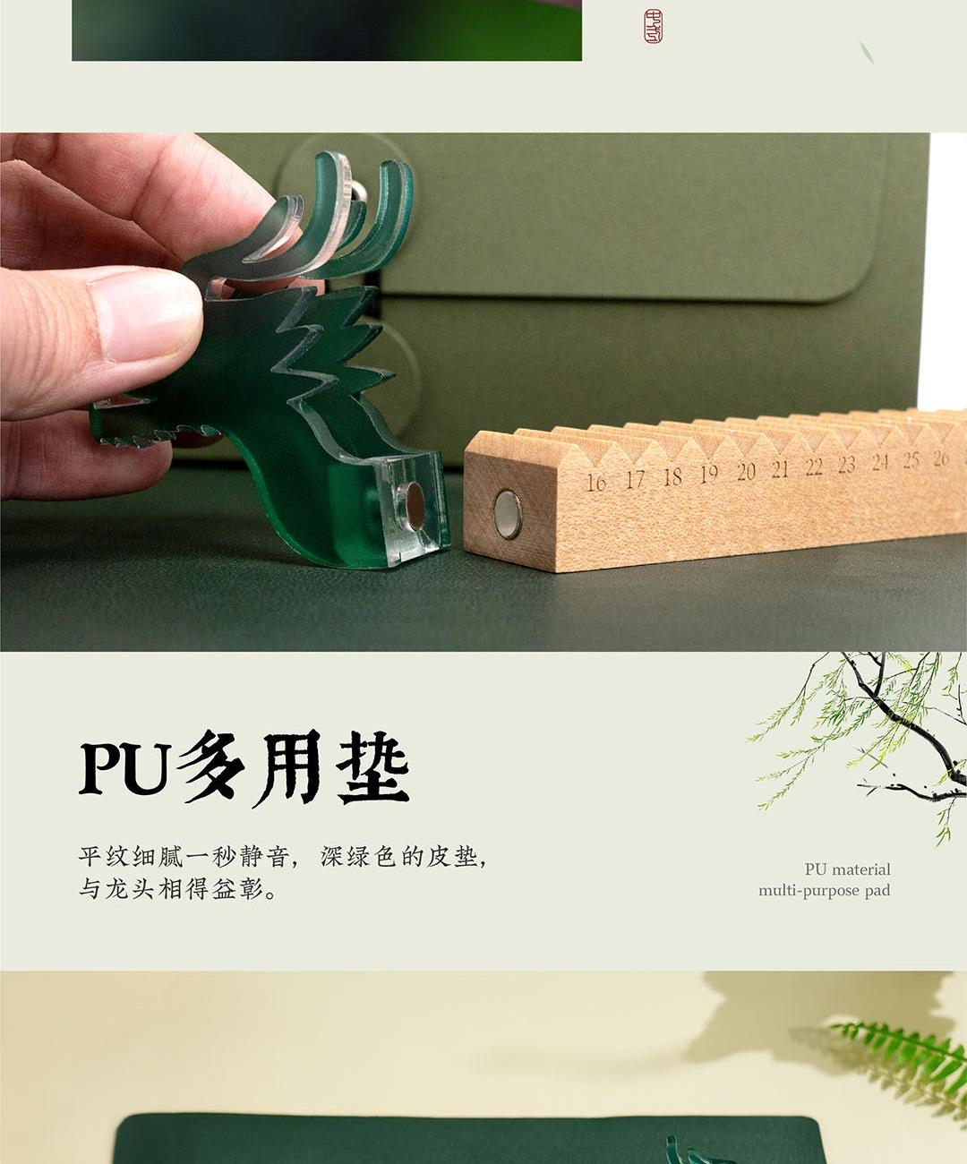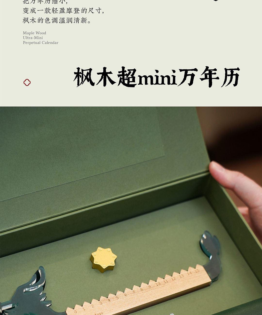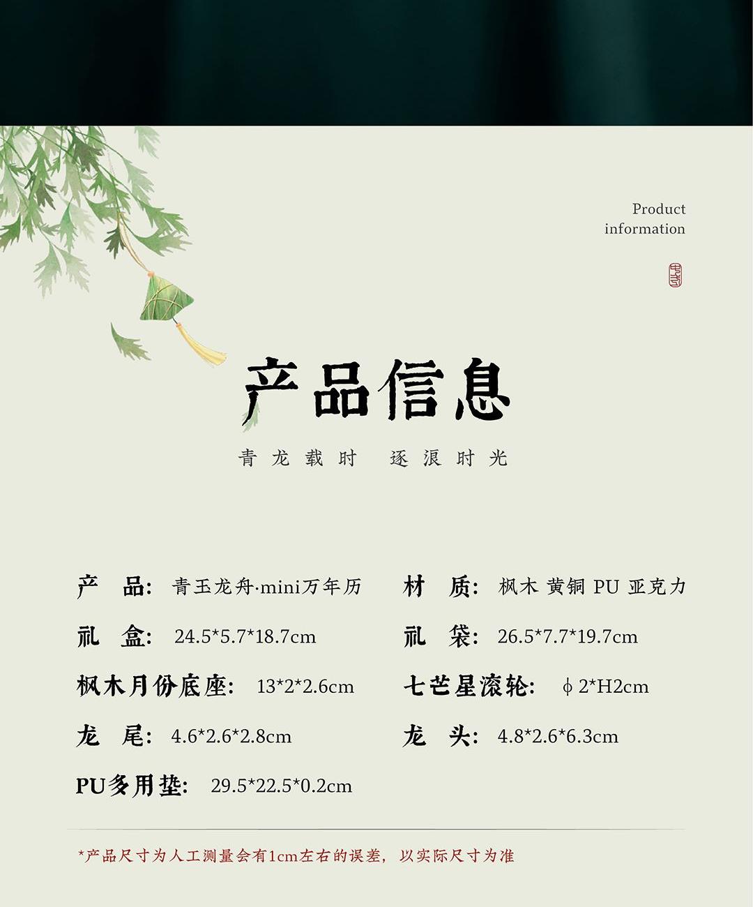 青玉龙舟,在端午的艾草清香中启航,感知时间的力量,滚过四季,竞渡时光。造型取意龙舟竞渡,清透亚克力雕琢的青龙首尾,蕴含驾驭风浪的磅礴力量。龙舟化作mini万年历,枫木精雕而成,以独特的滚轴设计承载时光流转。让时间的流逝宛如龙舟竞渡般从容而坚定。轻拨七芒星,如舟桨划过时间之流。不必翻页、不必撕纸,轻轻一拨,日子便如龙舟前行,静默而有力。 礼盒清单 1.枫木月份底座 2.七芒星滚轮 3.PU多用垫 4.龙头/龙尾 5.礼盒 6.礼袋