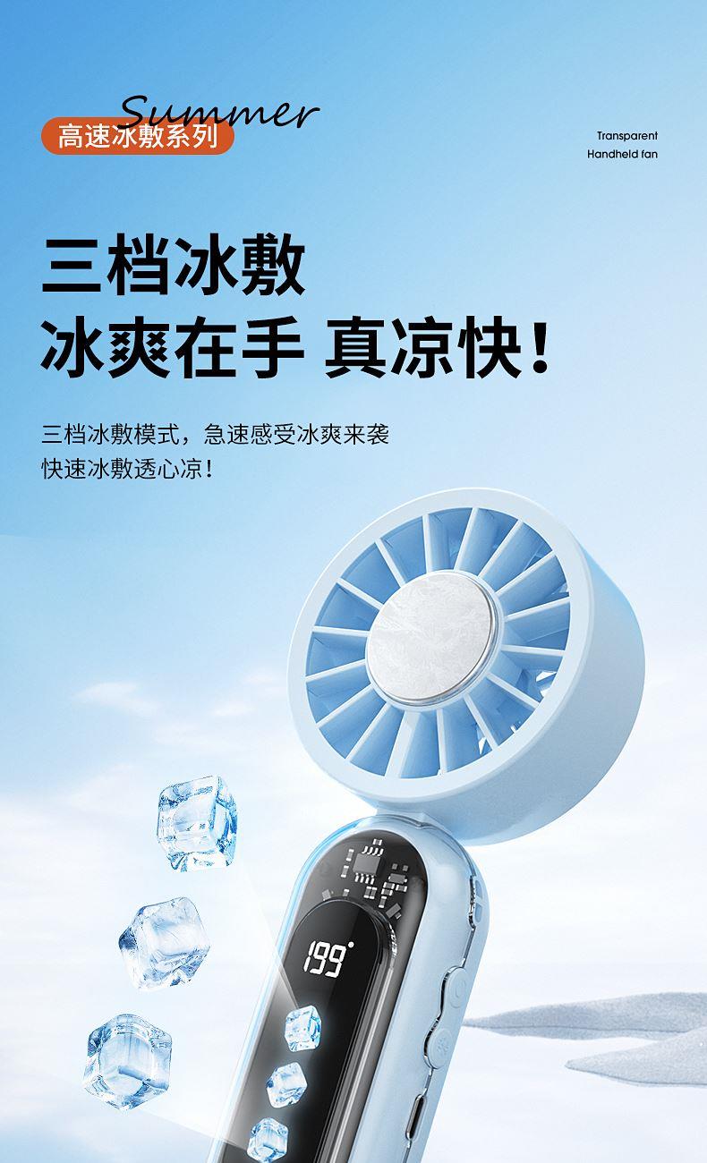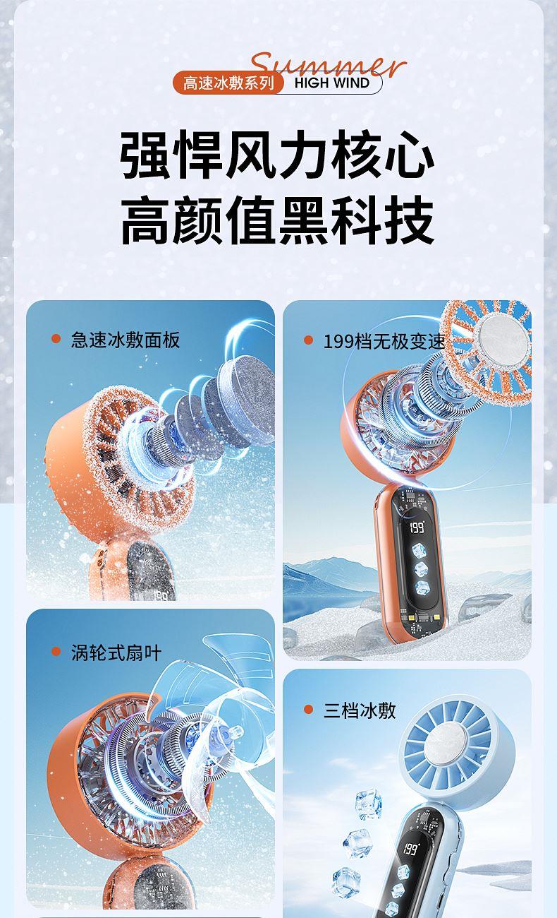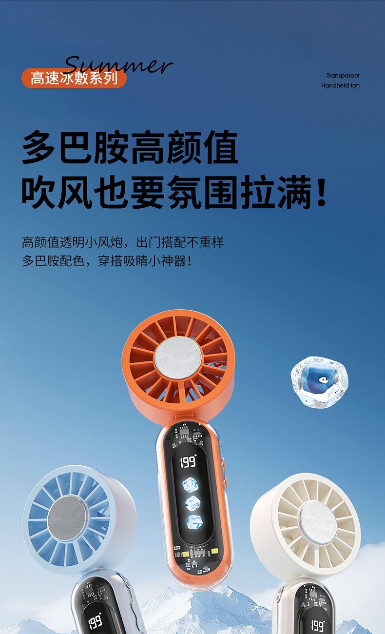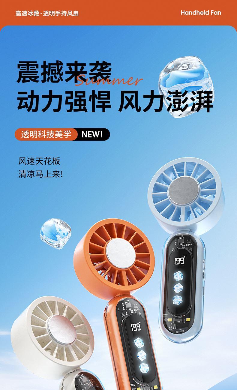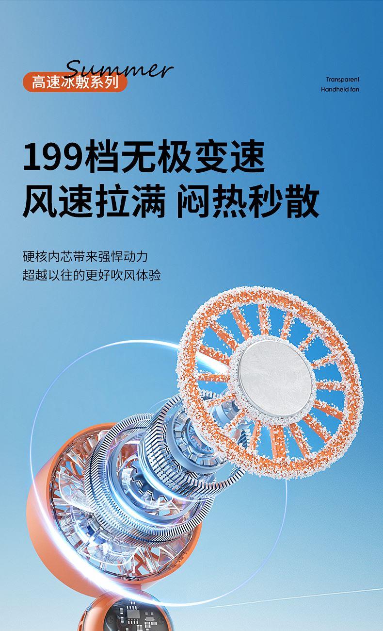 产品材质:ABS 产品功能:199档风力调节 产品容量:3000mAh 产品尺寸:60.7*60.9*171.9mm 产品颜色:米白色,蓝色,橙色 透明科技美学;199档风力调节,超大风力,为你的夏天带来丝丝清凉;半导体制冷,3档冷风选择,智能冰感屏,科技感十足,带来不一样的体验。
