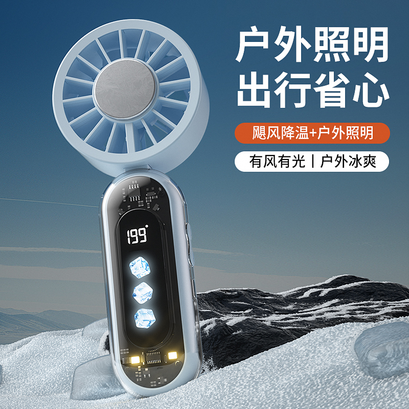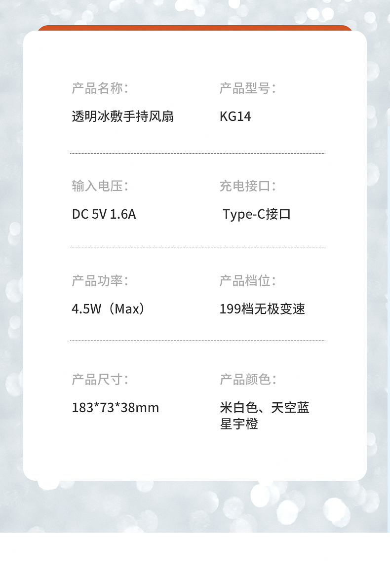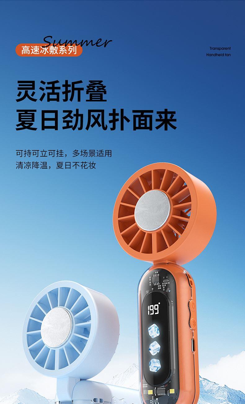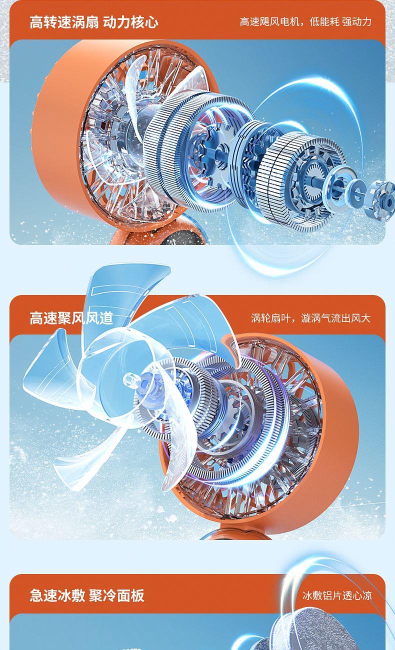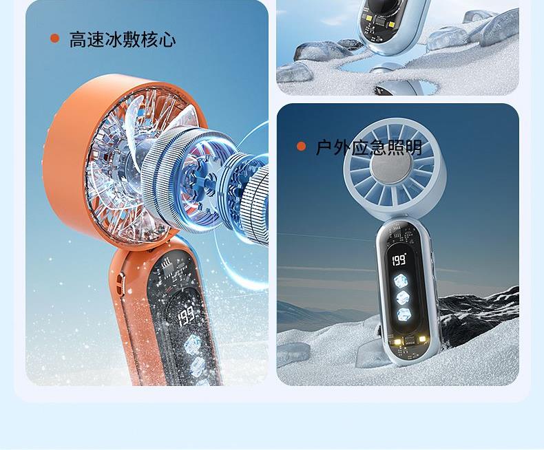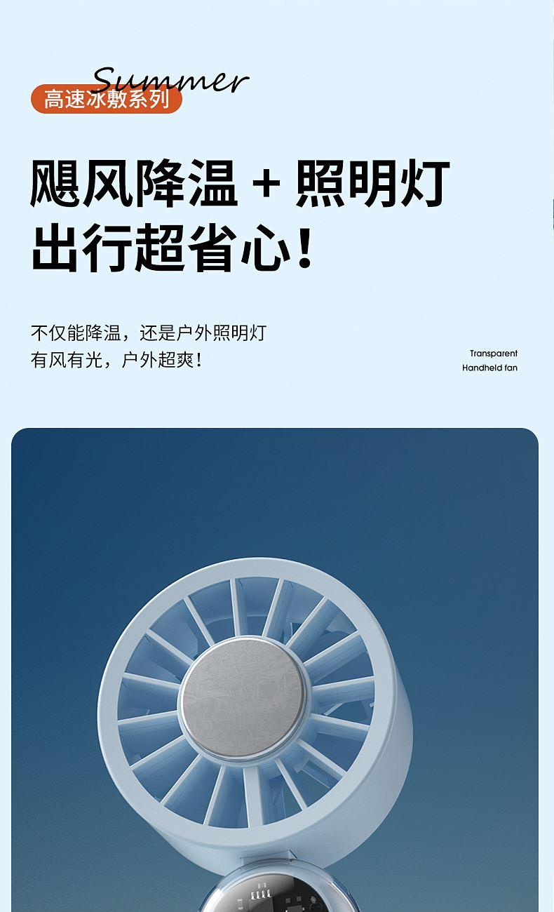 产品材质:ABS 产品功能:199档风力调节 产品容量:3000mAh 产品尺寸:60.7*60.9*171.9mm 产品颜色:米白色,蓝色,橙色 透明科技美学;199档风力调节,超大风力,为你的夏天带来丝丝清凉;半导体制冷,3档冷风选择,智能冰感屏,科技感十足,带来不一样的体验。