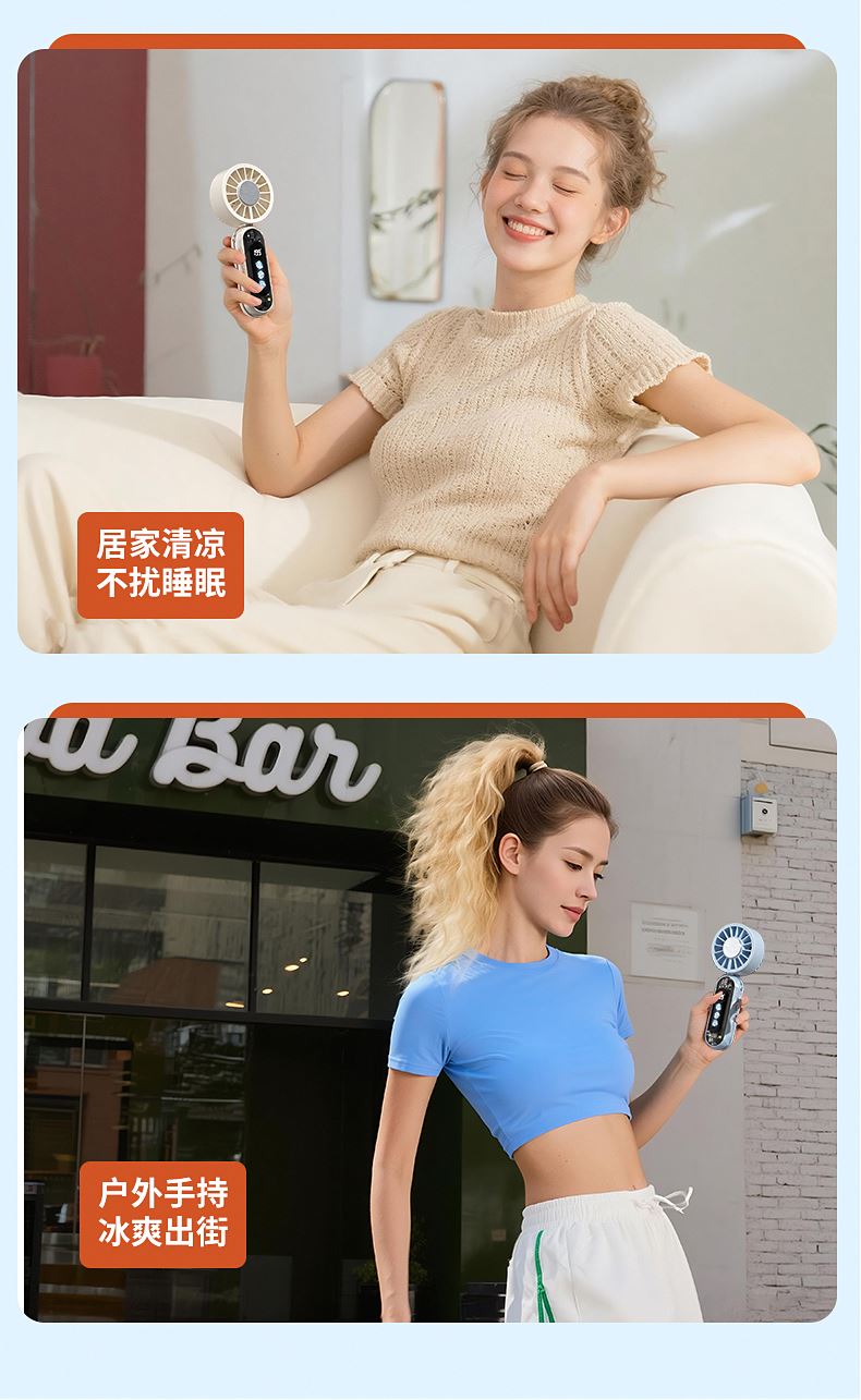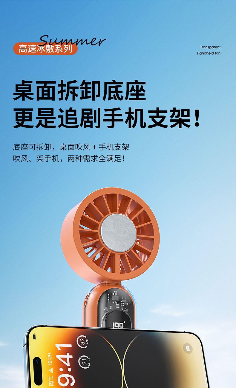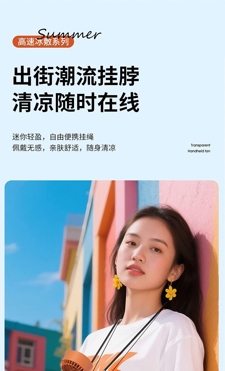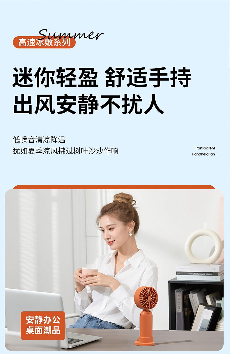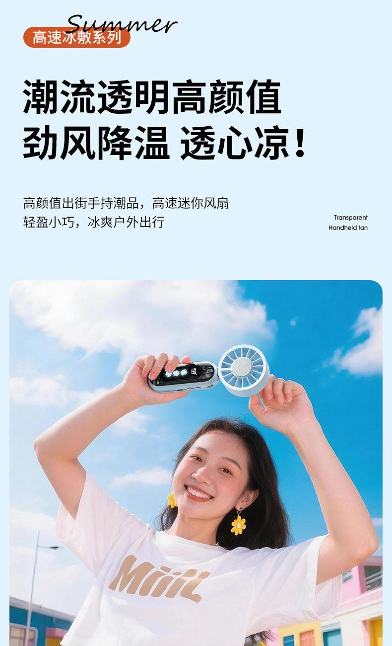 产品材质:ABS 产品功能:199档风力调节 产品容量:3000mAh 产品尺寸:60.7*60.9*171.9mm 产品颜色:米白色,蓝色,橙色 透明科技美学;199档风力调节,超大风力,为你的夏天带来丝丝清凉;半导体制冷,3档冷风选择,智能冰感屏,科技感十足,带来不一样的体验。