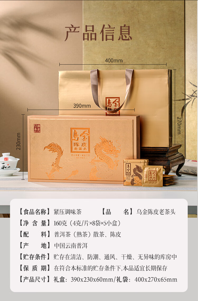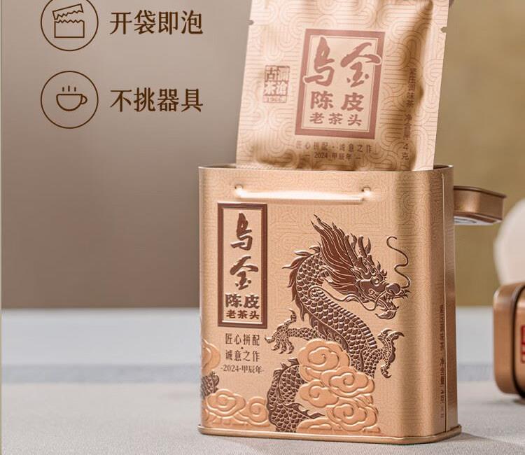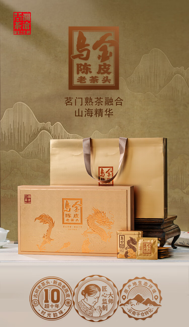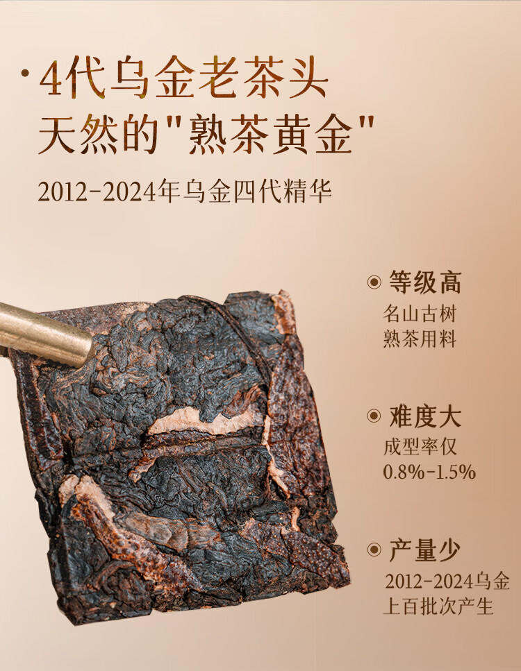 3、乌金陈皮老茶头,以澜沧古茶2012-2024四代“乌金”发酵过程中,上百个批次产生的老茶头为原料,加入2012年新会陈皮丝,精心调配而成;