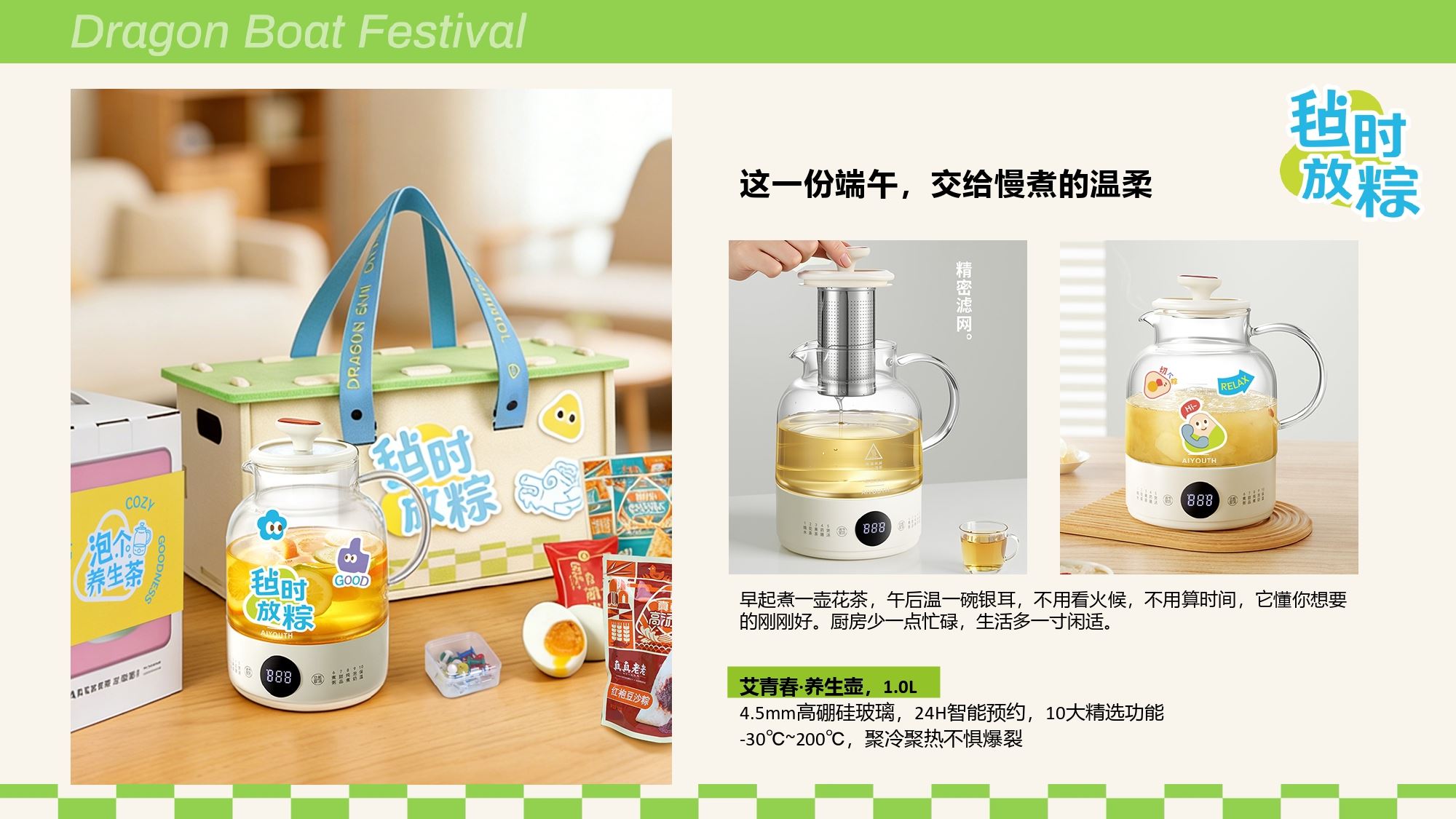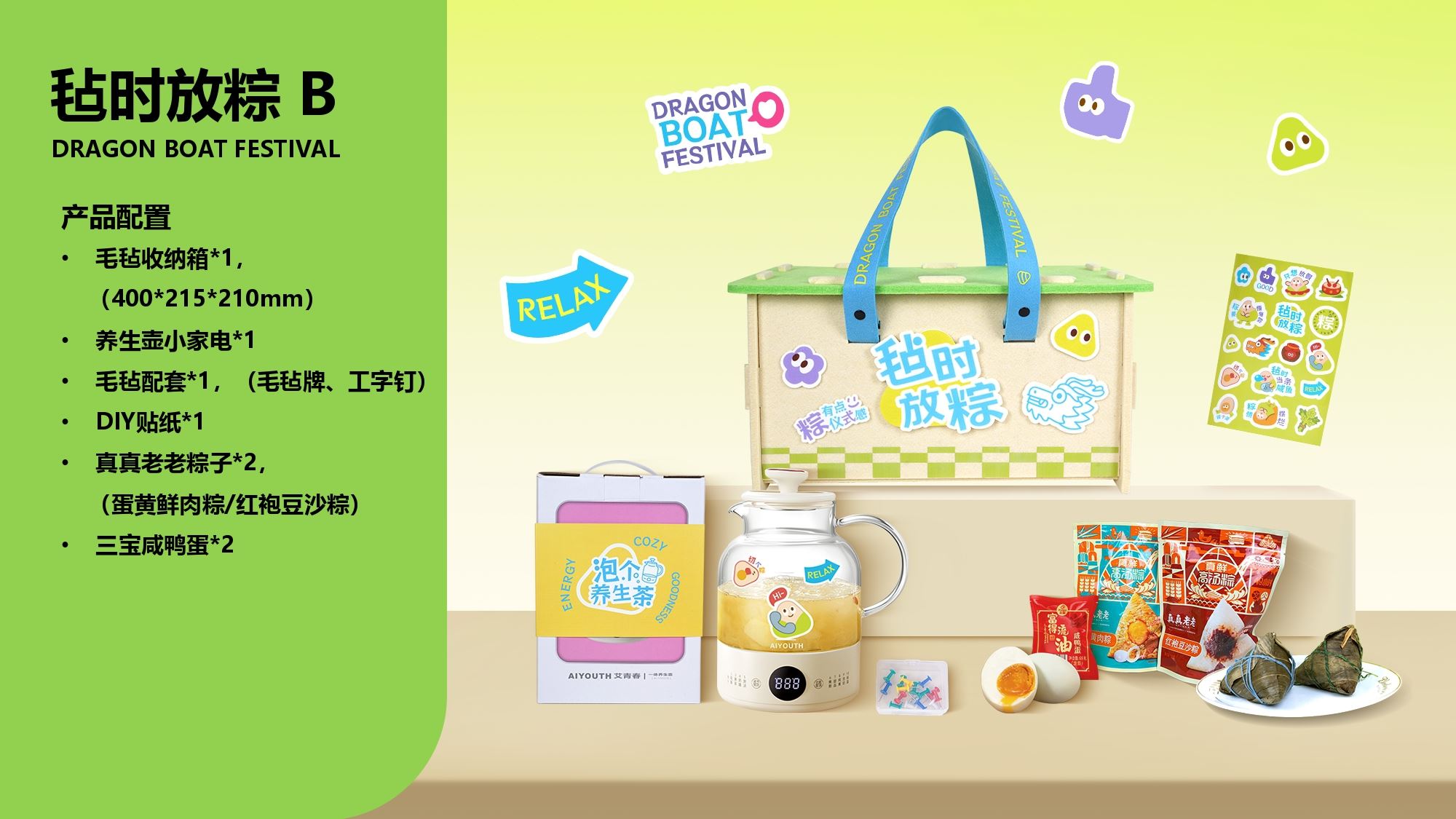 产品配置 毛毡收纳箱*1, (400*215*210mm) 养生壶小家电*1 毛毡配套*1,(毛毡牌、工字钉) DIY贴纸*1 真真老老粽子*2, (蛋黄鲜肉粽/红袍豆沙粽) 三宝咸鸭蛋*2