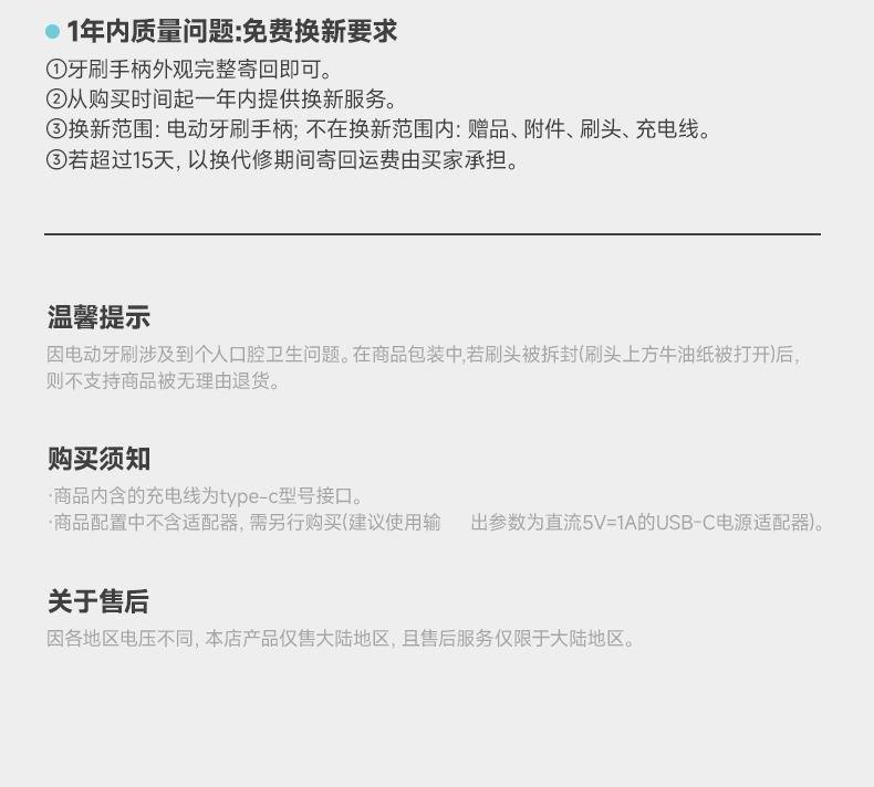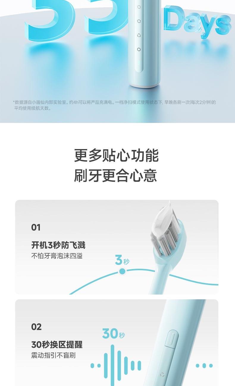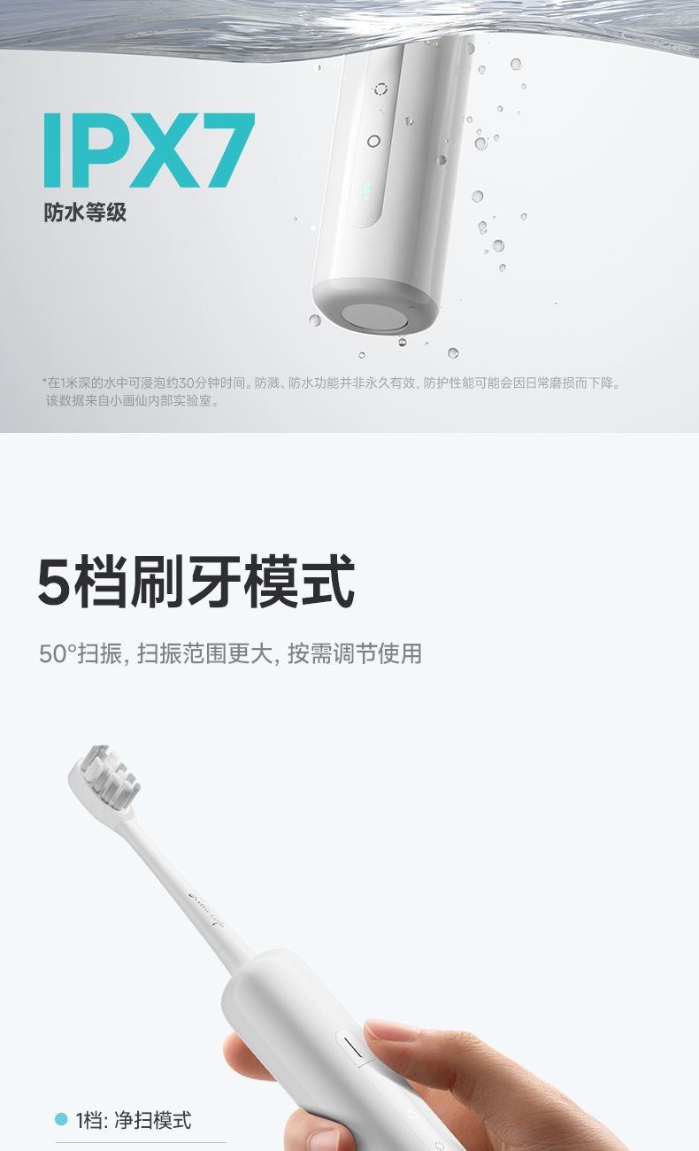 颜色:蓝色 额定工作电压:3.7V 功率:5W 电池容量:1200mAh 充电方式:Type-C 充电时间:2.4h 缓震牙刷头,食品级软胶,保护敏感口腔 五档模式切换,满足你的一切需求; IPX7专业级防水,洗浴场景随心切换; 35天超长续航,type-c充电,旅游出差无忧携带; IPX7级防水,可机身冲洗。