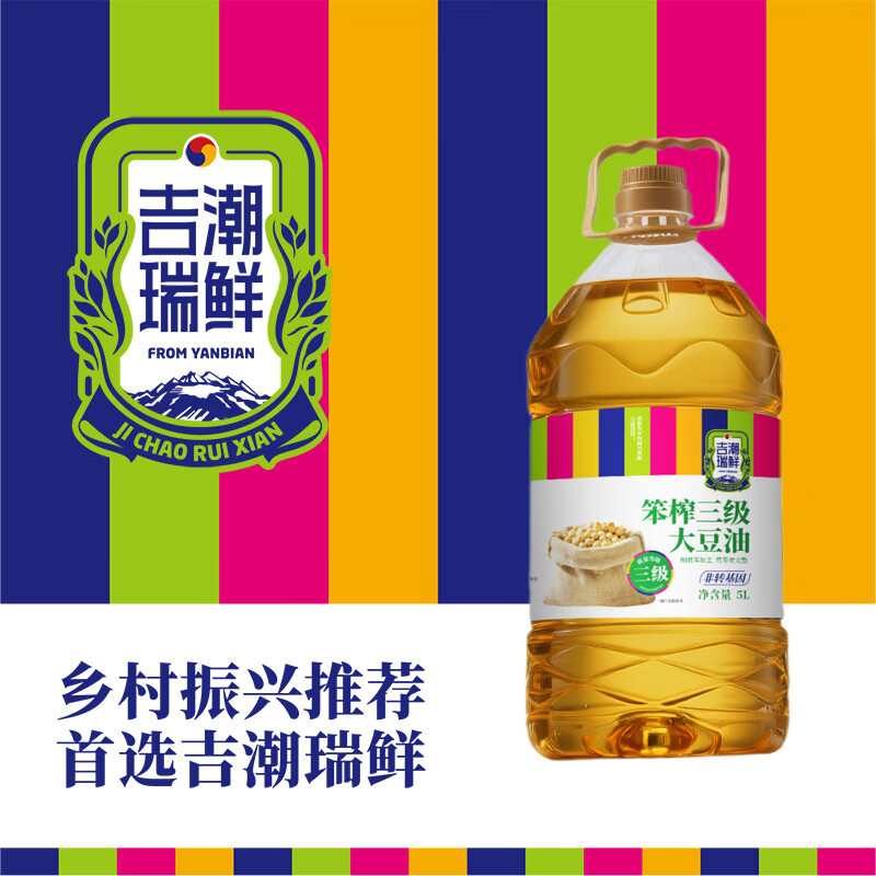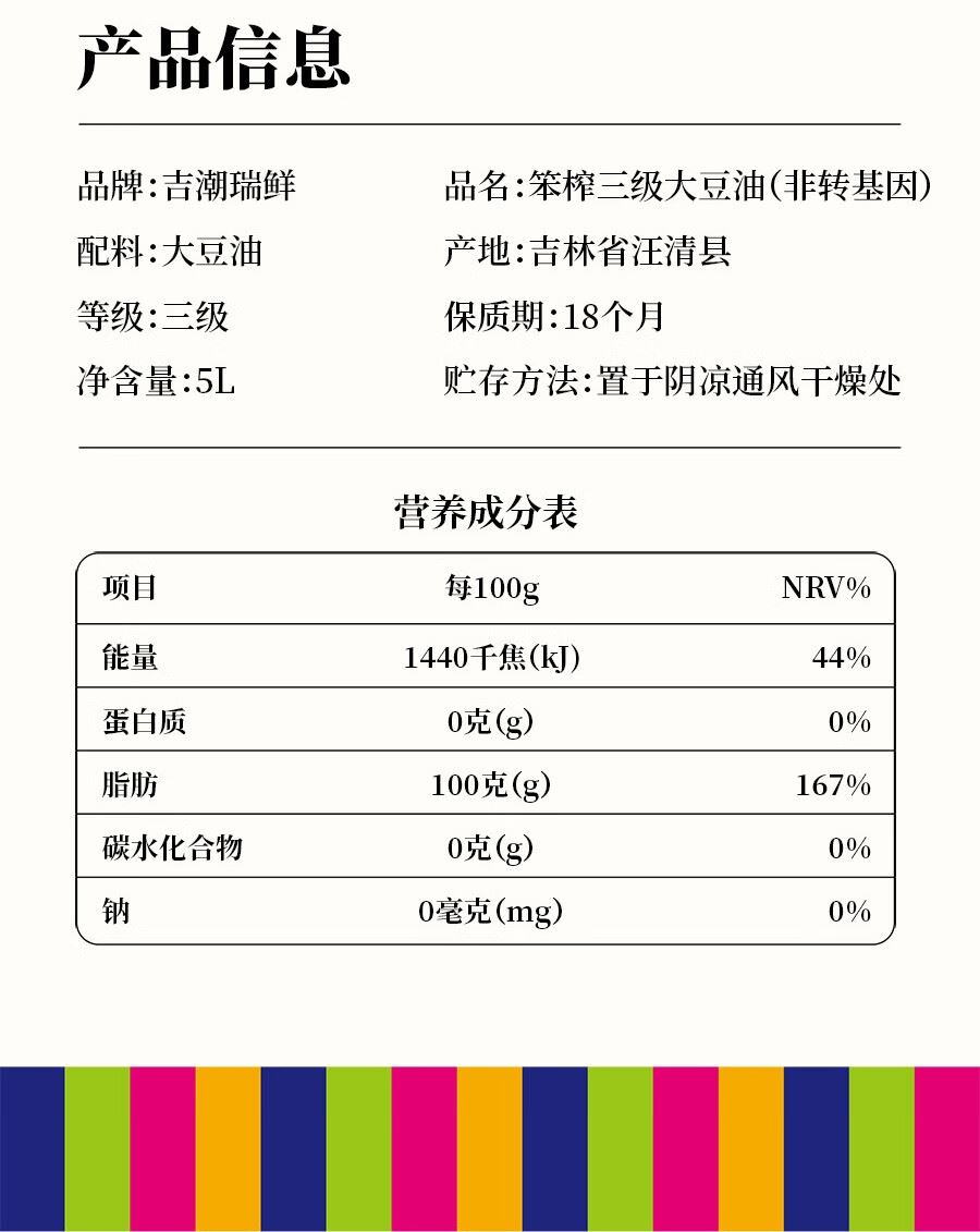 吉潮瑞鲜笨榨三级大豆油(非转基)5L 配料:大豆油 等级:三级 净含量:5L 产地:吉林省汪清县 保质期:18个月 贮存方法:置于阴凉通风干燥处