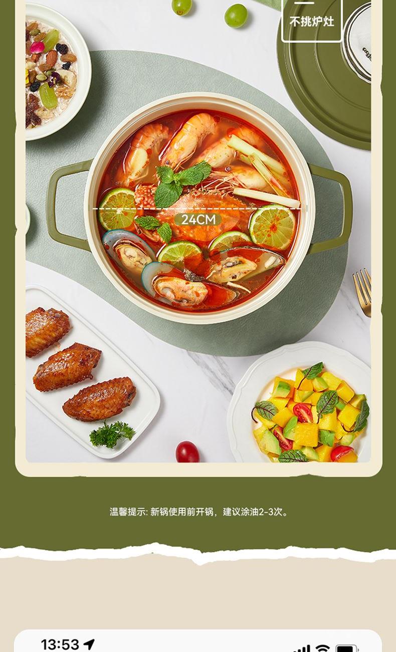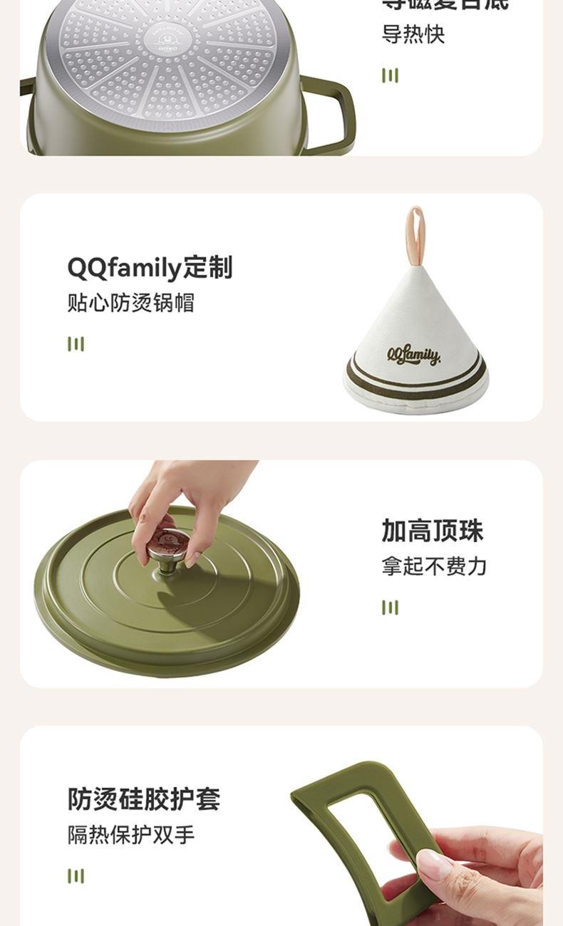 产品参数:24cm (内径24cm,外径25.2cm) 欧式锅身设计,陶瓷质感、层次鲜明; 内陶瓷不粘,外珐琅彩,美观易清洁,时尚体验两不误; 加厚锅底,好锅不挑灶,电磁炉、燃气灶、电陶炉均能应用; 自带硅胶护套,隔热保护双手; 产品符合卫生标准的不粘工艺以及食品标准,健康安全; 功能性与舒适性,美观与实用结合,满足您的多种烹饪需求。 配备创意式三角防烫锅帽、木浆清洁棉,给您的好的安全保障, 清洗更省事省力,更添加厨房美感。