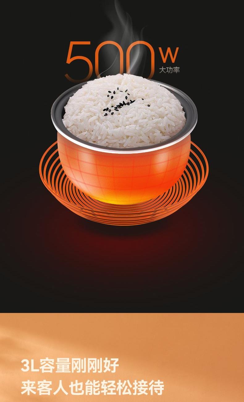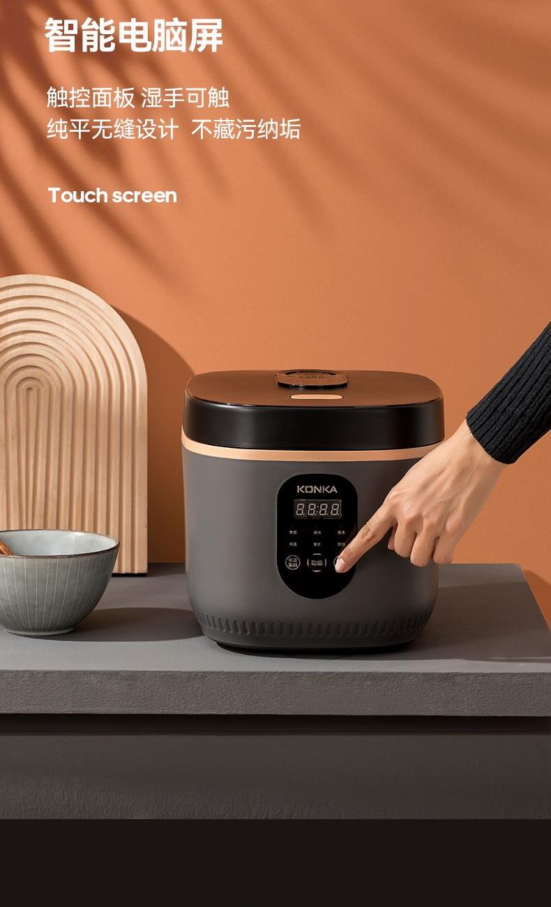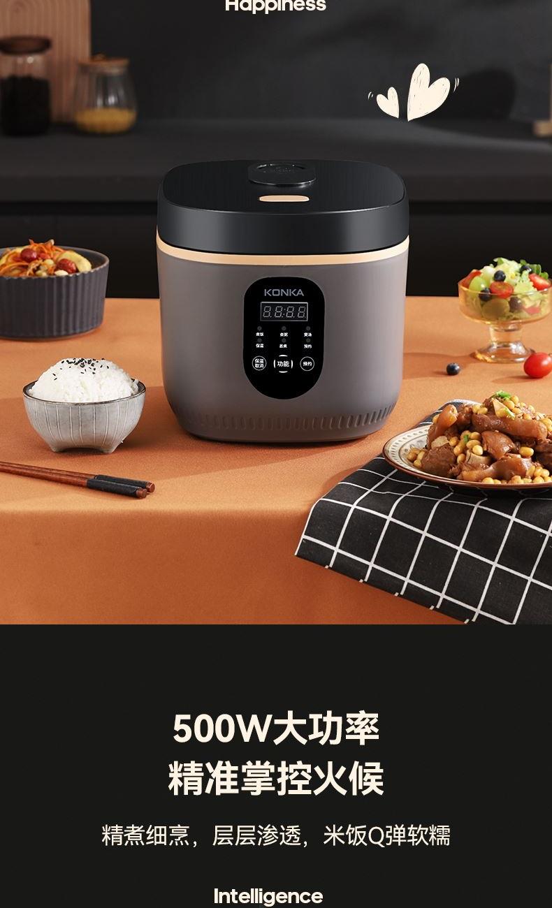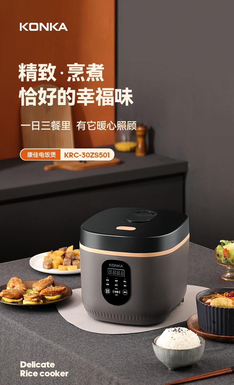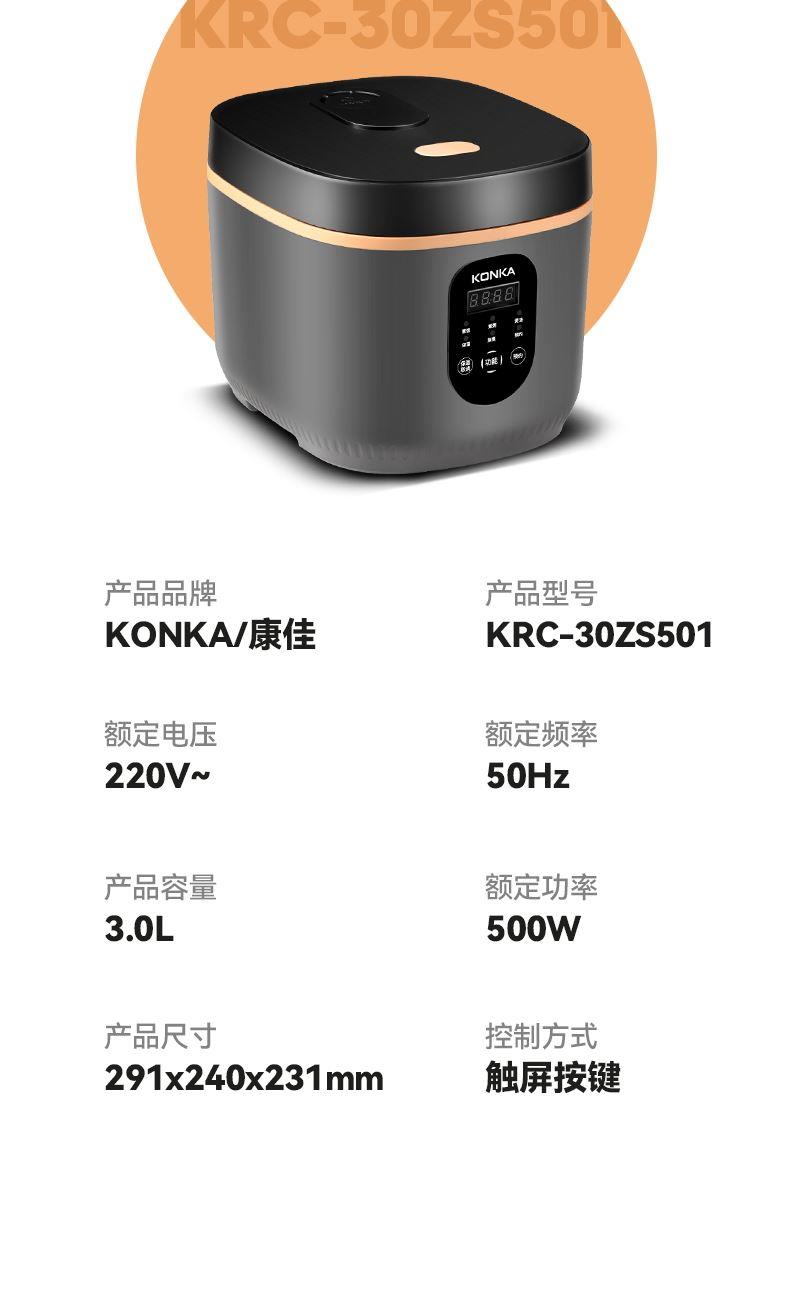 产品型号:KRC-30ZS501 额定电压:220V~ 额定频率:50Hz 产品容量:3.0L 额定功率:500W 产品尺寸:291x240x231mm 控制方式:触屏按键 1.满足2-5人饭量;约30分钟,快速煮出美味米饭,360°环绕加热,锁住水分与香气 2.熬汤、炖品、煮粥、蛋糕样样拿手,轻松承包全家美味 3.操作简单,老人也能使用 4.食品级不粘内胆,不糊底,热传递更快