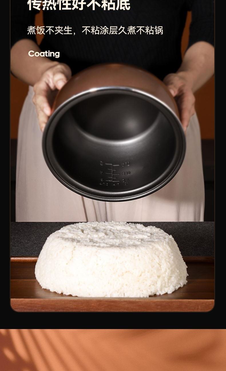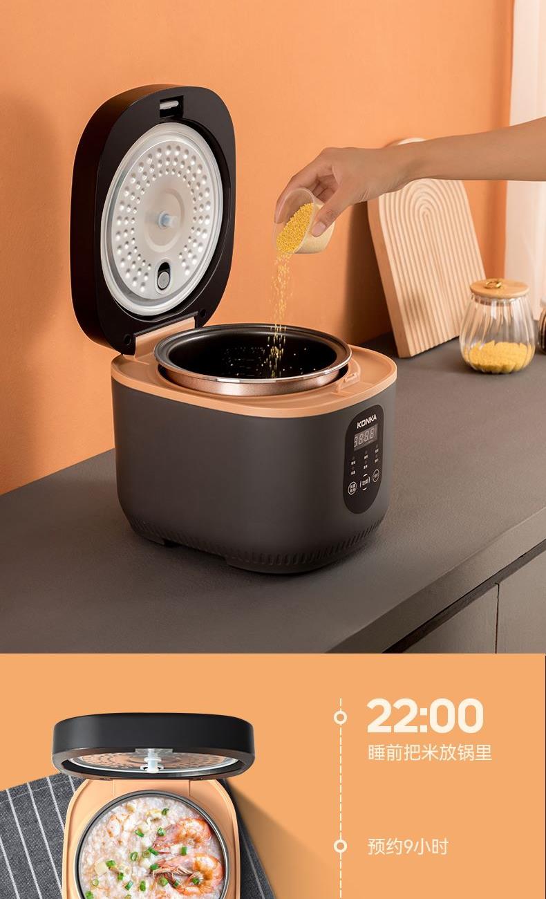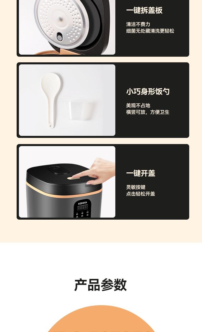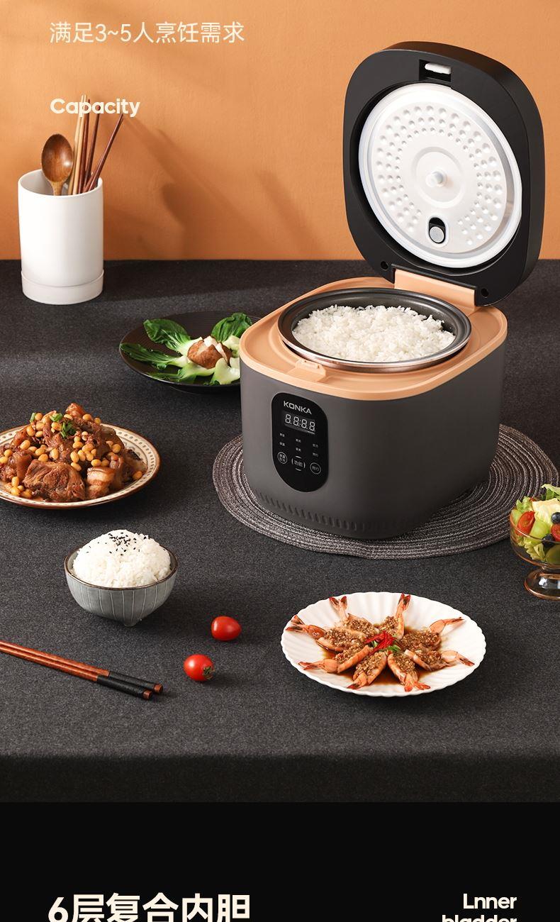 产品型号:KRC-30ZS501 额定电压:220V~ 额定频率:50Hz 产品容量:3.0L 额定功率:500W 产品尺寸:291x240x231mm 控制方式:触屏按键 1.满足2-5人饭量;约30分钟,快速煮出美味米饭,360°环绕加热,锁住水分与香气 2.熬汤、炖品、煮粥、蛋糕样样拿手,轻松承包全家美味 3.操作简单,老人也能使用 4.食品级不粘内胆,不糊底,热传递更快