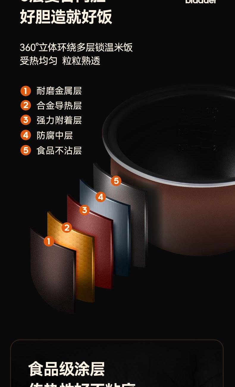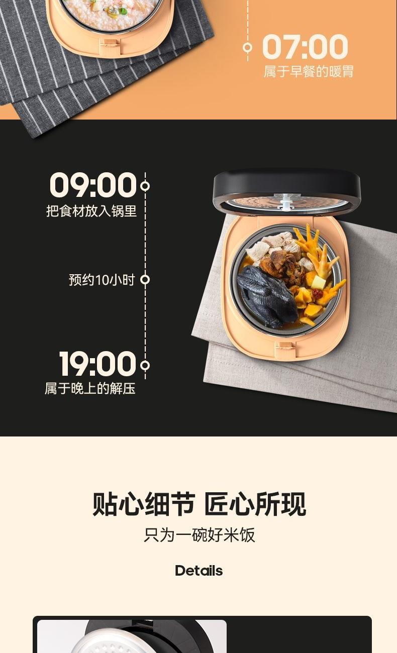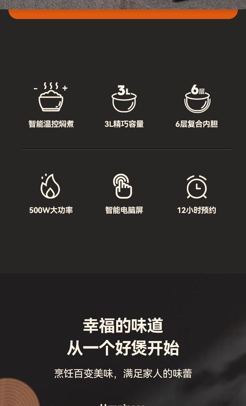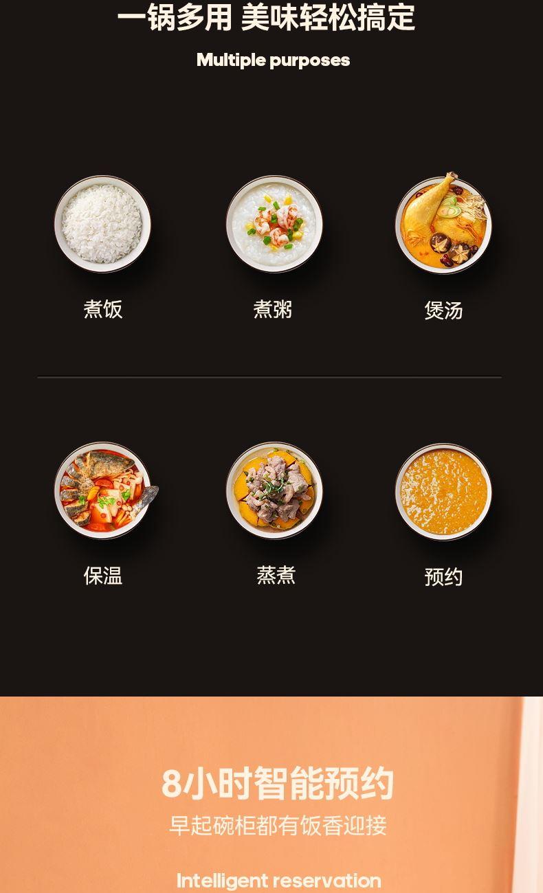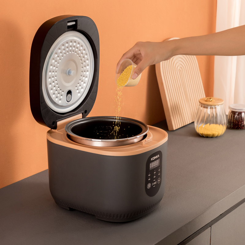 产品型号:KRC-30ZS501 额定电压:220V~ 额定频率:50Hz 产品容量:3.0L 额定功率:500W 产品尺寸:291x240x231mm 控制方式:触屏按键 1.满足2-5人饭量;约30分钟,快速煮出美味米饭,360°环绕加热,锁住水分与香气 2.熬汤、炖品、煮粥、蛋糕样样拿手,轻松承包全家美味 3.操作简单,老人也能使用 4.食品级不粘内胆,不糊底,热传递更快